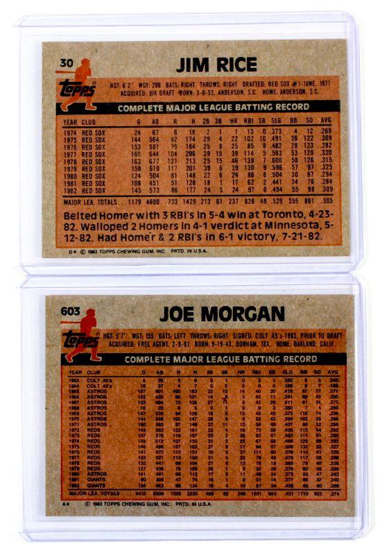1983 Topps #30 JIM RICE #603 JOE MORGAN Baseball Cards Set - High Grade
