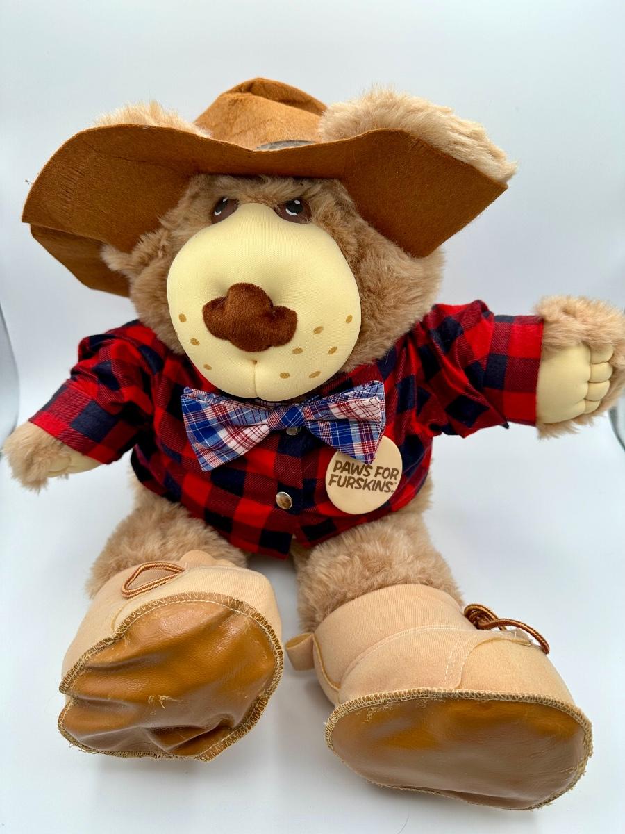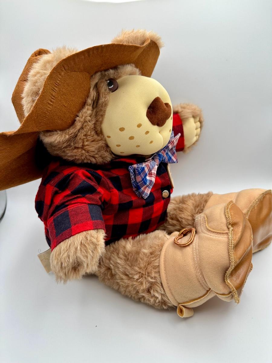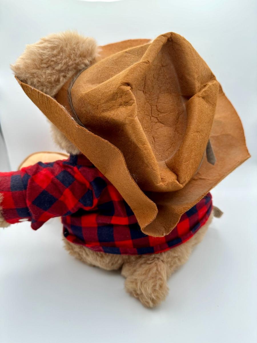 Sweet Farrell is in good condition, painted freckles and painted button eyes, all puckered stitching intact (fingers, toes and belly button). Plaid shirt and bow tie, felt hat (a little smooshed) boots (missing bottom sole) see pictures. 22” tall.