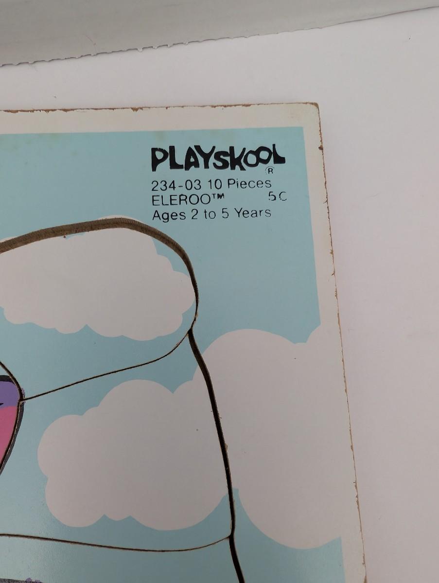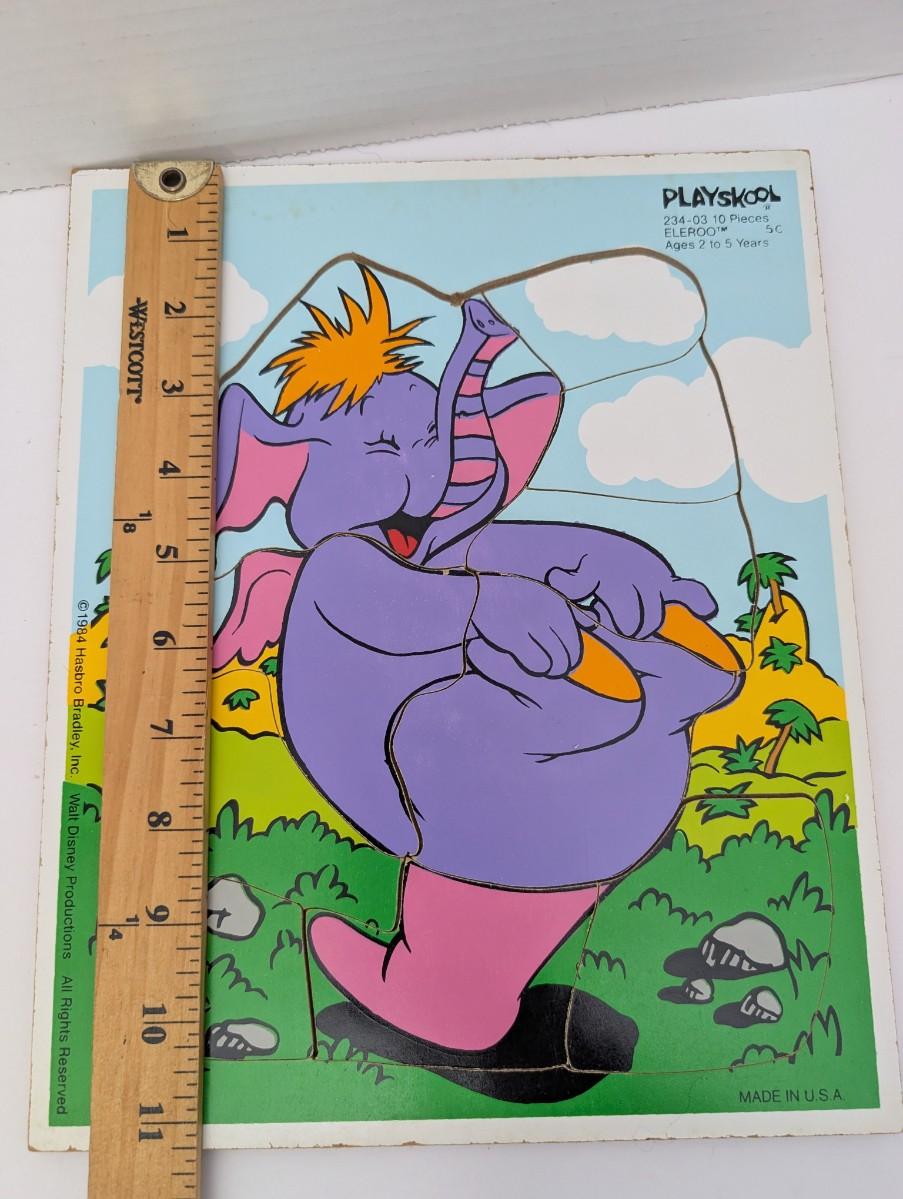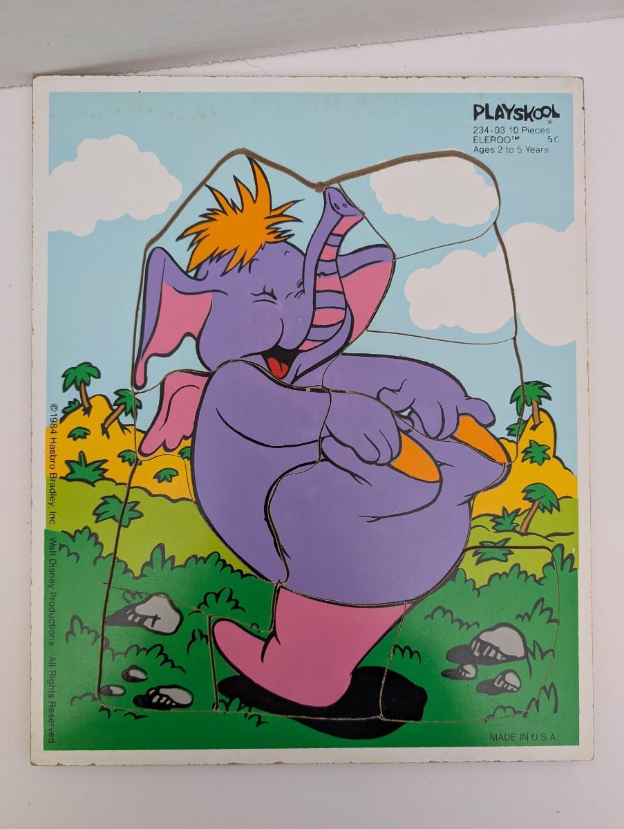 Vintage 1984 Playskool wooden puzzle featuring Eleroo, the purple elephant character from Walt Disney Productions’ Winnie the Pooh universe. Puzzle includes 10 interlocking pieces designed for ages 2 to 5. Marked “234-03” and “Made in U.S.A.” along the edge. Manufactured by Hasbro Bradley, Inc.