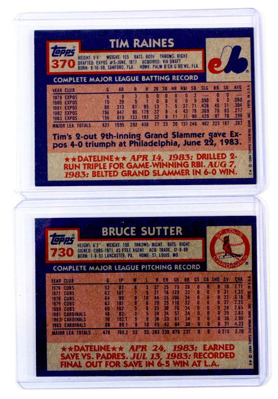 1984 Topps #370 TIM RAINES #730 BRUCE SUTTER Baseball Cards Set - High Grade
