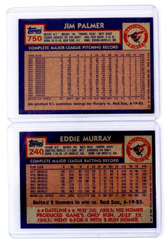 1984 Topps #750 JIM PALMER #240 EDDIE MURRAY Baseball Cards Set - High Grade