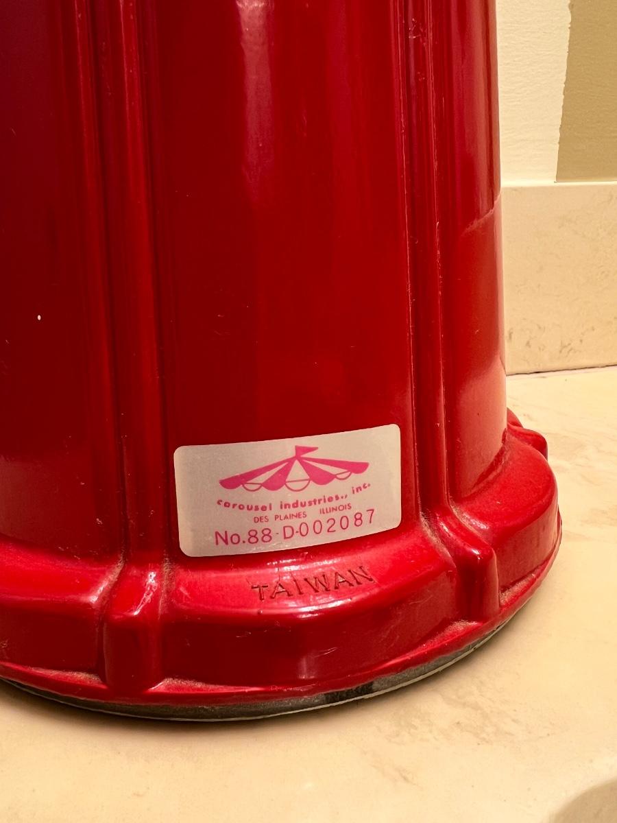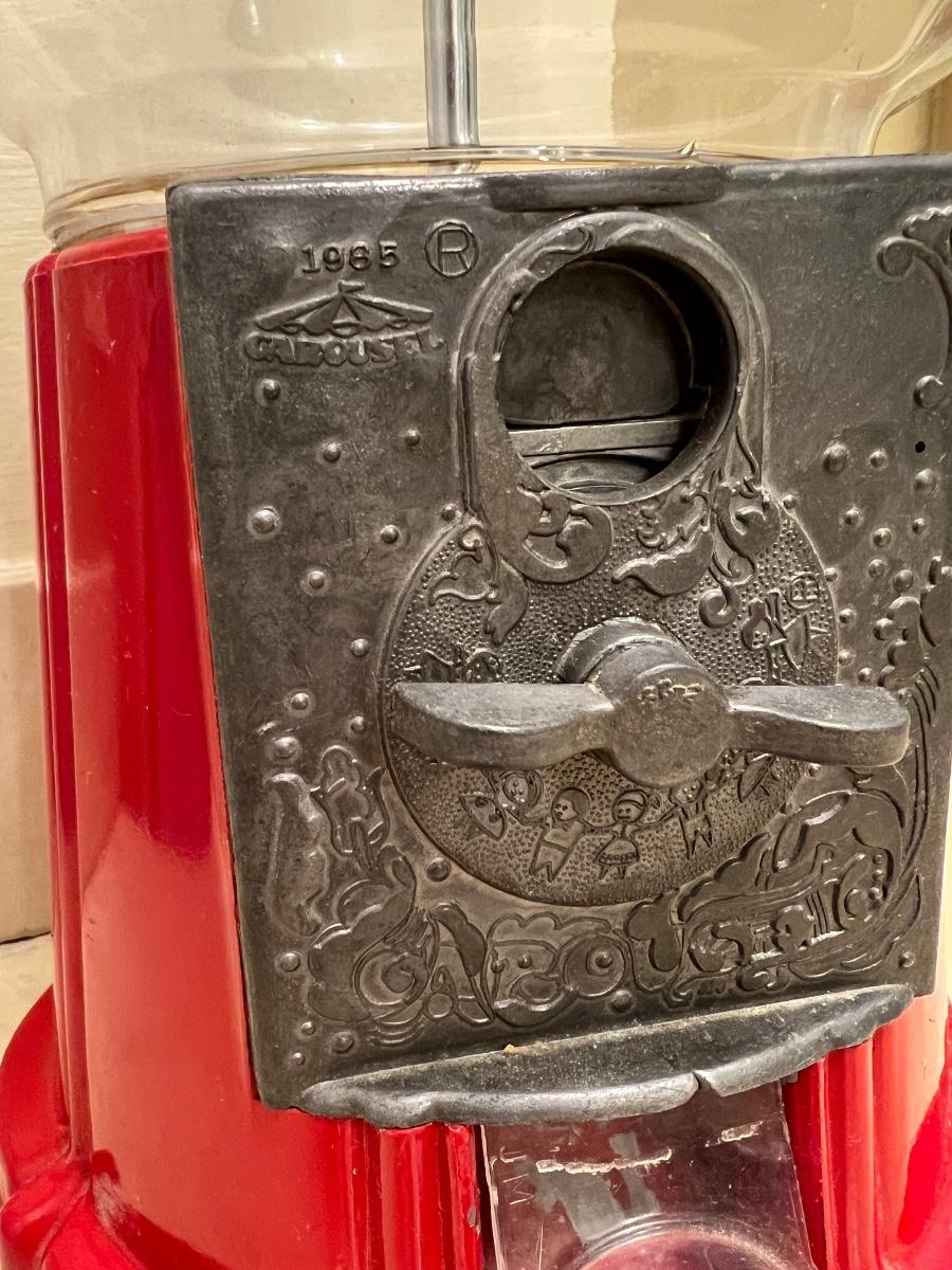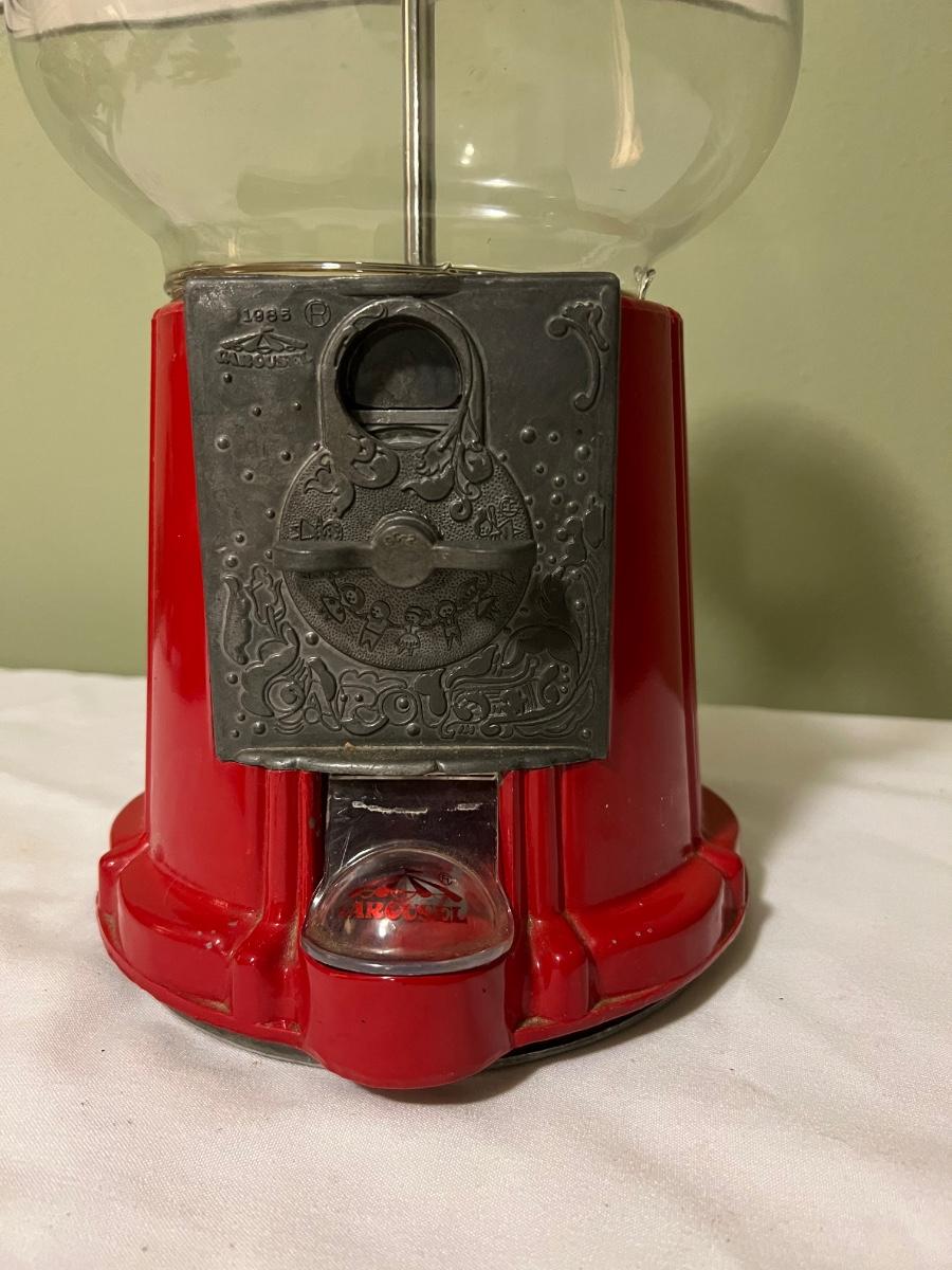 1985 Carousel Bubble Gum Machine, globe is glass, bottom is metal, top unscrews for easy refilling, made in Taiwan. Measures 15 inches tall 9 inches deep, 6 inches wide