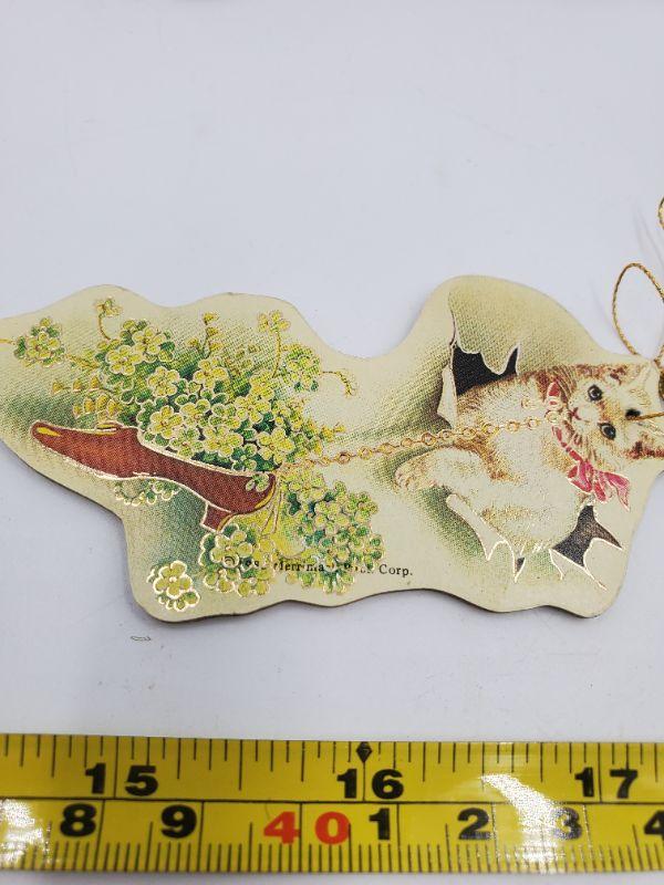 Adorable cardboard 1985 Merrimack Kitty Cucumber ornaments. One is missing the string, otherwise good condition