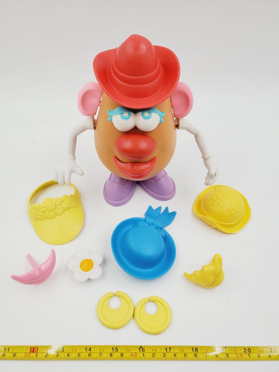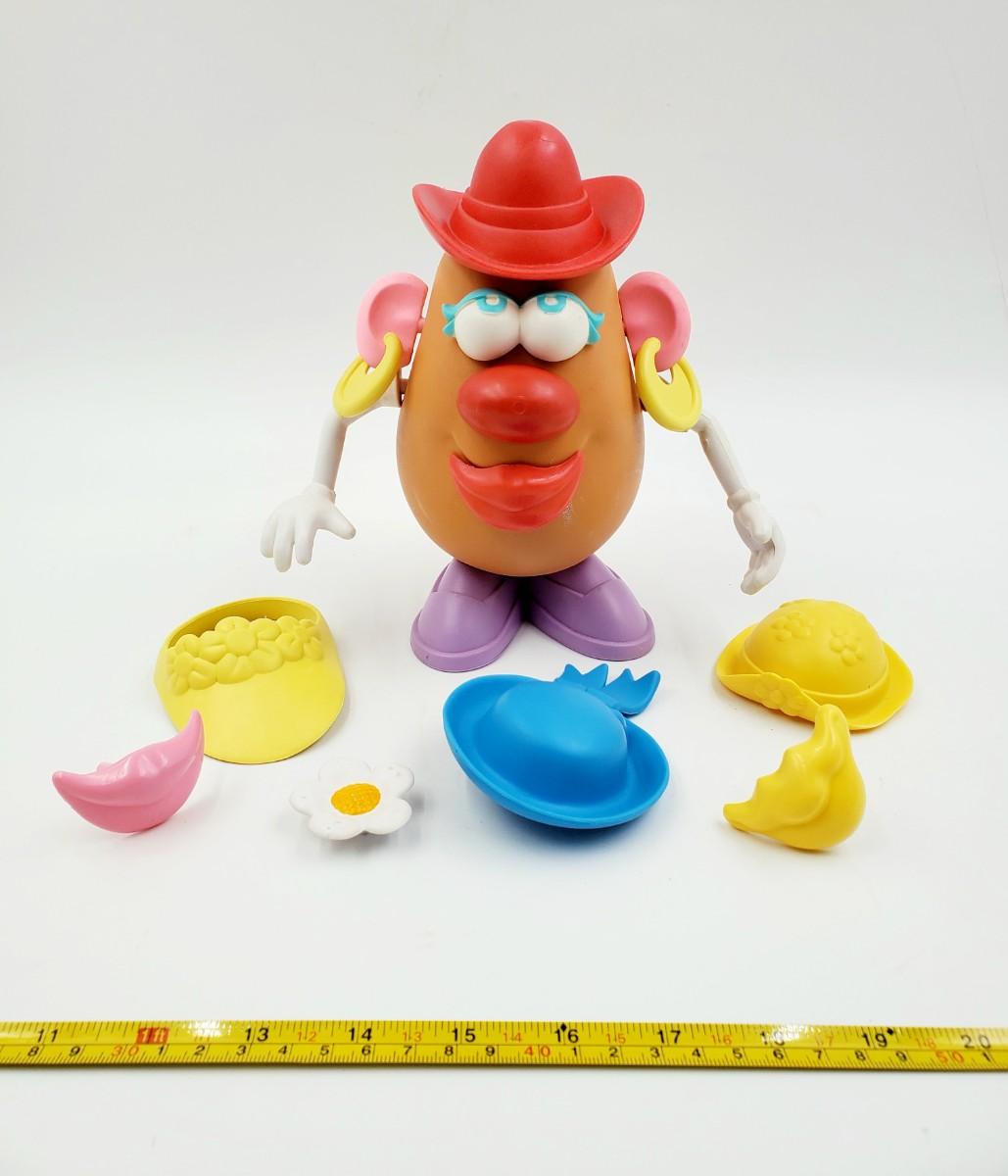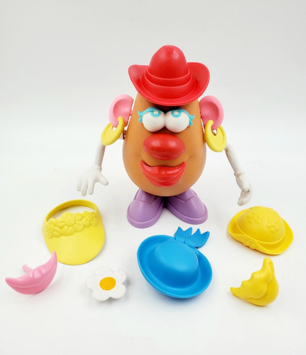 1985 Playskool Mrs. Potatoe Head with all her glorious accessories...2 ears, 3 mouths, 1 nose, 4 hats, set of purple shoes, earrings and a flower. This set has been played with and may show signs of such but still in good condition.