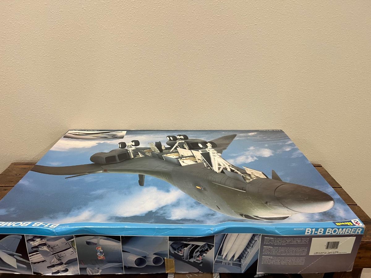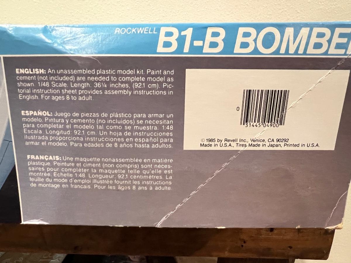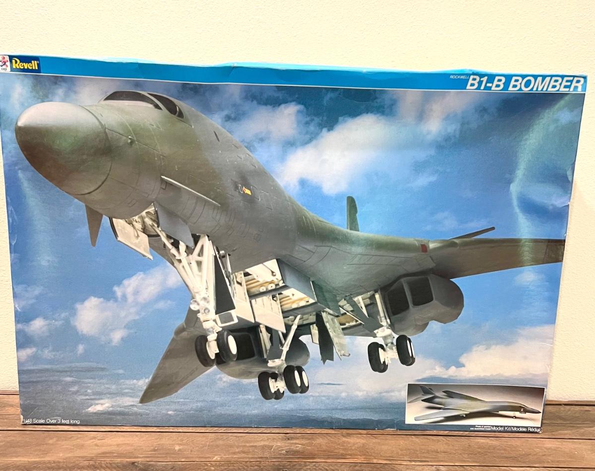 Revel 1:48 Rockwell B1-B Bomber Plastic Aircraft Kit 1985 with Box. Owner states all pieces are there. The inside appears to be sealed and instructions included. Over 3 feet long when assembled.
