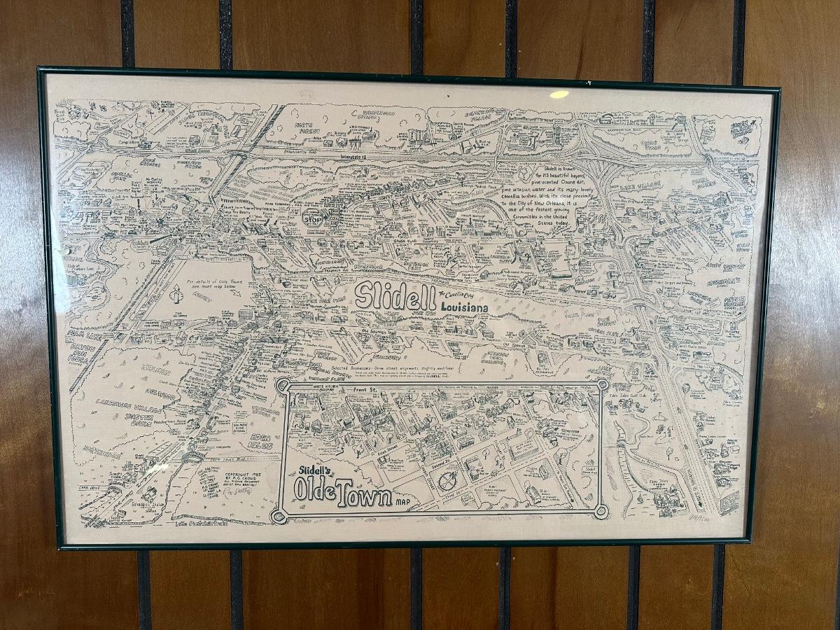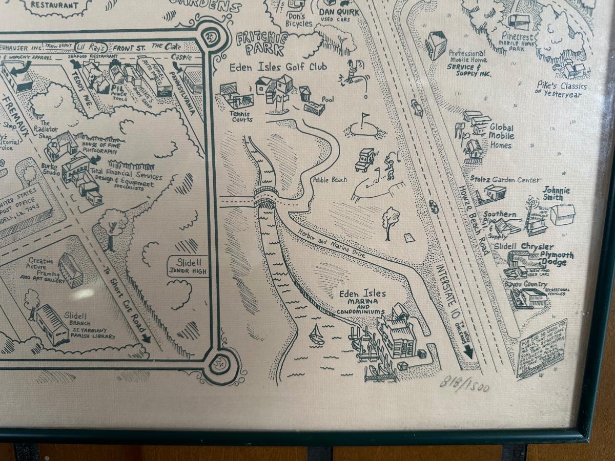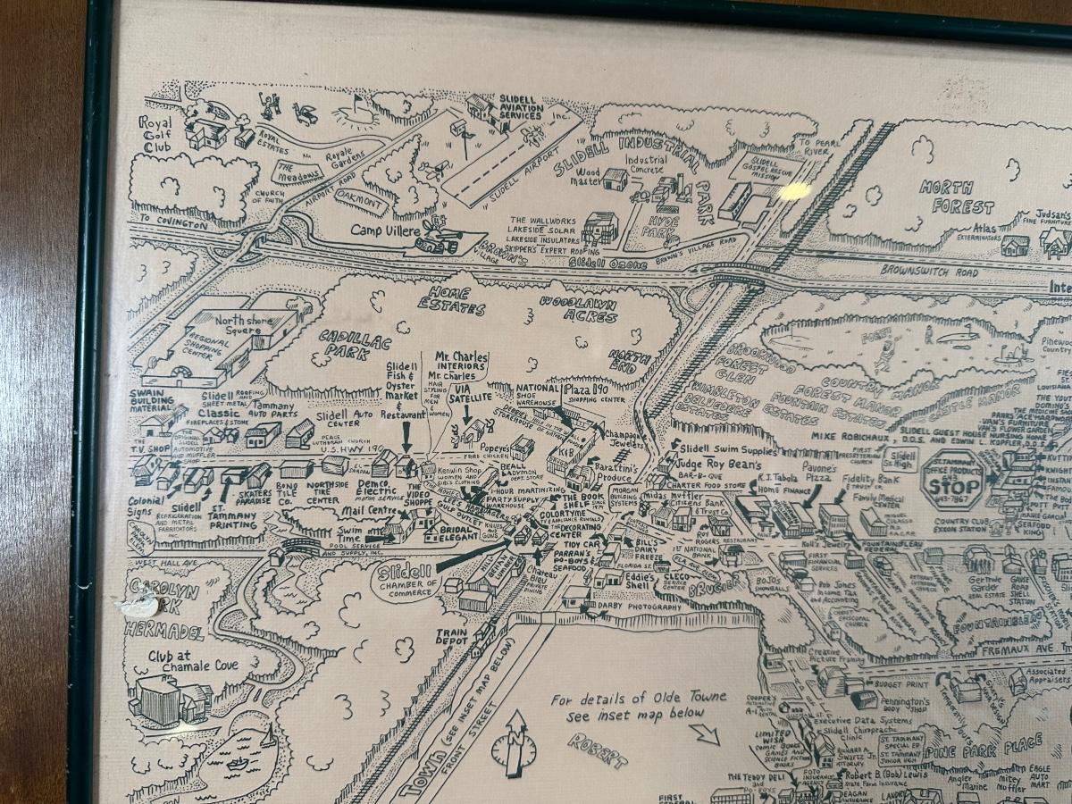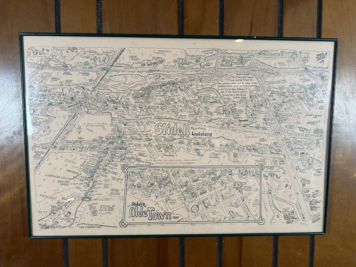 1985 Slidell, Louisiana Illustrated Map – Olde Towne – Framed & Signed