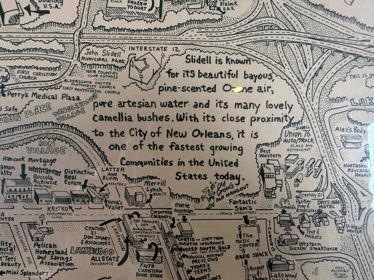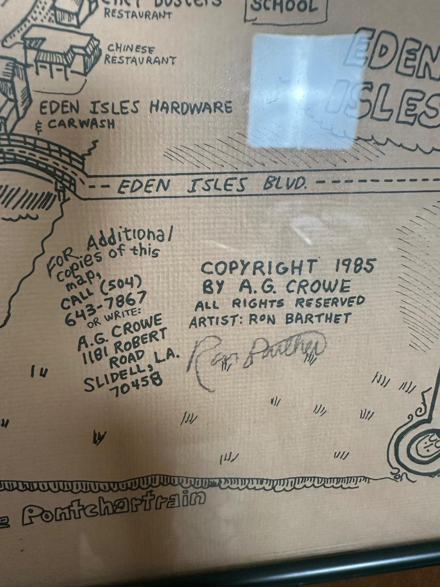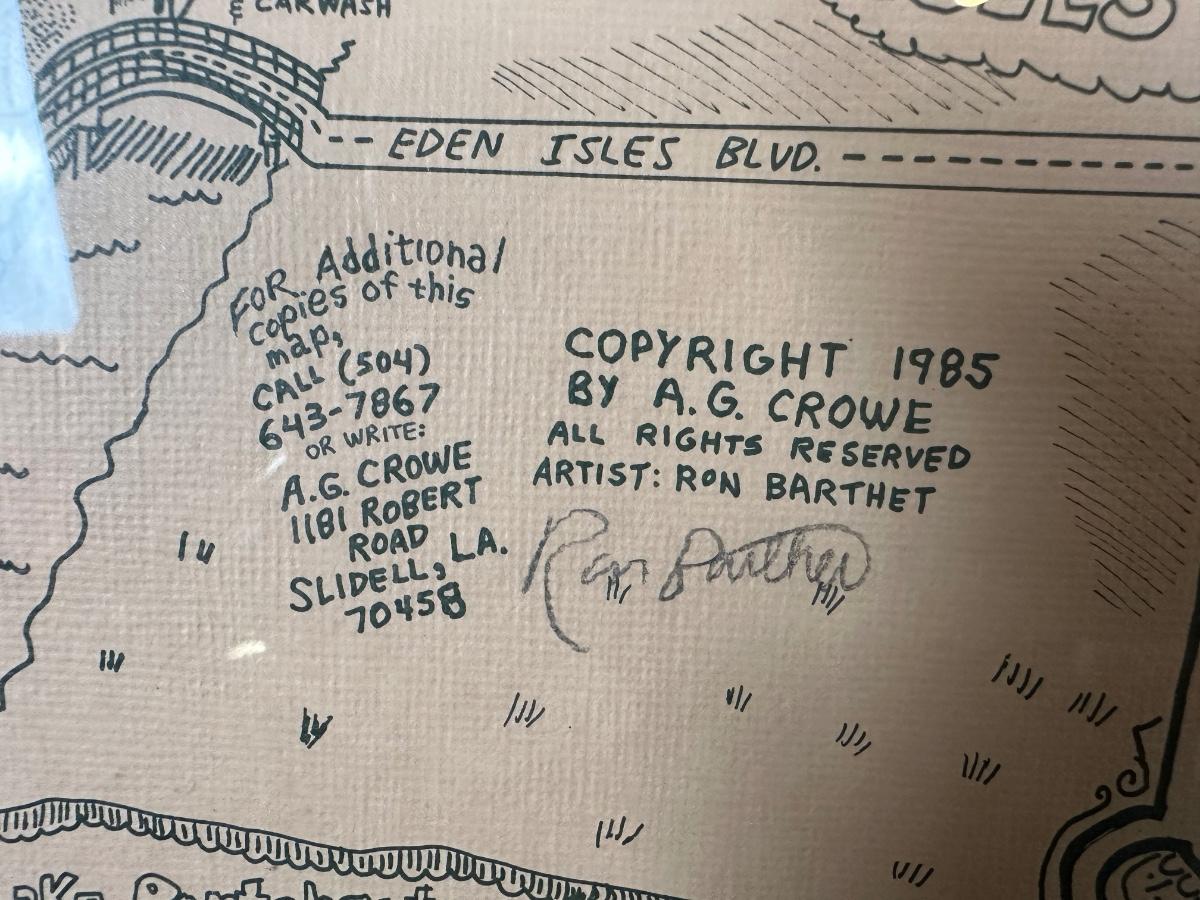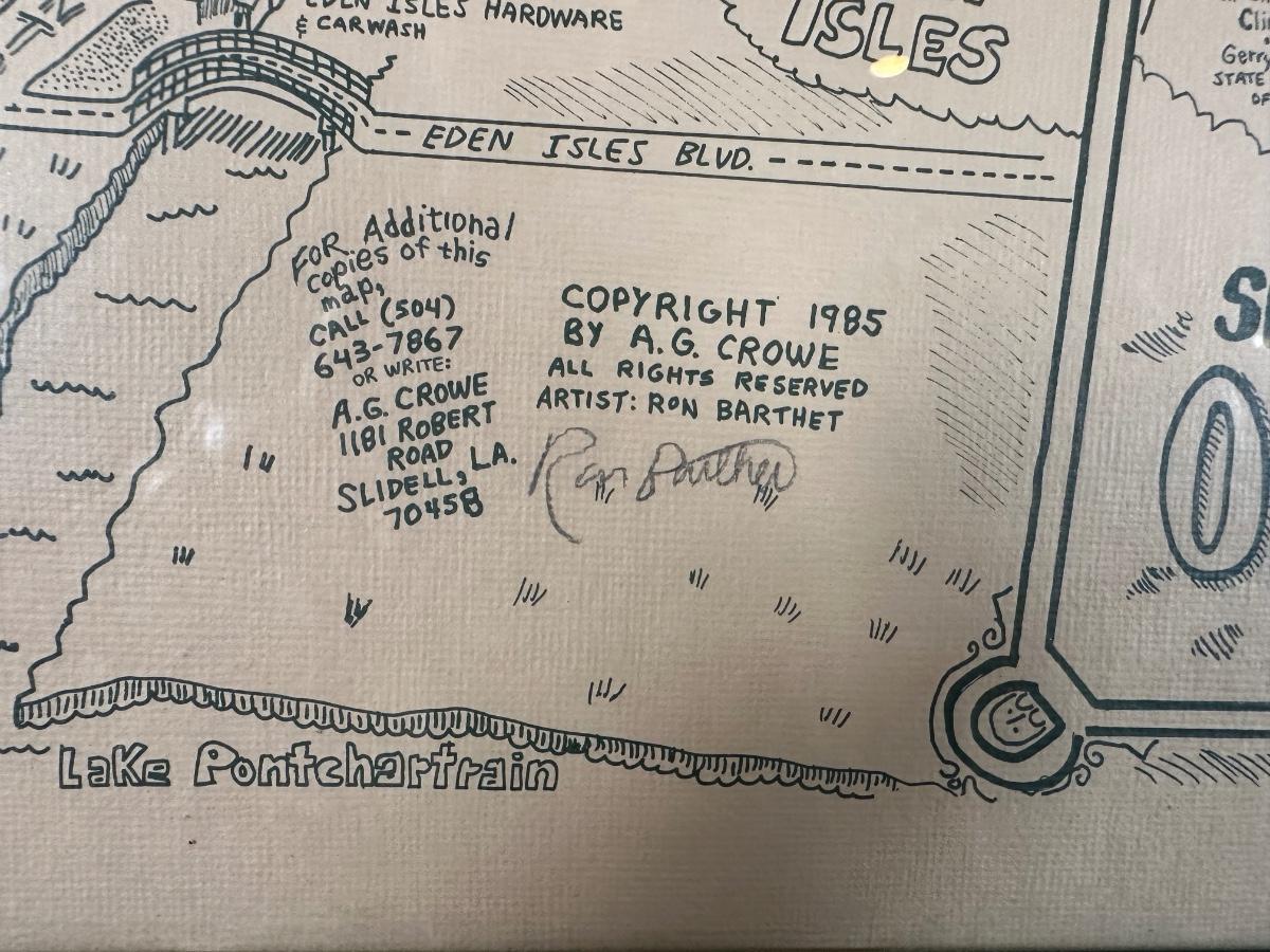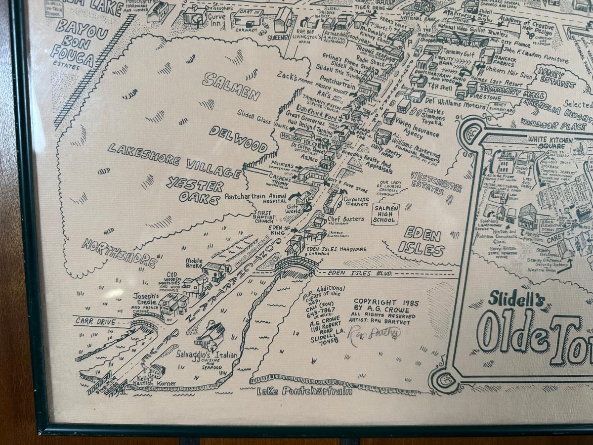 Vintage illustrated map of Slidell, Louisiana titled “Slidell’s Olde Towne Map”, copyright 1985 by A.G. Crowe. Artist credit Ron Barthet with visible signature and numbered edition
