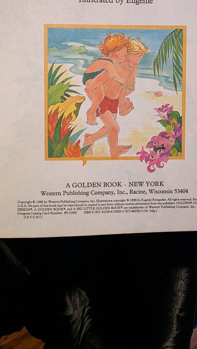 A charming 1986 edition of A Big Little Golden Book, “Little Sister,” published by Western Publishing Company and illustrated by Eugenie. This vintage treasure captures the warm innocence of childhood—sunny beach scenes, soft pastel artwork, and the timeless bond between siblings. The cover art features two children discovering a seashell by the shore, while the interior illustration (shown) adds to its nostalgic appeal.