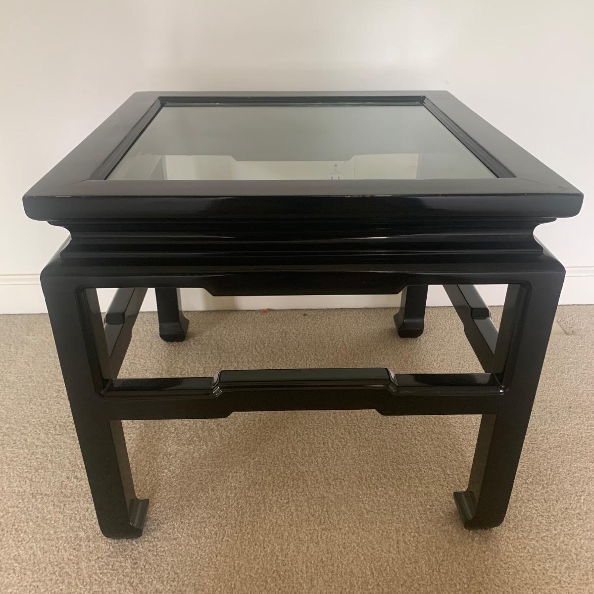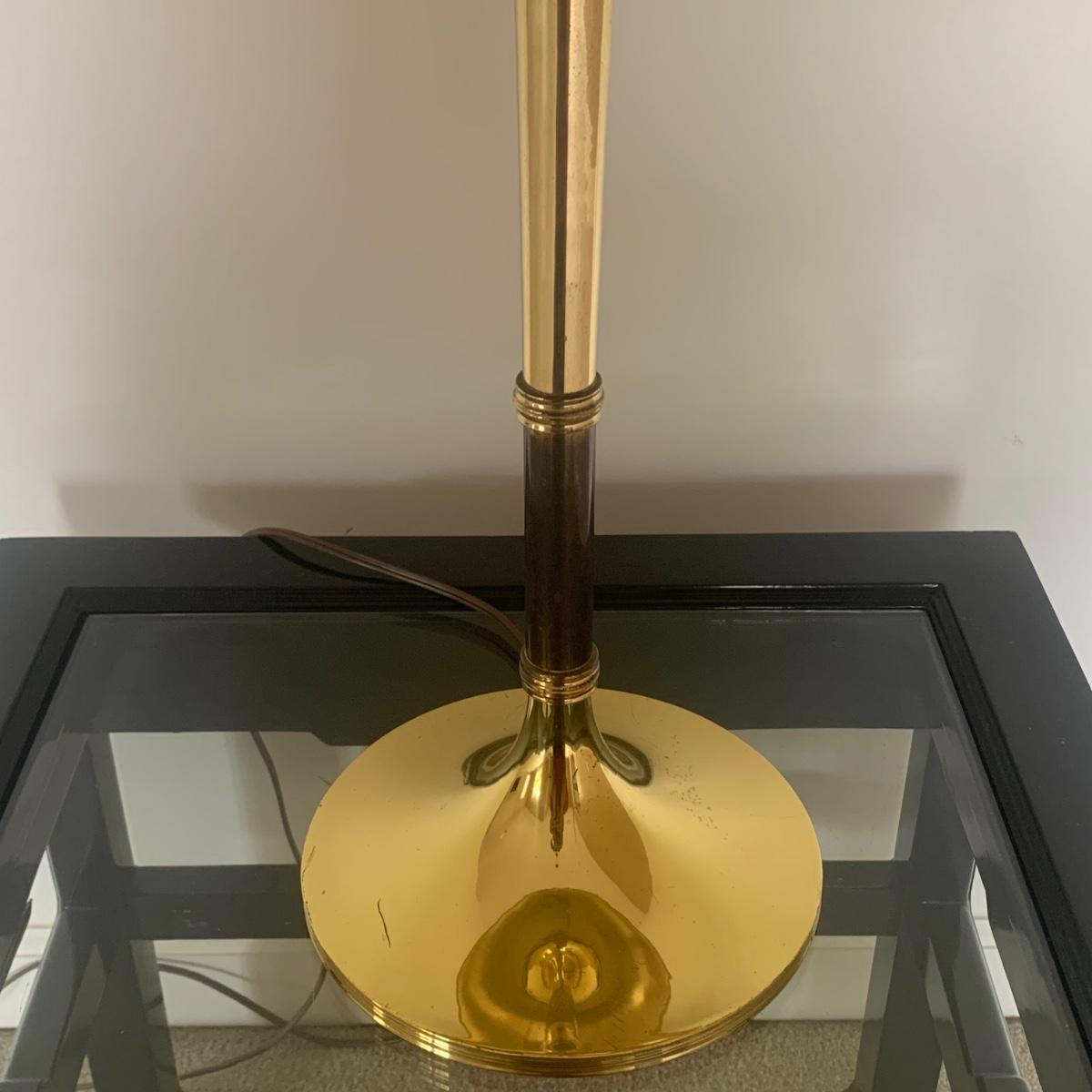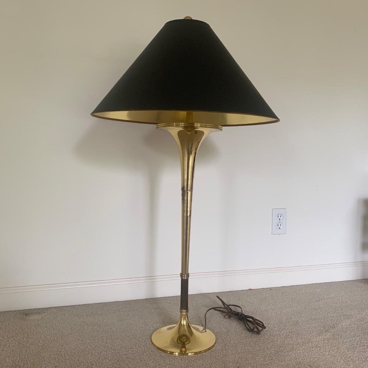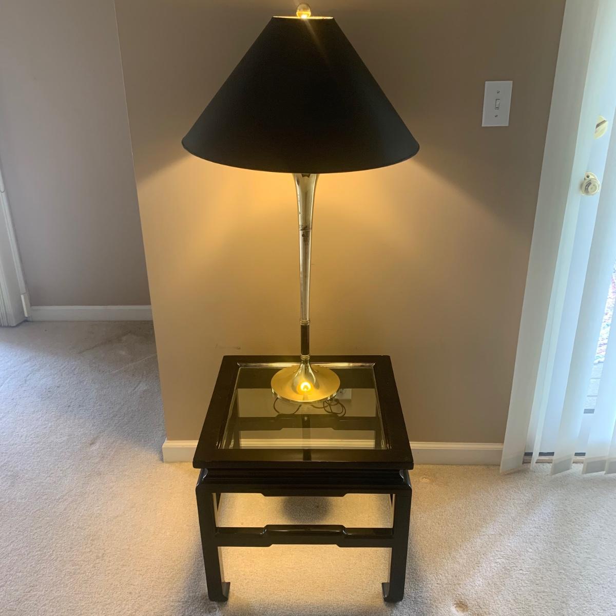 1986 Chapman brass trumpet table lamp and black art deco styled side table. Table lamp comes with black and brass-colored lamp shade. Lamp powered on when plugged in. Side table has a lacquered finish with glass inlaid top. Items show some blemishes from use. Please see photos for more details. Table measures, 19.5” x 19.5” x 17.5”H and the lamp is 37”H. Local pick-up only.