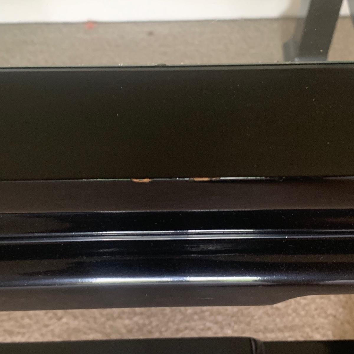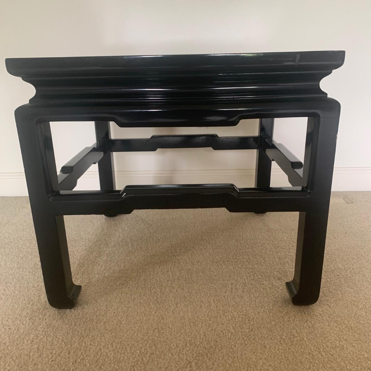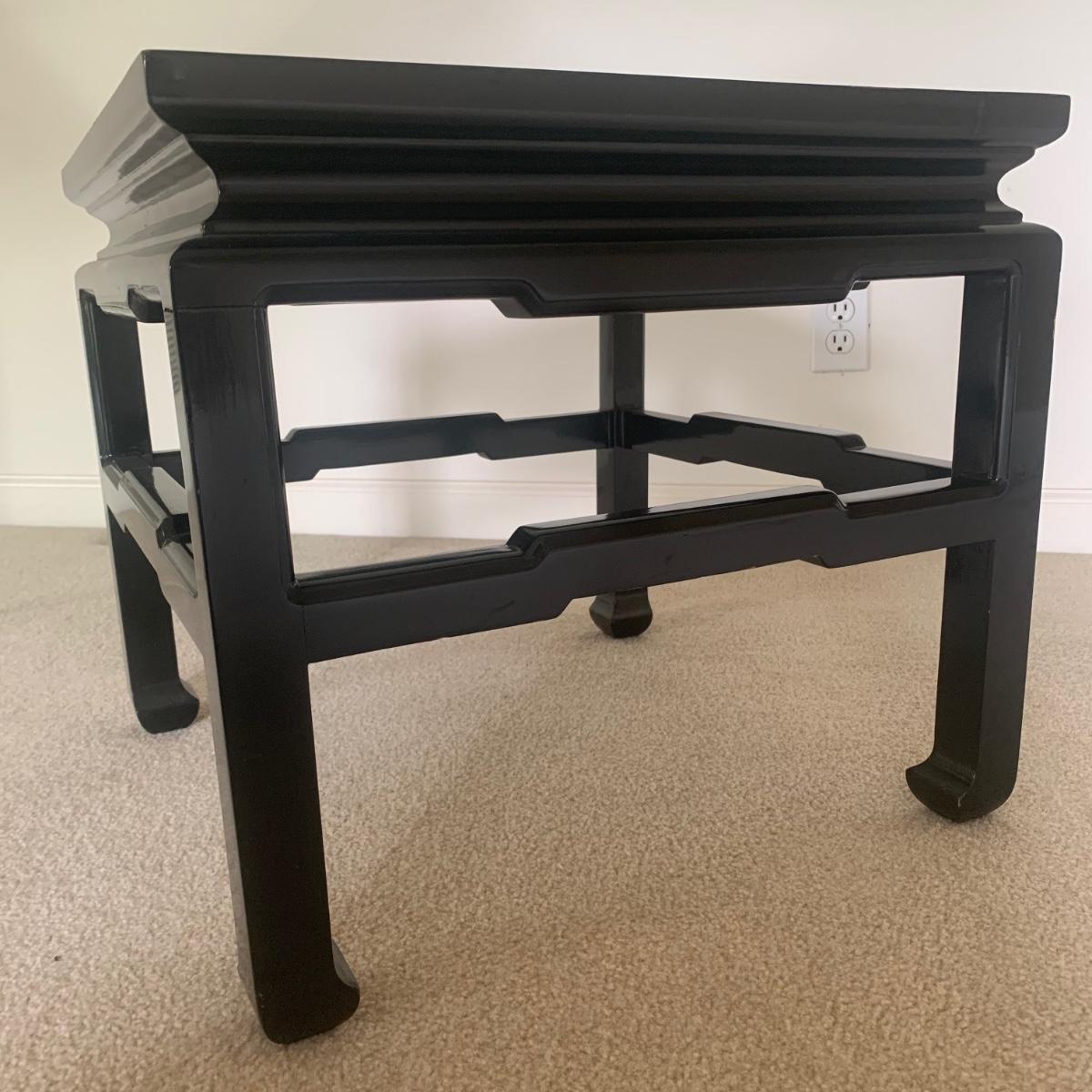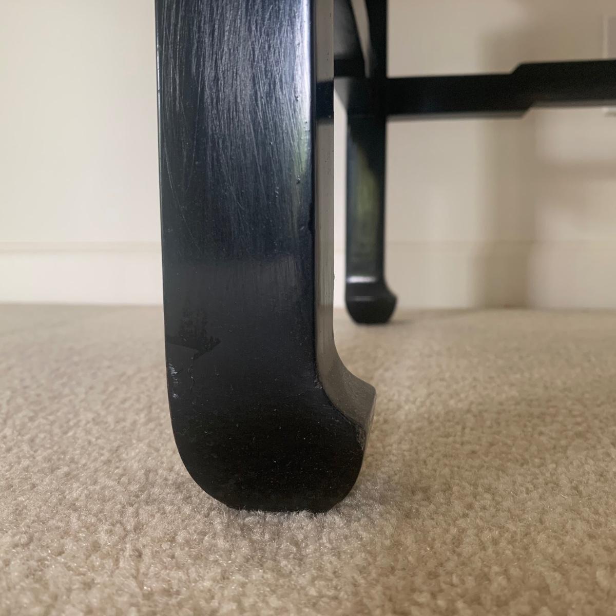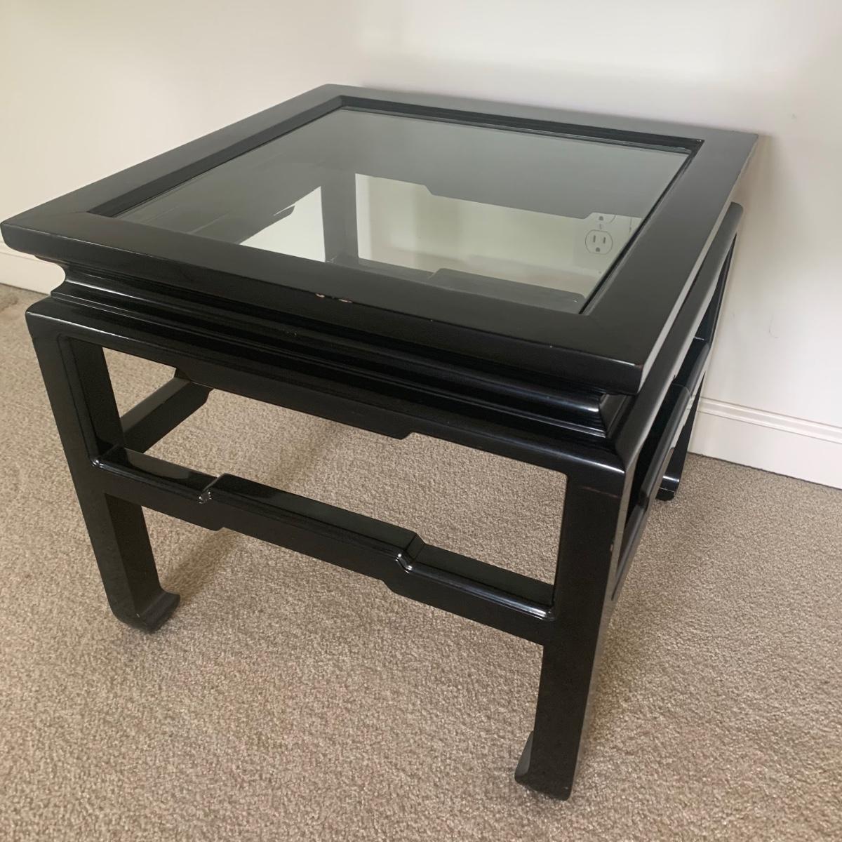 1986 Chapman brass trumpet table lamp and black art deco styled side table. Table lamp comes with black and brass-colored lamp shade. Lamp powered on when plugged in. Side table has a lacquered finish with glass inlaid top. Items show some blemishes from use. Please see photos for more details. Table measures, 19.5” x 19.5” x 17.5”H and the lamp is 37”H. Local pick-up only.