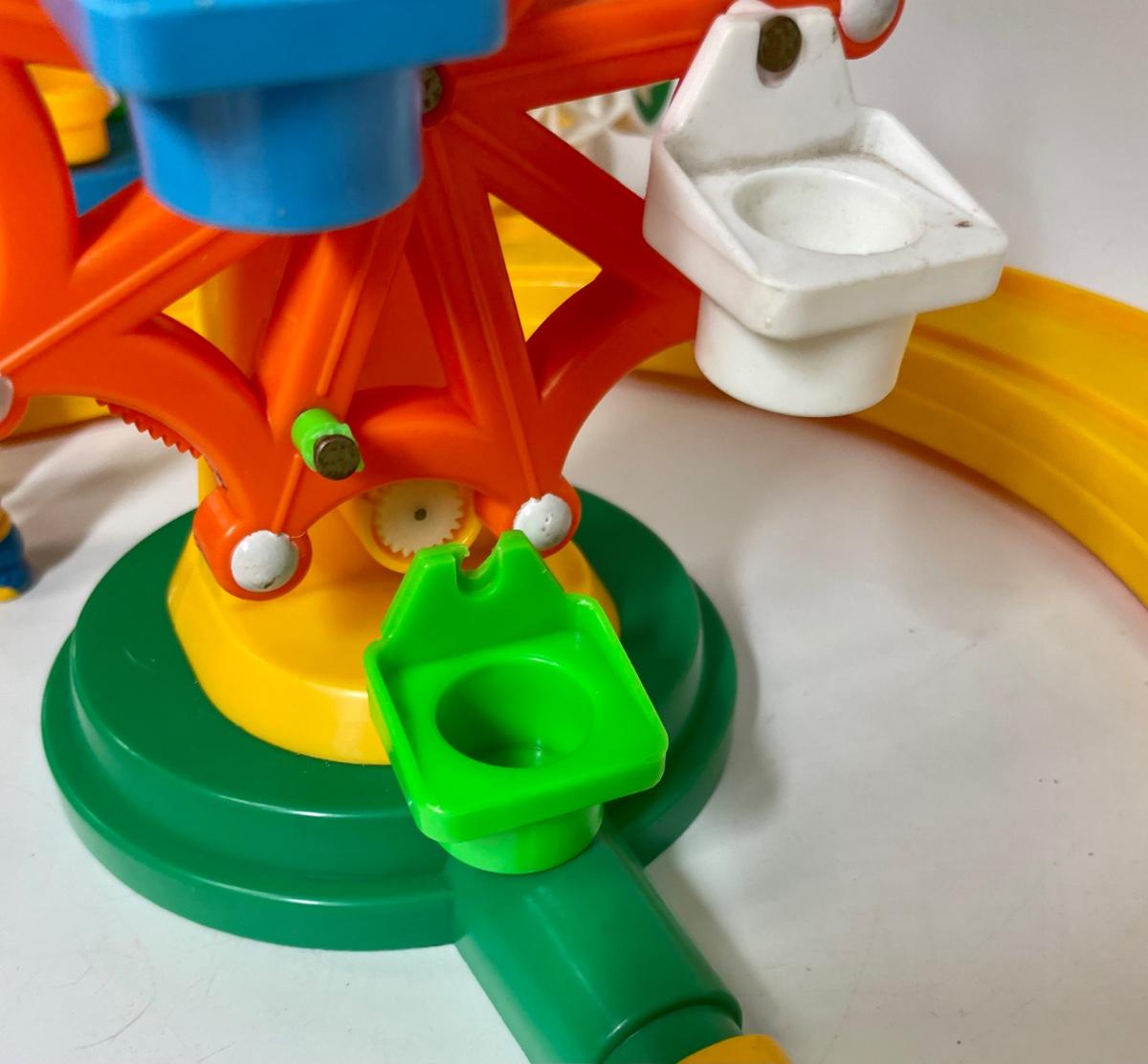 All original pieces included, one Ferris wheel seat is broken off the attach pin, see photos. Not sure if engine works, tested with different batteries but did not get it to run. No box or instructions.