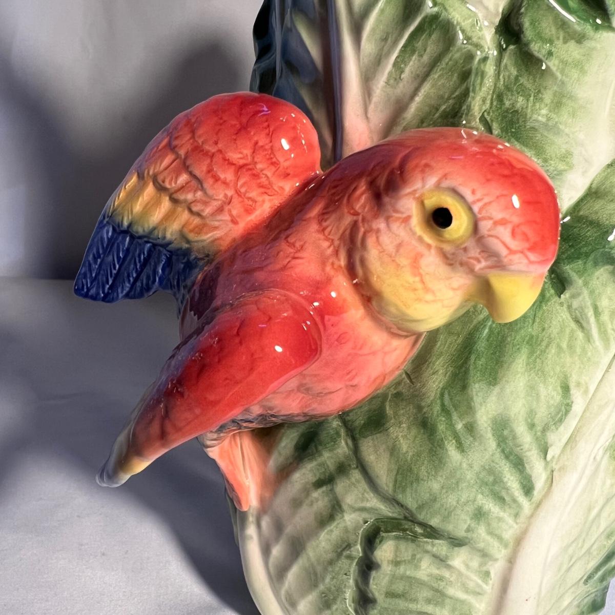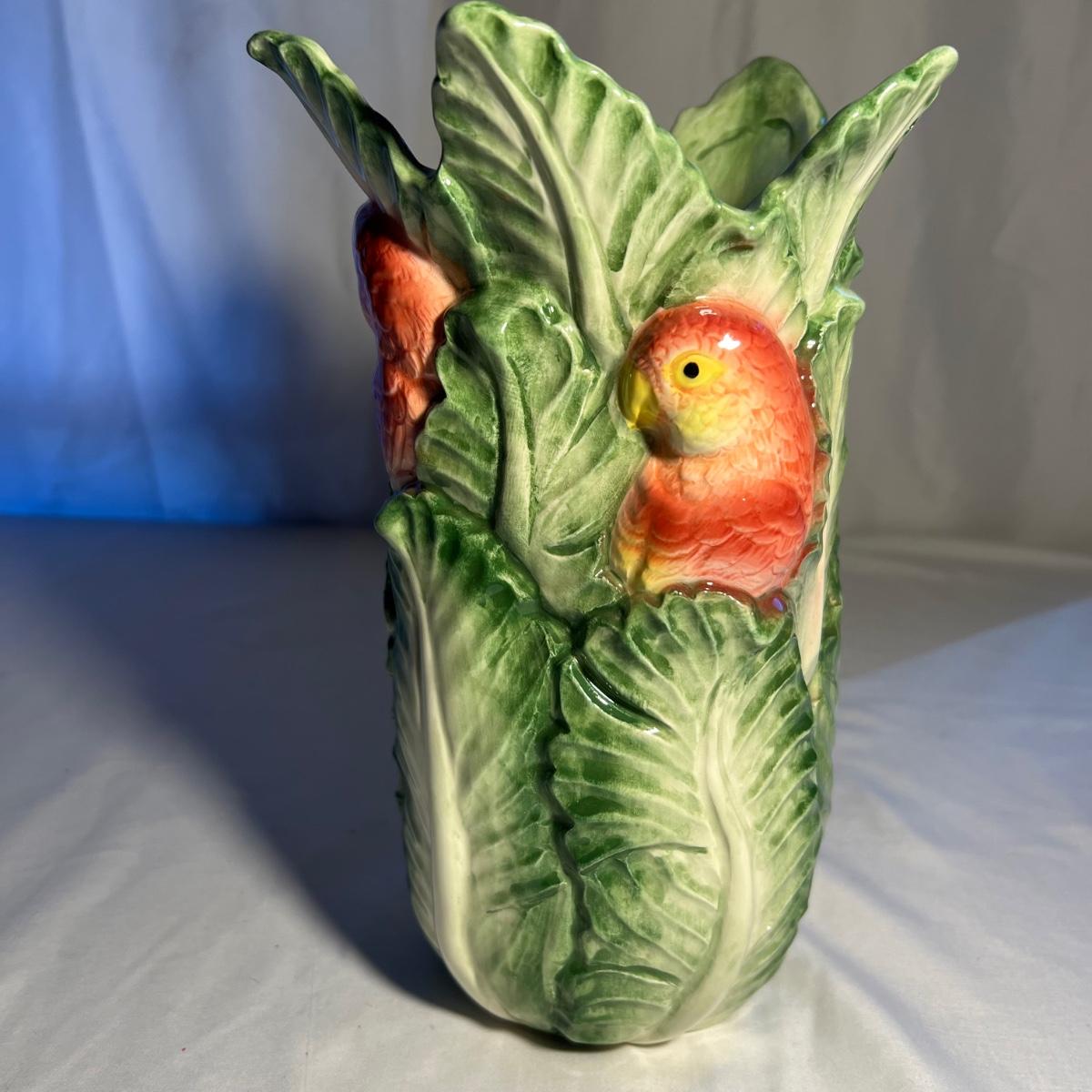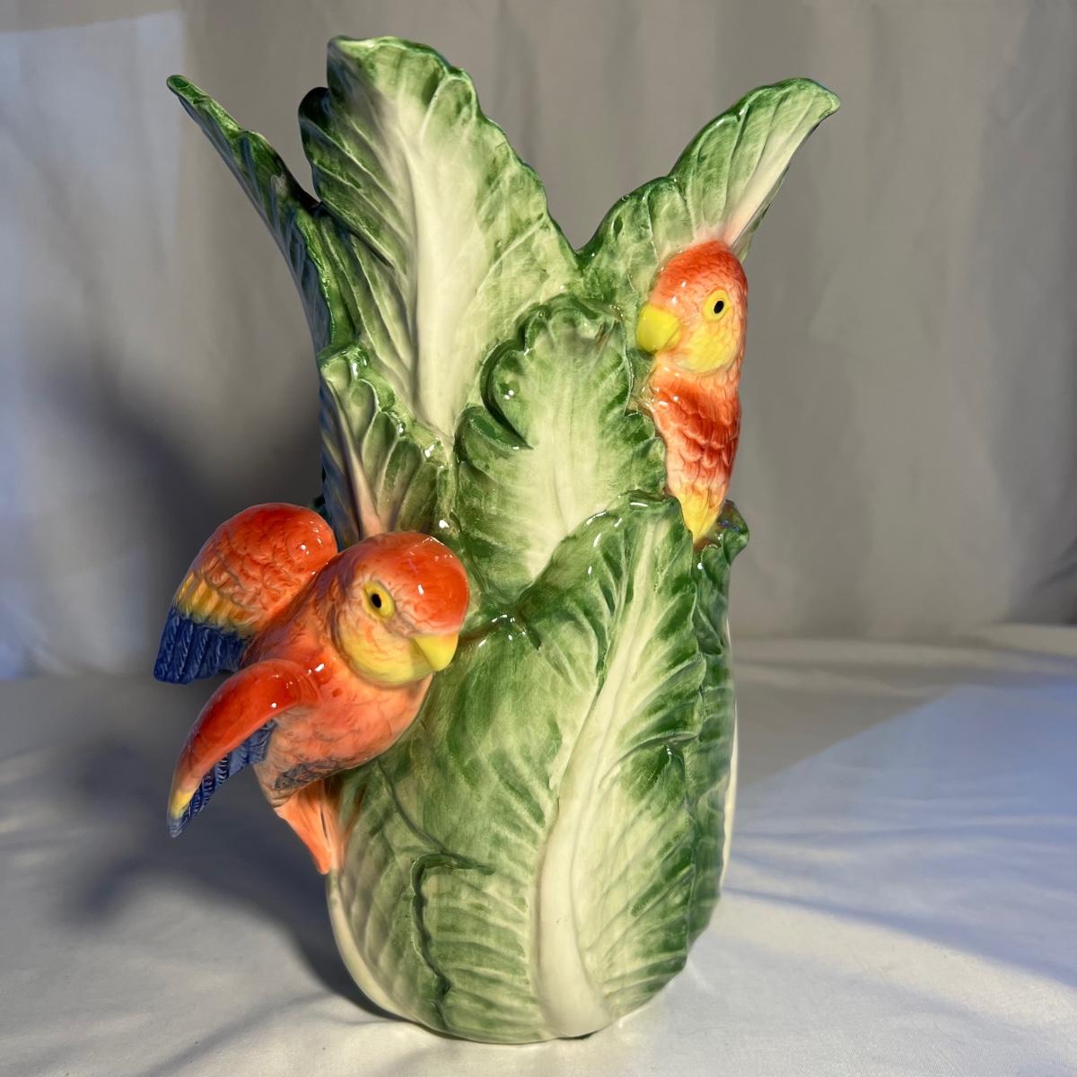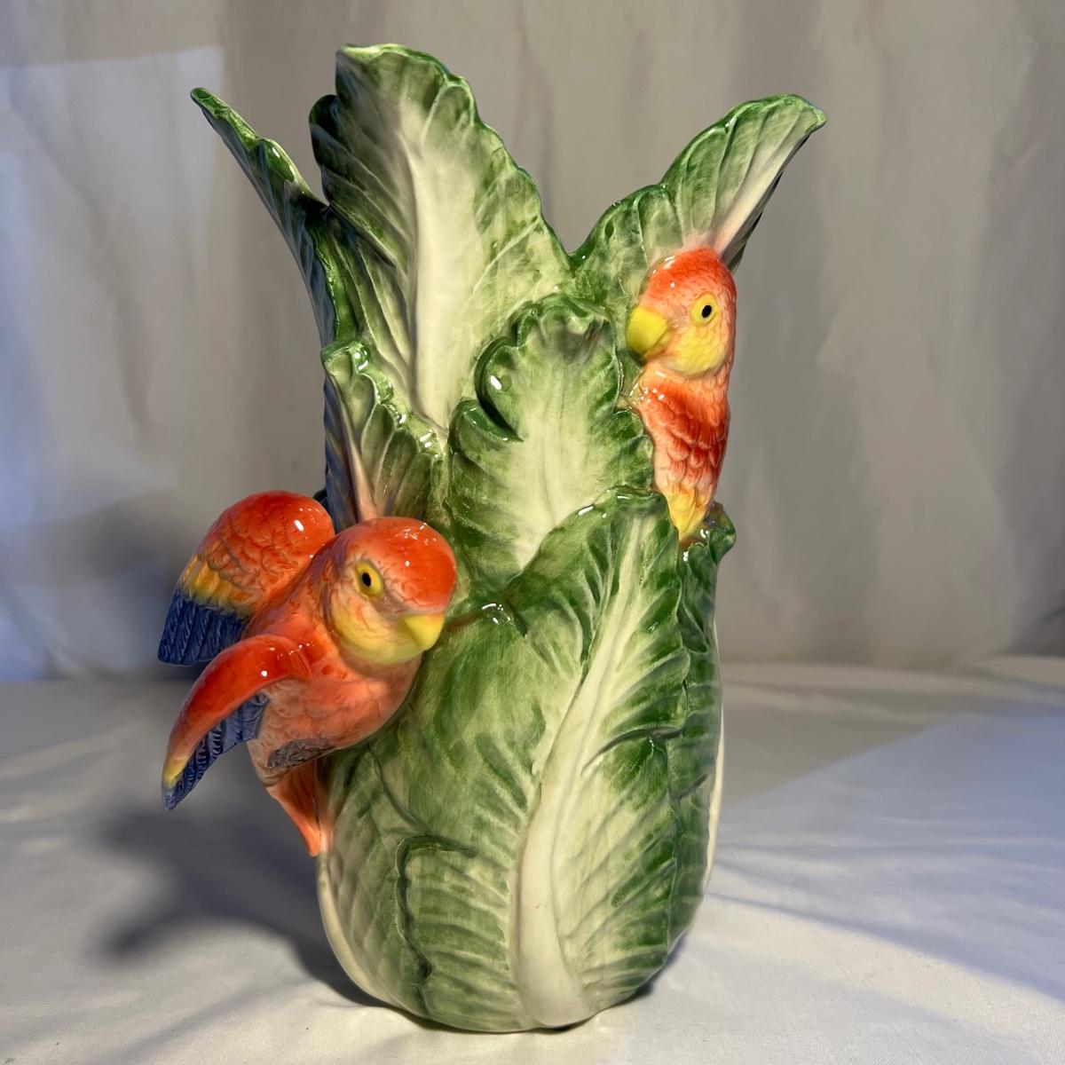 Three colorful pink parrots adorn this cabbage leaf design ceramic vase from Fitz & Floyd. The parrot on the side is 3D like.
