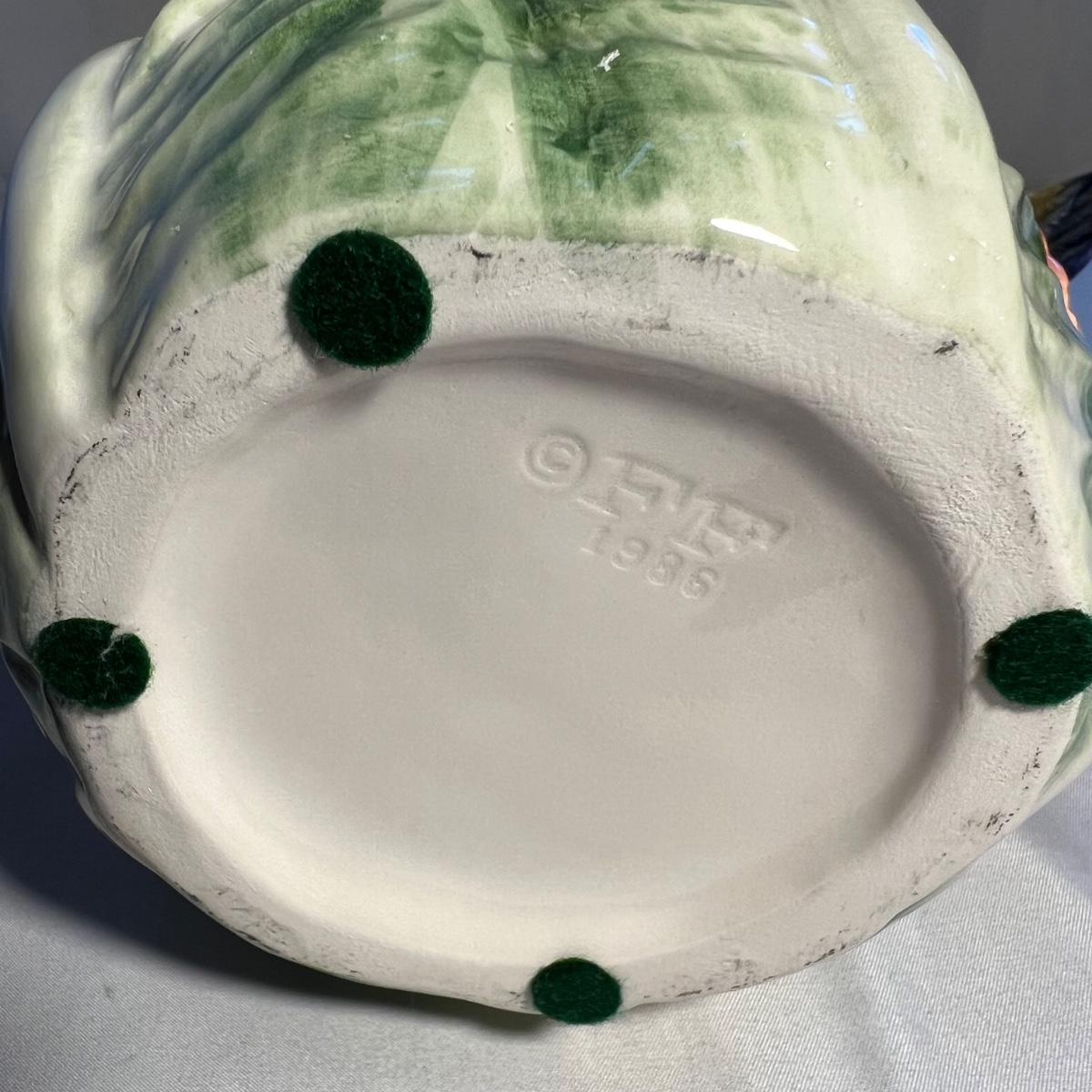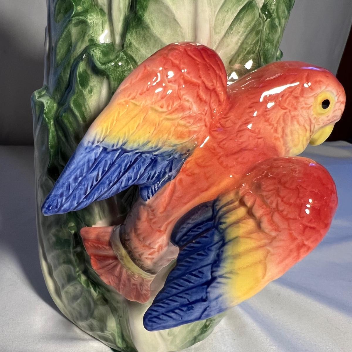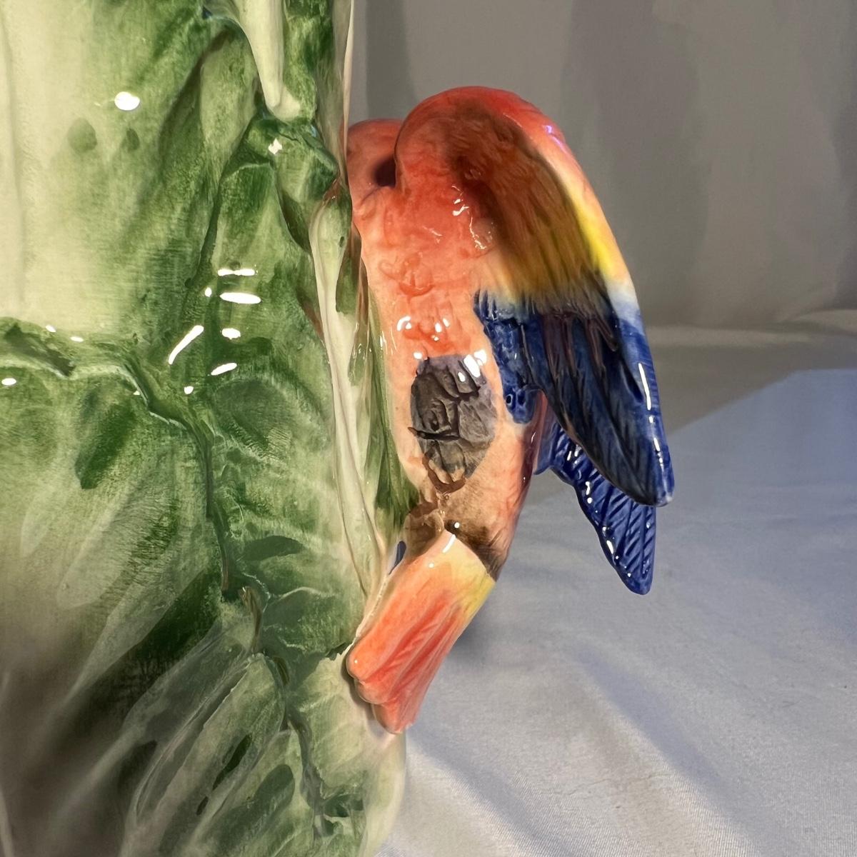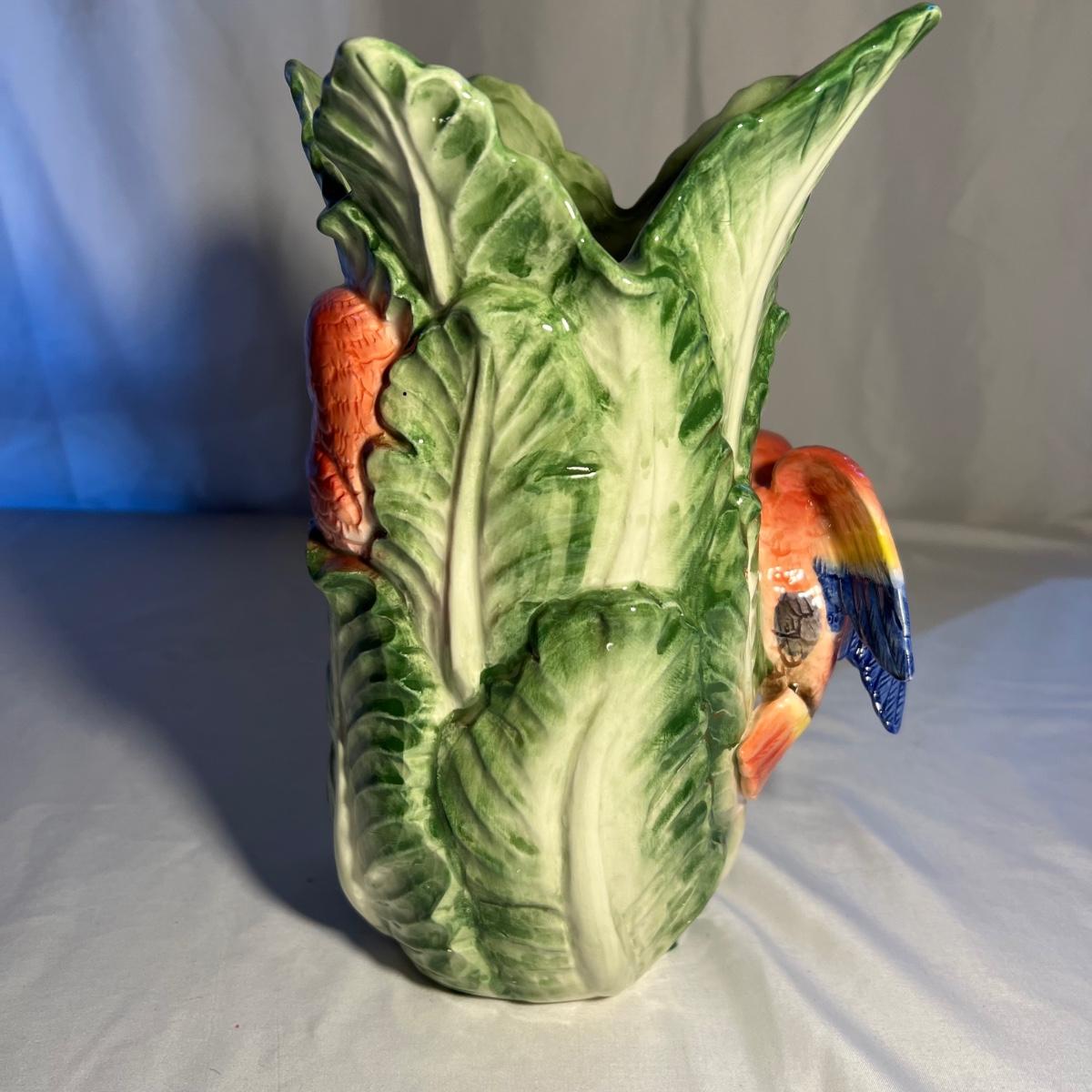 Three colorful pink parrots adorn this cabbage leaf design ceramic vase from Fitz & Floyd. The parrot on the side is 3D like.
