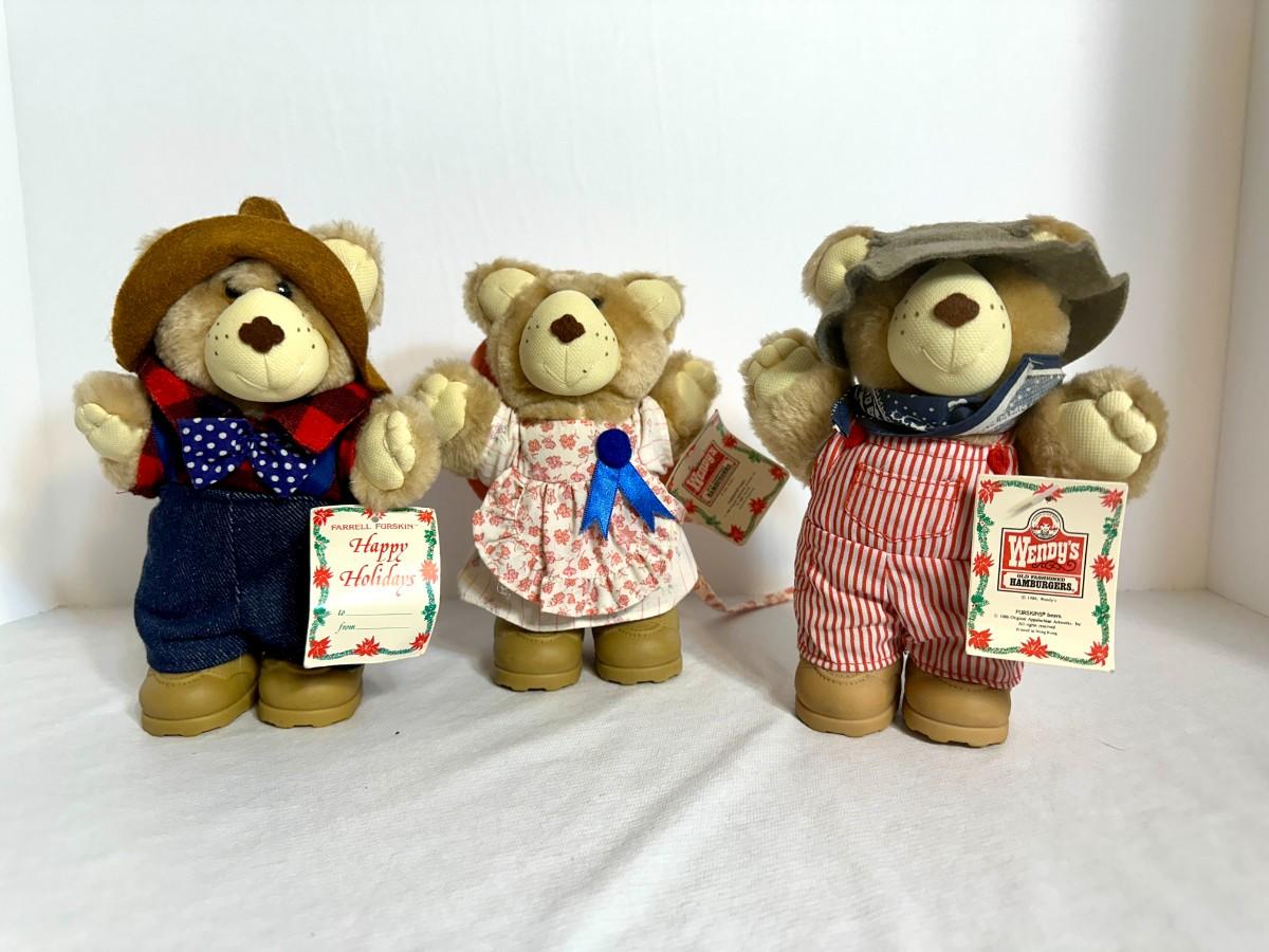 3 Furskin bears manufactured for Wendy's in 1986. All 3 dolls are in excellent condition with original tags attached.