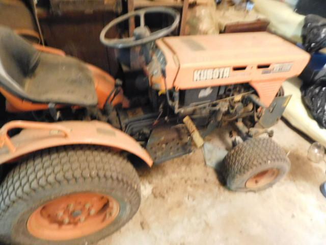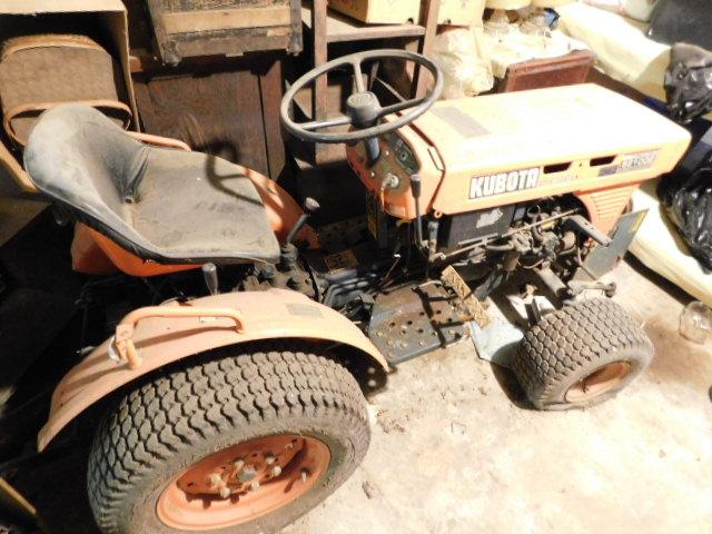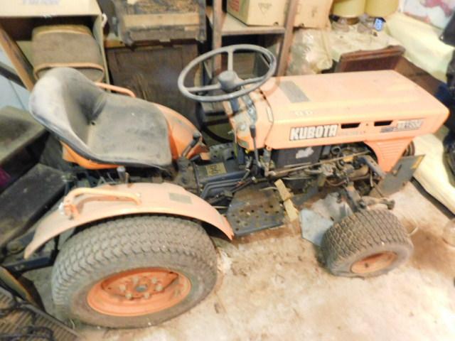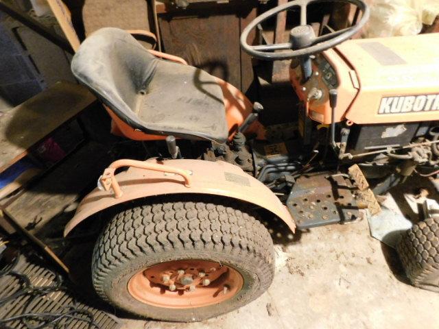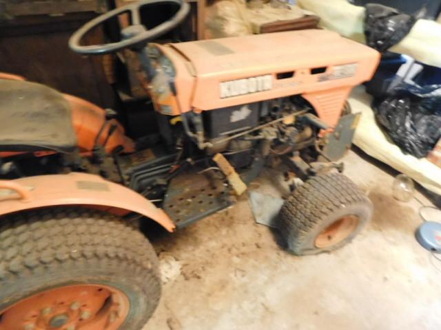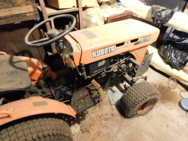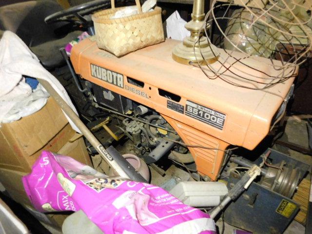 1986 Kubota B5100E Diesel Lawn Tractor has flat front tires. Has not been tested. Key in ignition. Will have to bring help to remove from garage. Hand turned engine. Moves easily with a push so should remove from garage with little difficulty. Sold as is, where it sits.