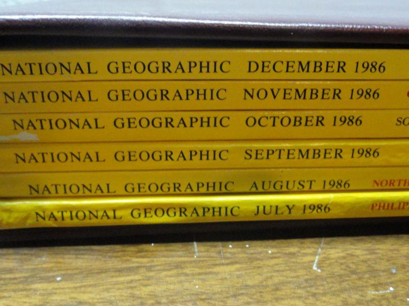 1986 National Geographic Magazine - complete set of 12 with faux leather cases Cases in great condition Books in normal good condition