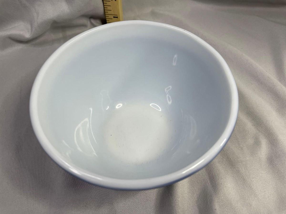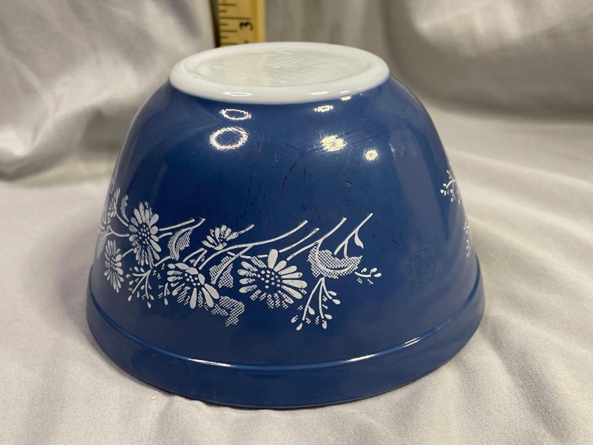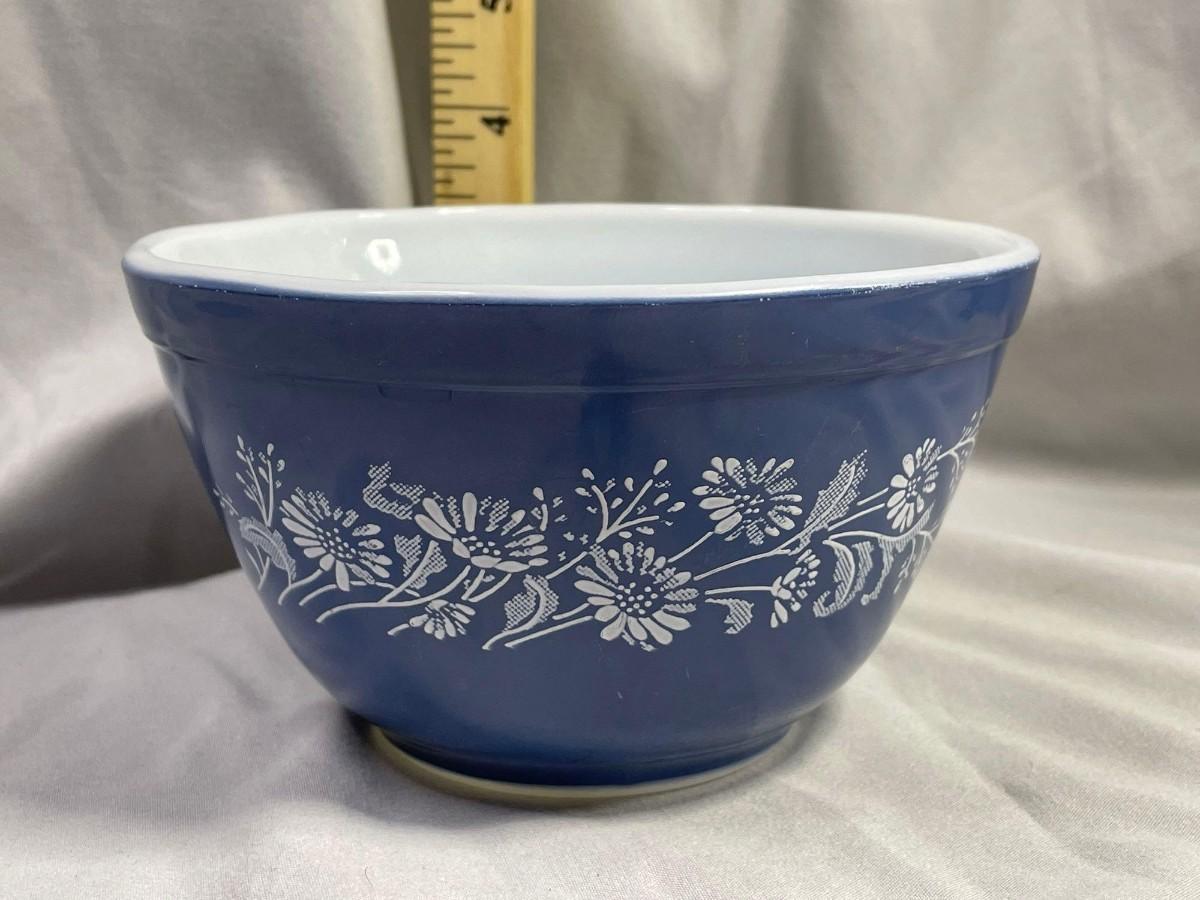This is the small mixing bowl and it is in overall very good condition. No significant paint issues noted. Of note - Blue Colonial Mist was the last opal Pyrex pattern made and was only produced in 1986.<br />