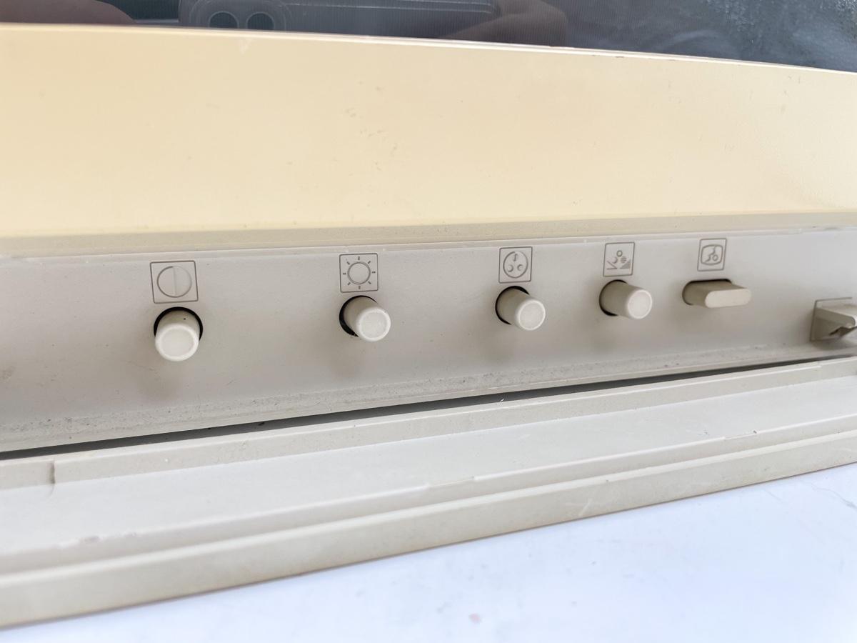 In fair physical condition - has yellowing and some scuffs on one side. The hinges of the control cover plate on the front bottom are broken, as shown. Green light turns on when powered on but otherwise untested.
