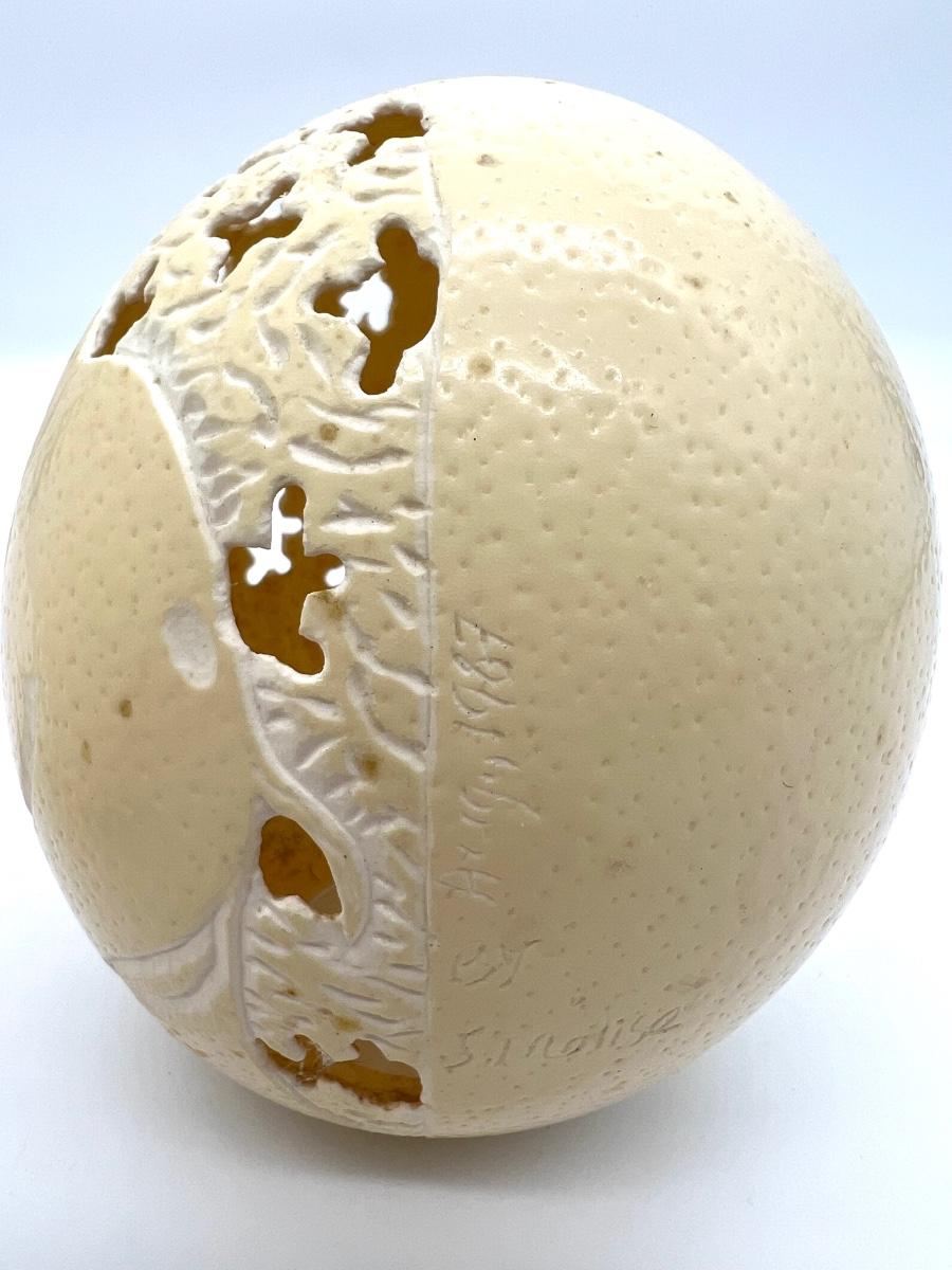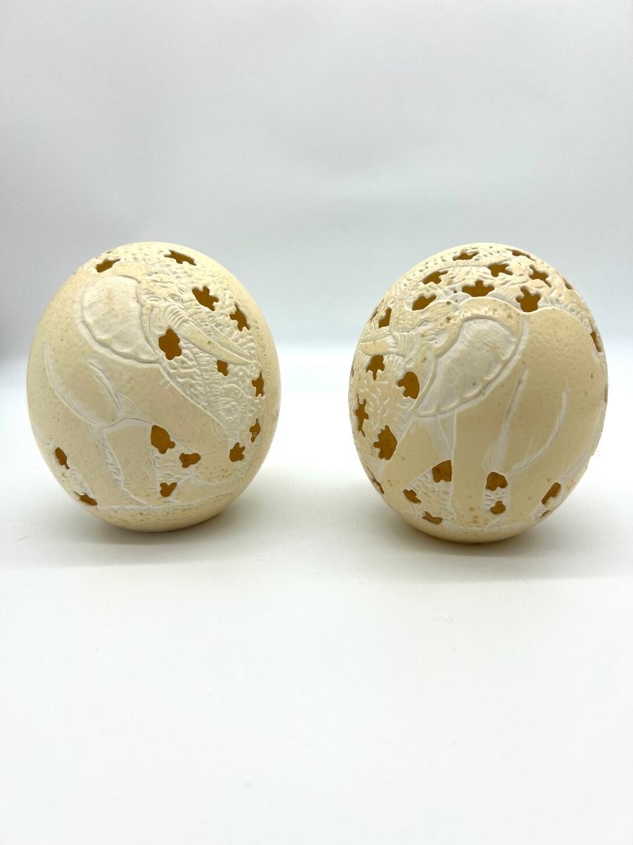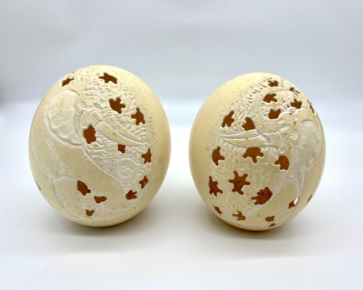 1987 Carved & Signed  Ostrich Eggs Elephants