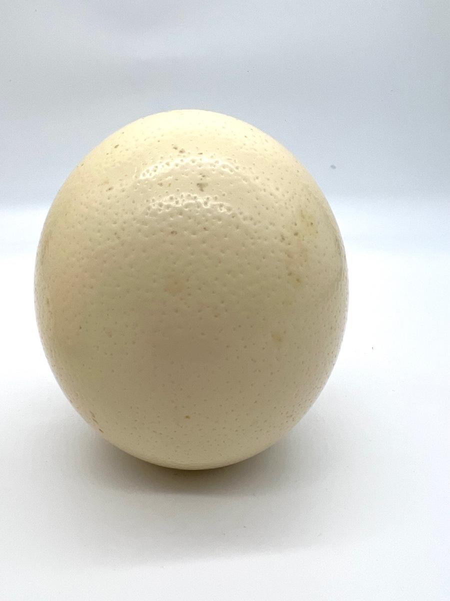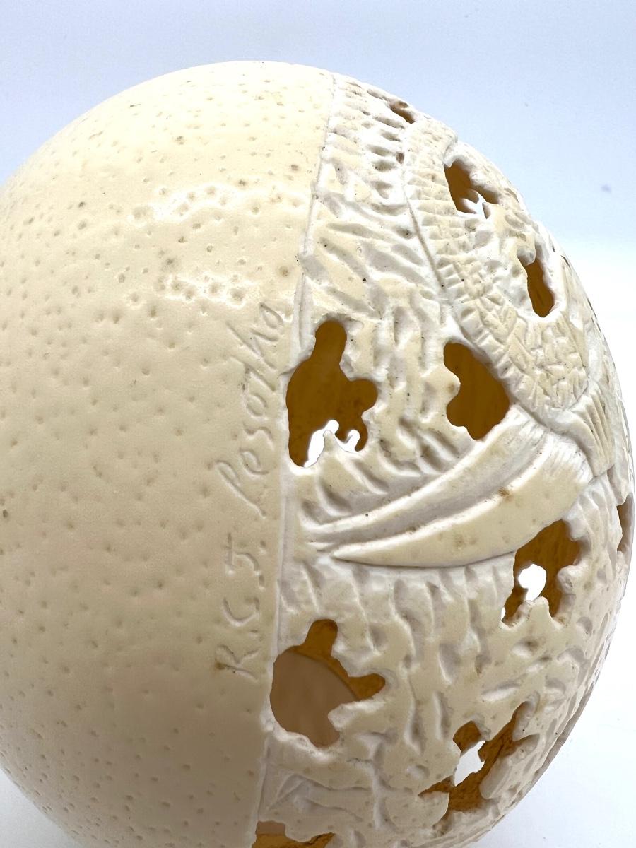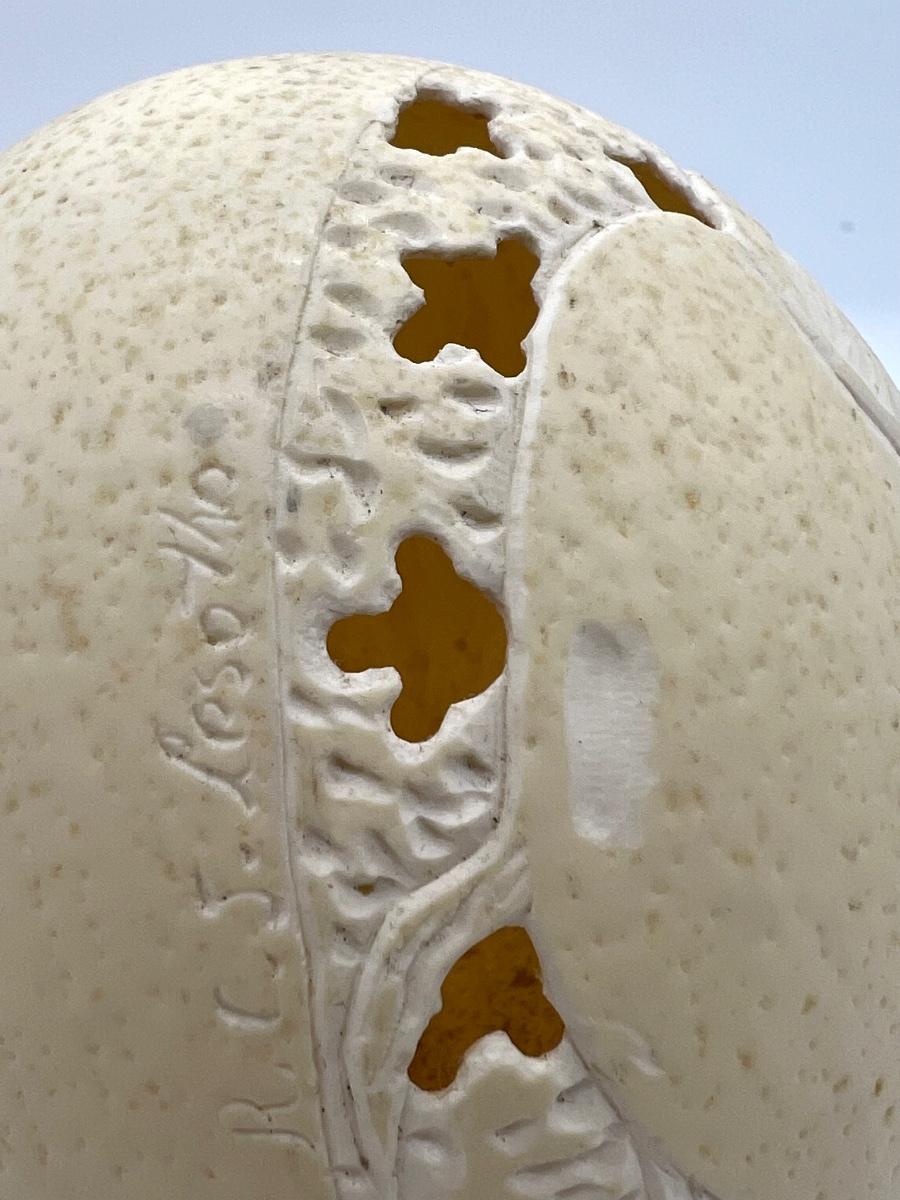 Pair of ostrich eggs, signed by S. Molise measure 5 1/2 inches tall, five and 5 inches wide.