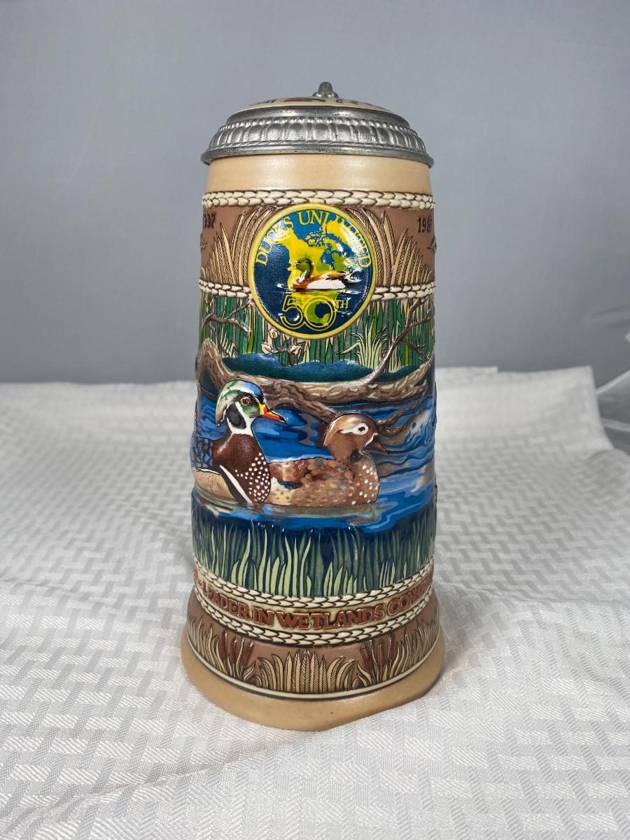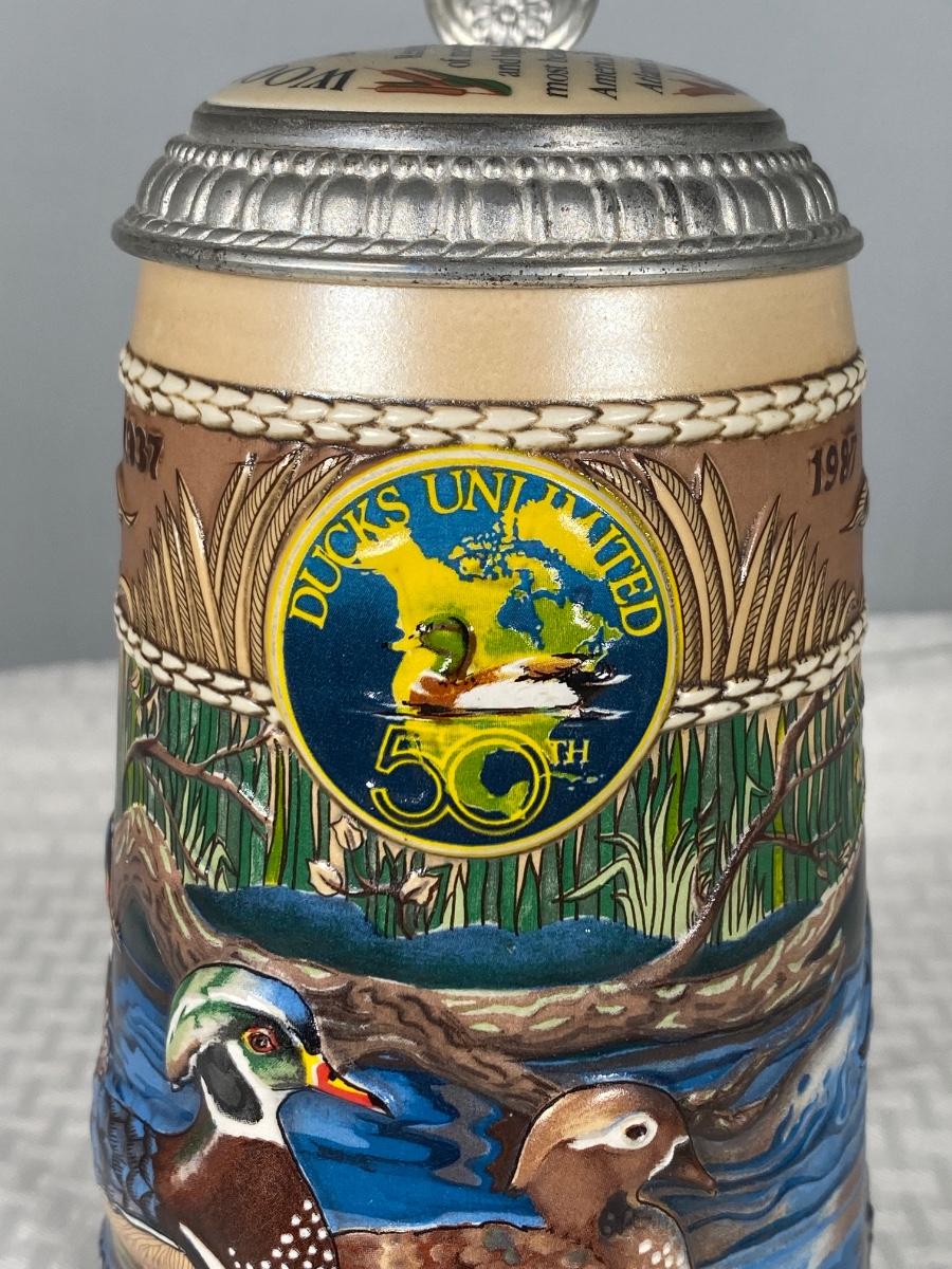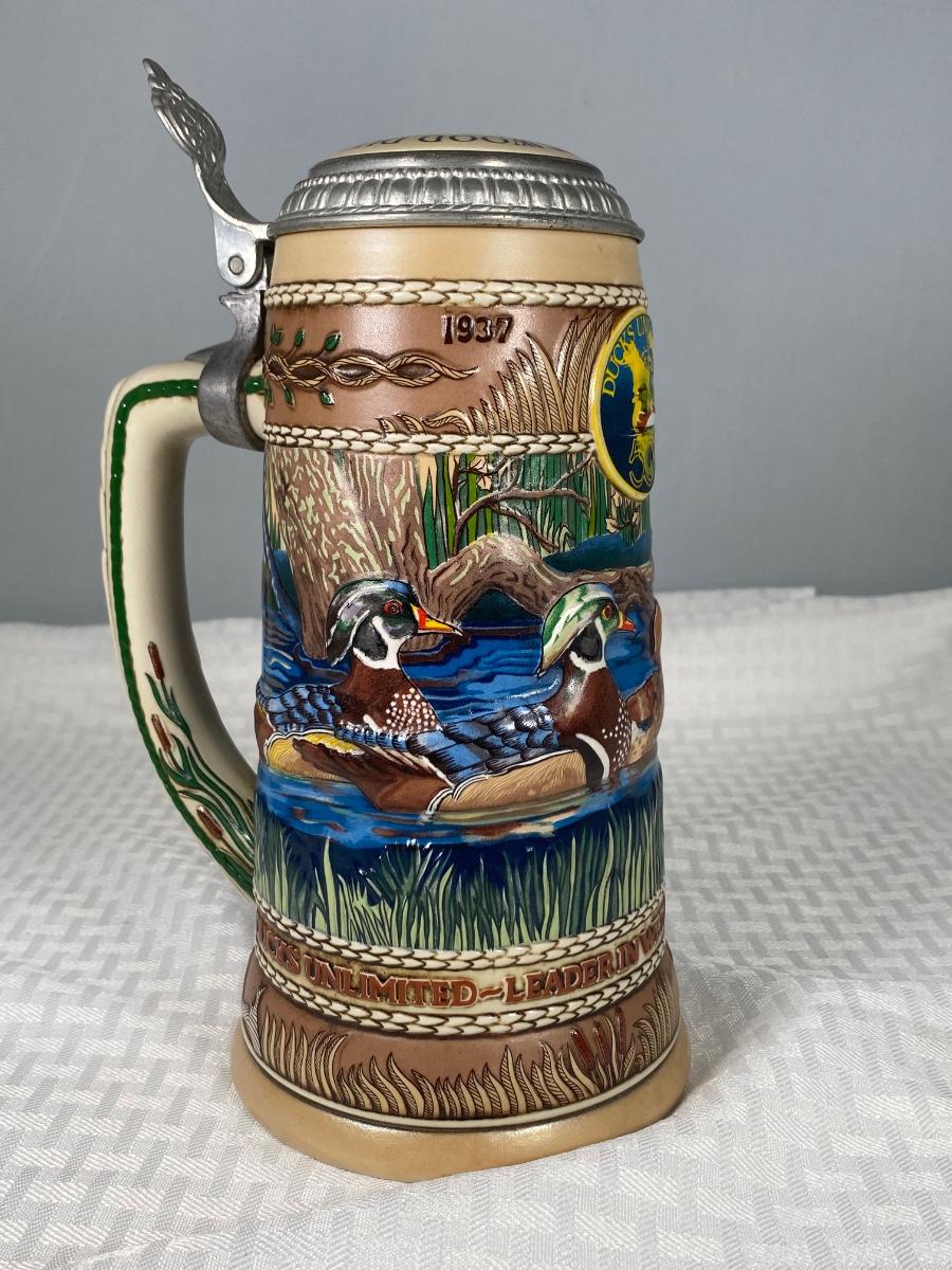 1987 First Edition Ducks Unlimited Waterfowl Series Wood Duck Lidded Stein. Good previously displayed condition.
