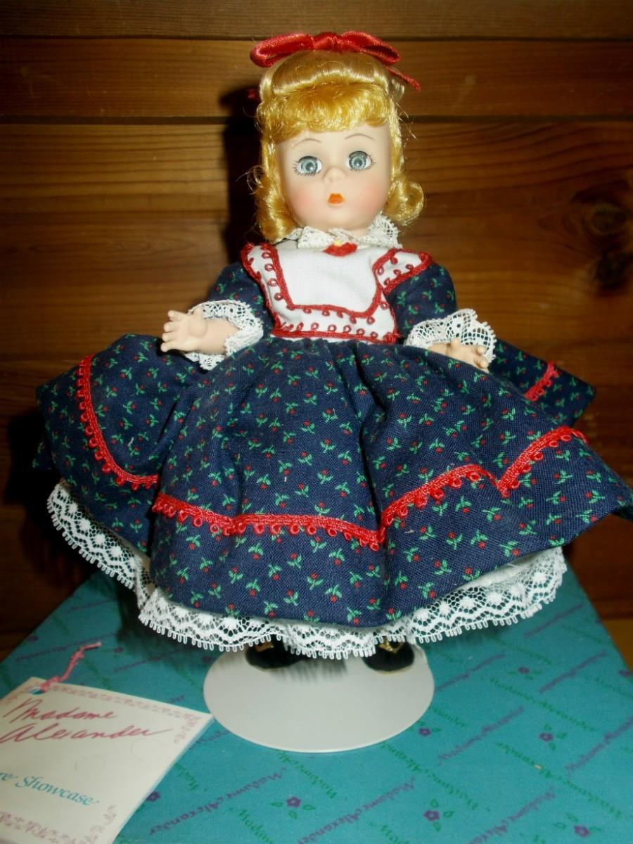 Adorable little 8" doll from the Miniature Showcase series. Made in 1988. Never displayed or played with. Tag is with her, but the string is broke. It can easily be tied back on. Excellent condition in her original box that shows just a bit of shelf wear.