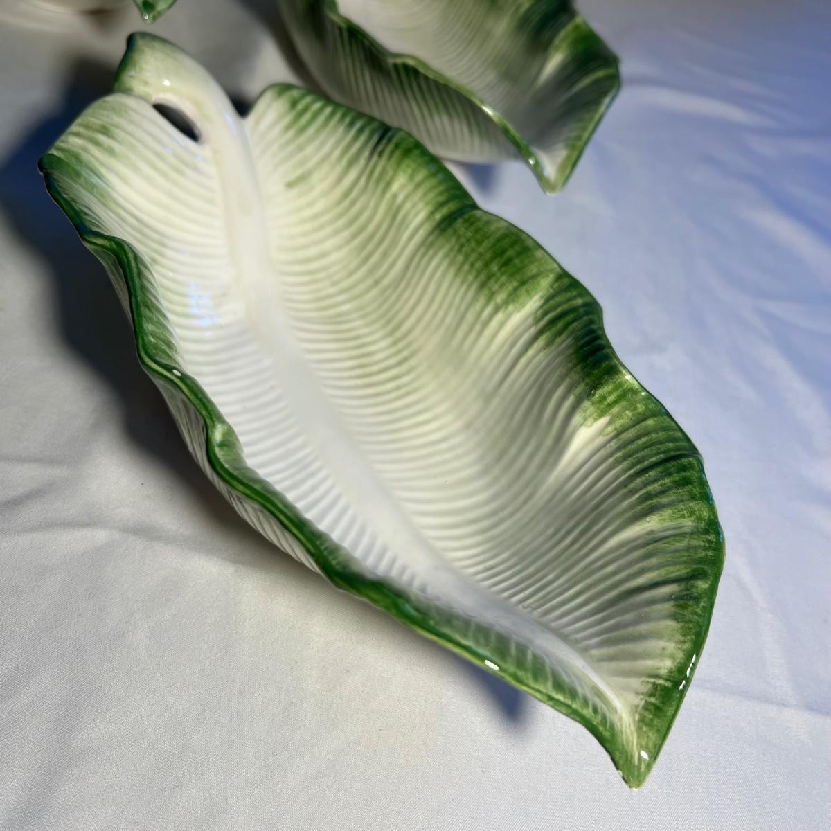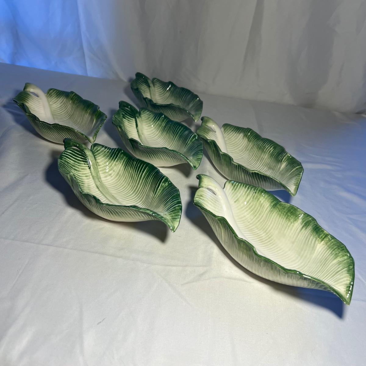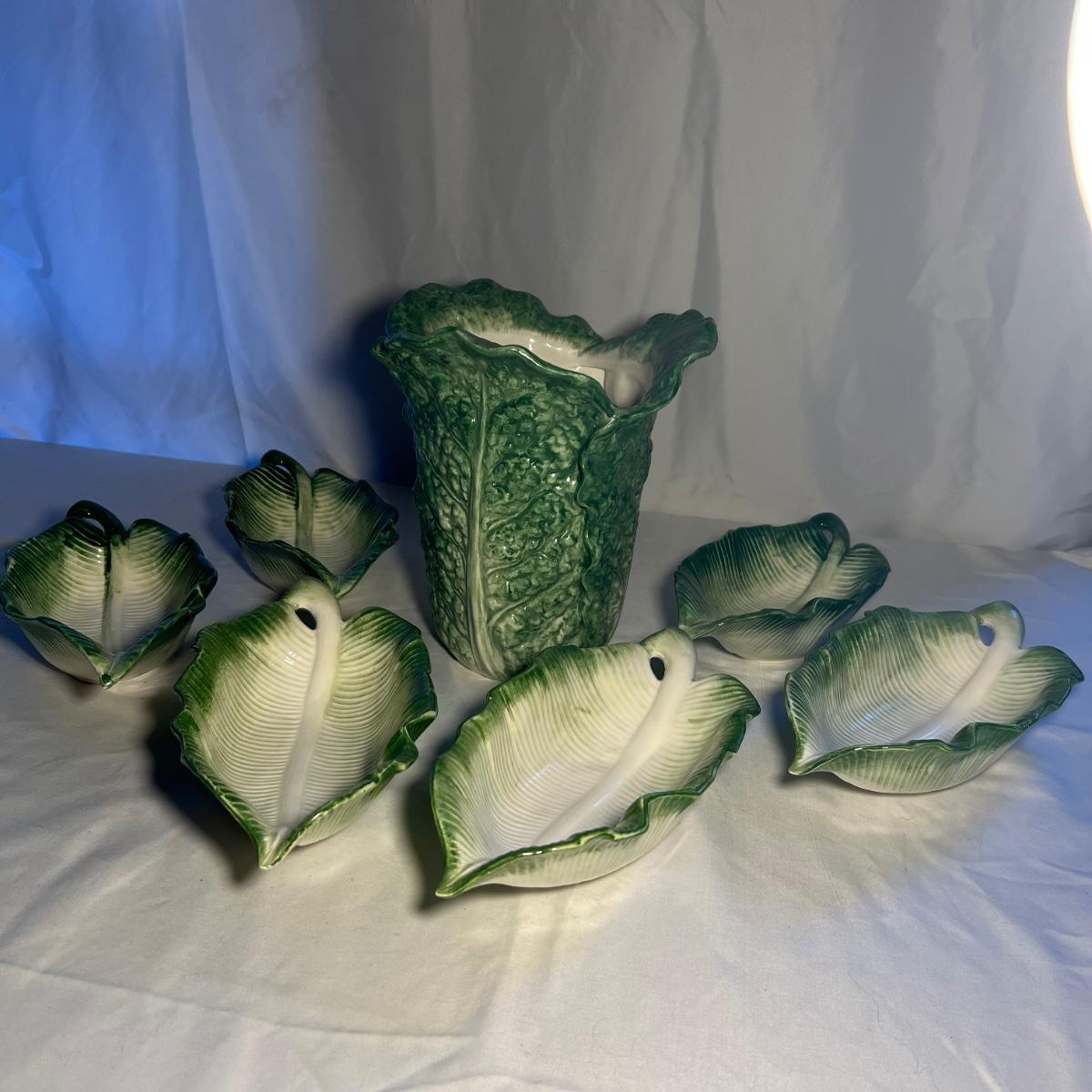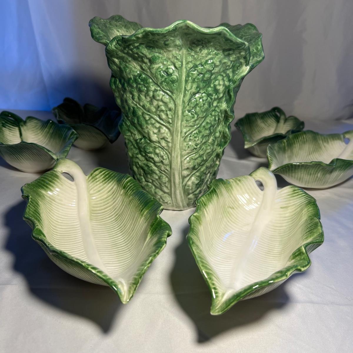 This Fitz & Floyd ceramic vase measures 7.5”D (top) x 8”H. It has been paired with six Fitz & Floyd leaf shaped appetizer dishes that measure 9” x 4.5” x 2”H.