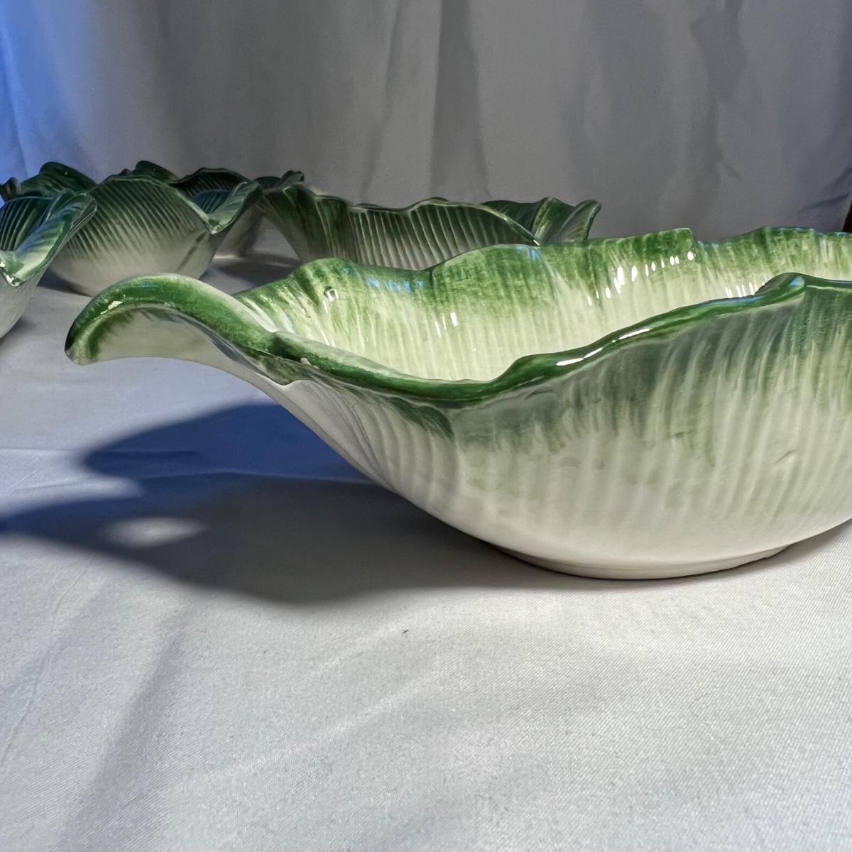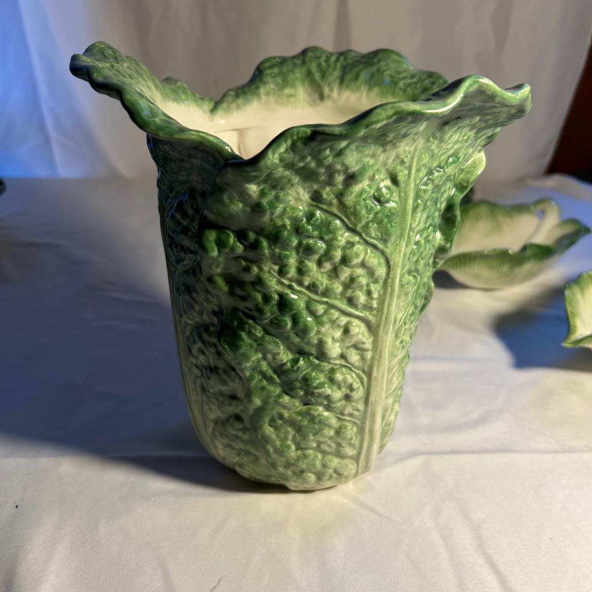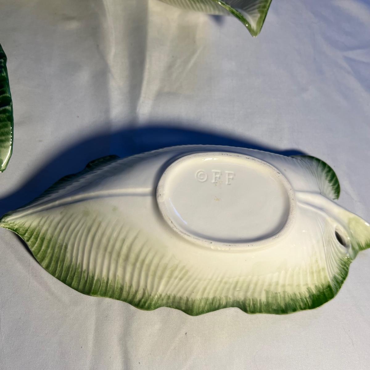 This Fitz & Floyd ceramic vase measures 7.5”D (top) x 8”H. It has been paired with six Fitz & Floyd leaf shaped appetizer dishes that measure 9” x 4.5” x 2”H.