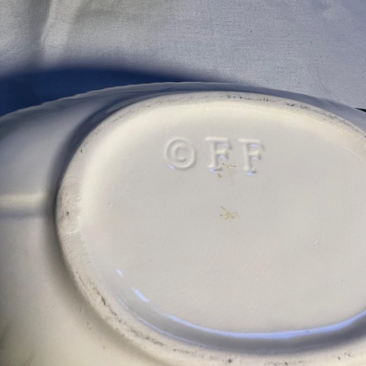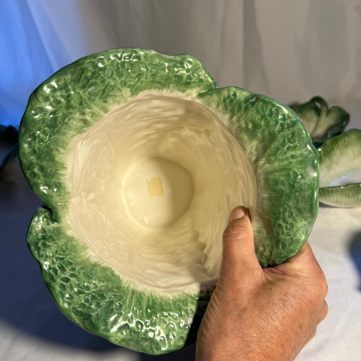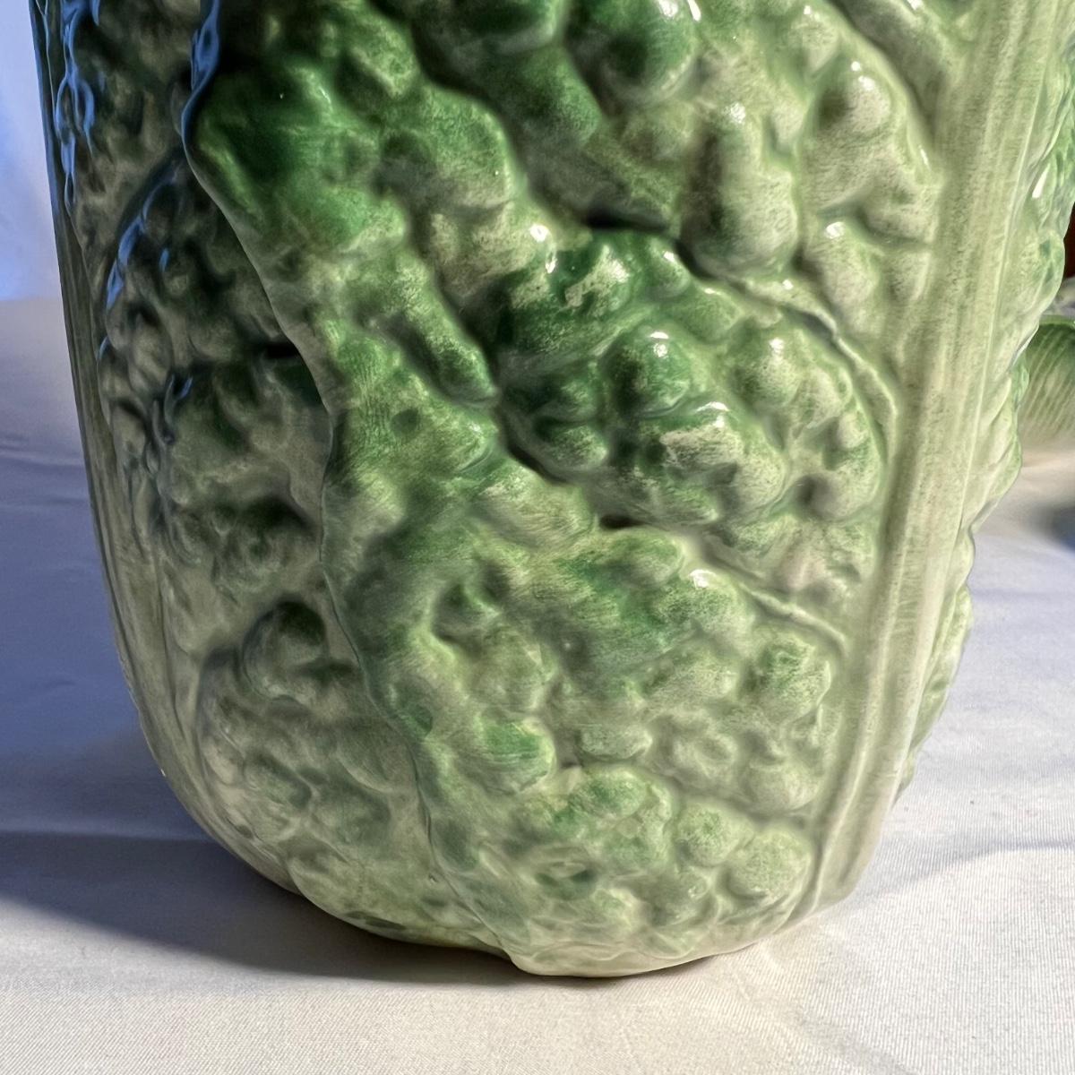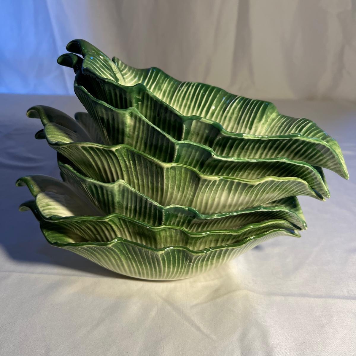 This Fitz & Floyd ceramic vase measures 7.5”D (top) x 8”H. It has been paired with six Fitz & Floyd leaf shaped appetizer dishes that measure 9” x 4.5” x 2”H.