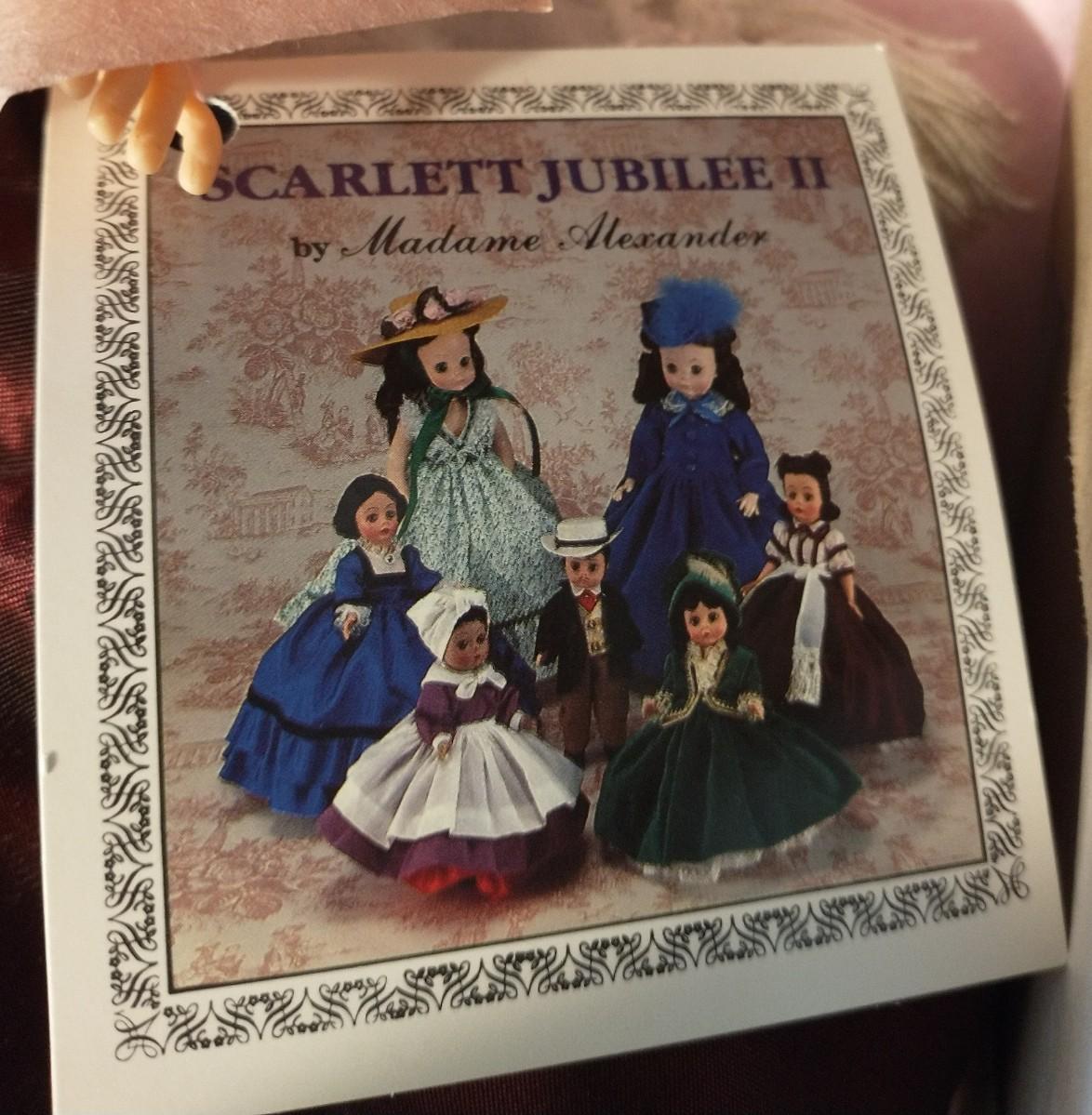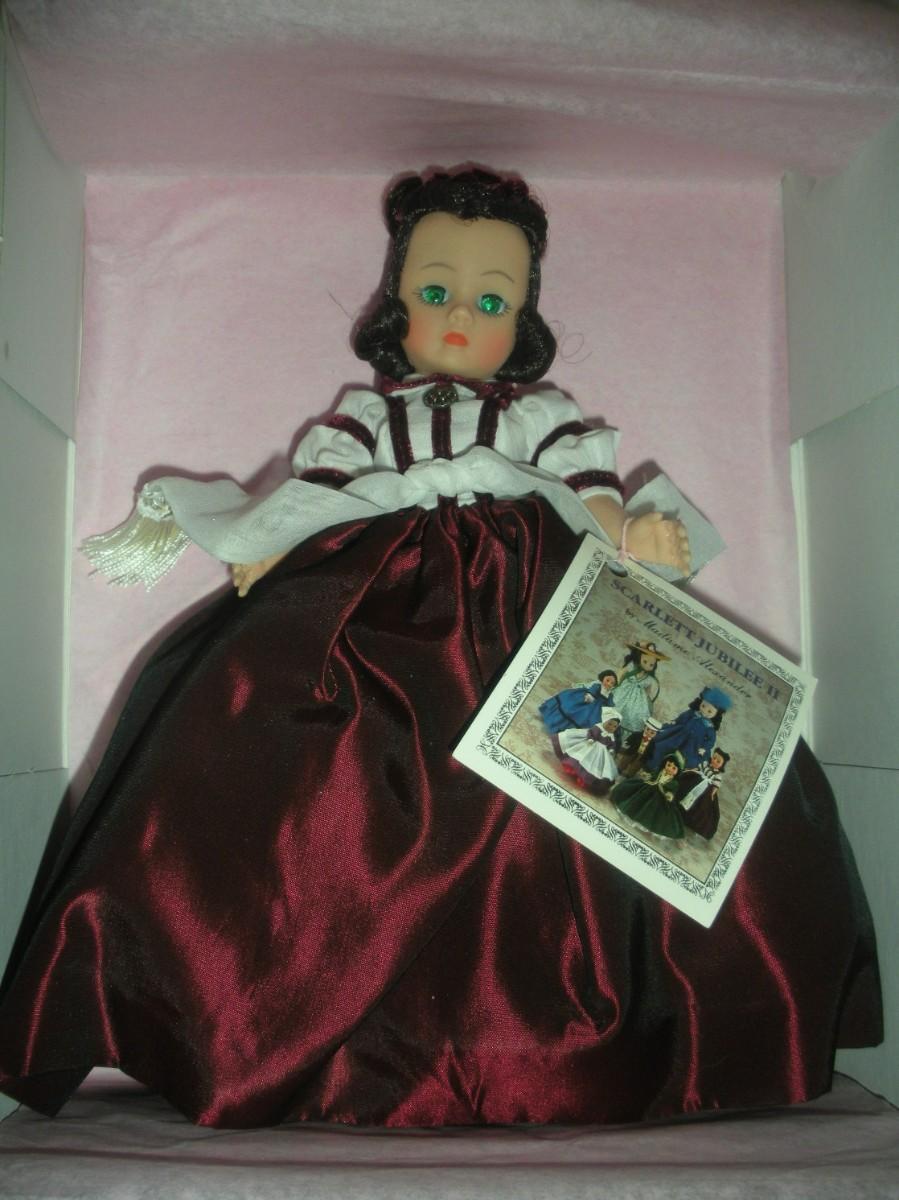 For the Gone with the Wind Collectors. This Scarlett is a 10" Portrette style from 1989. She is mint in the box and is #1100 from the Scarlett Jubilee II Series. Gorgeous burgundy gown. She is in black high heels. Don't pass her up.