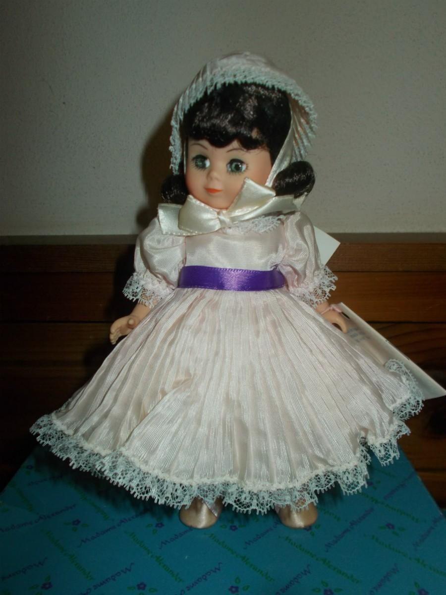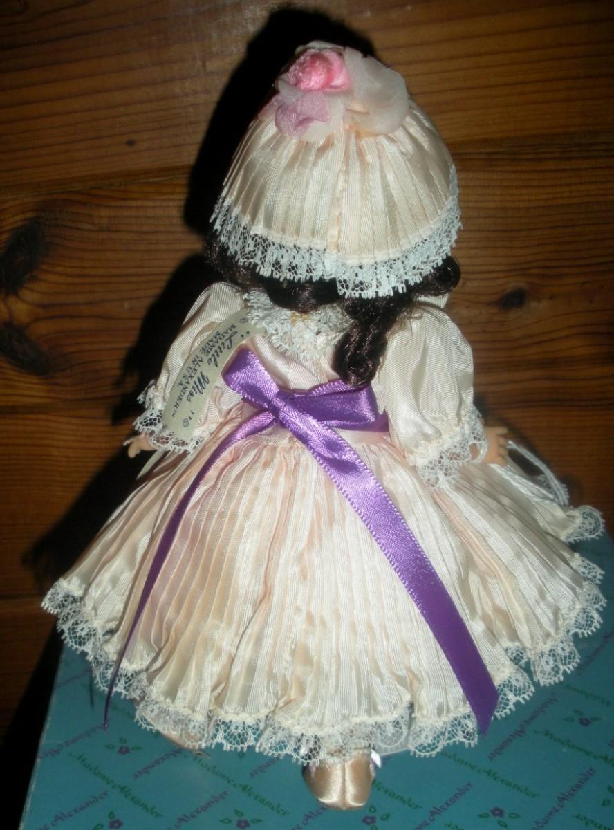 This 8" doll is just exquisite! From her adorable pleated hat to her pleated dress and right down to her pink satin slippers. Mint in her original box. Made in 1989. #489. Don't see this one often. Don't pass her up.