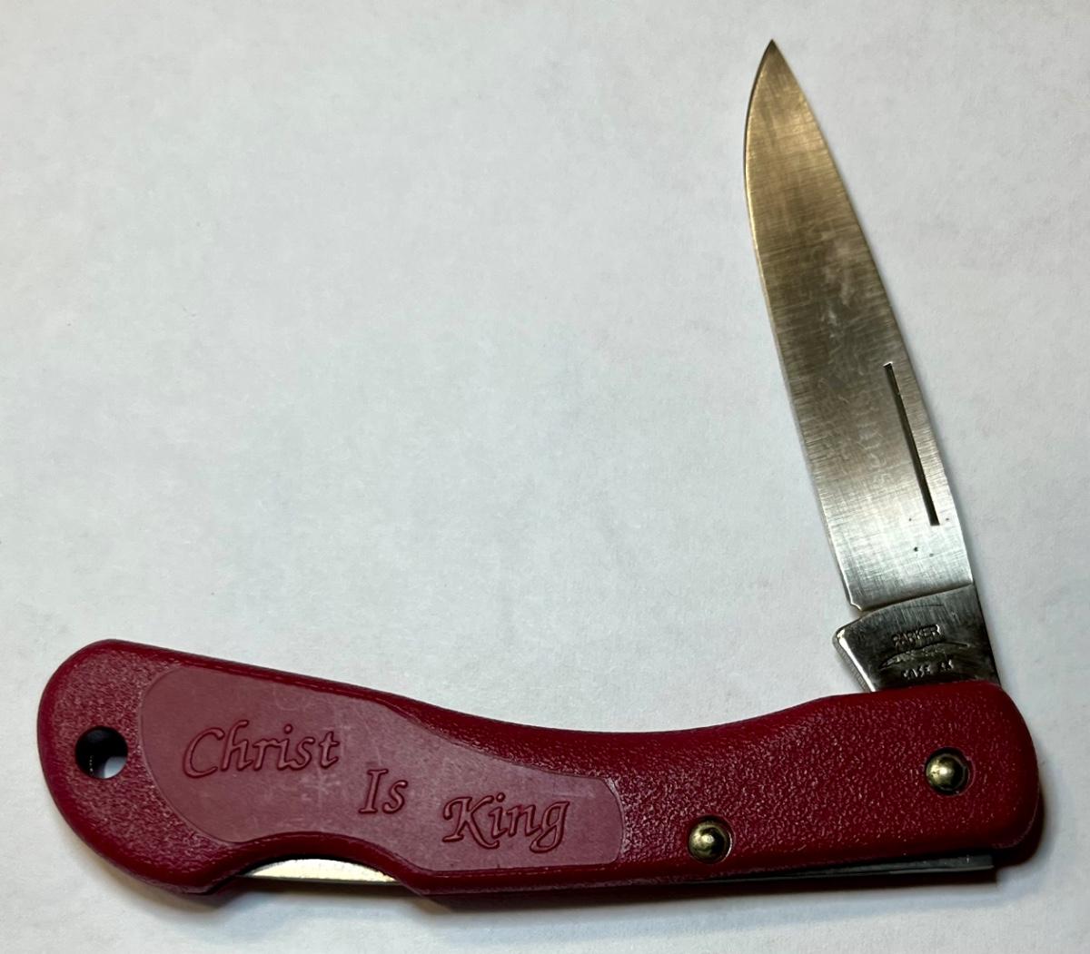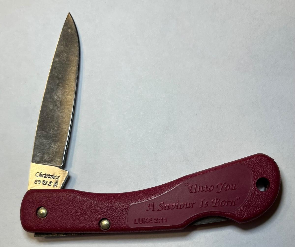 It says “Christ is King” on one side and “Unto you a Savior is born, Luke 3:11 “ Christmas 1989 on one of the blades. 3" long.