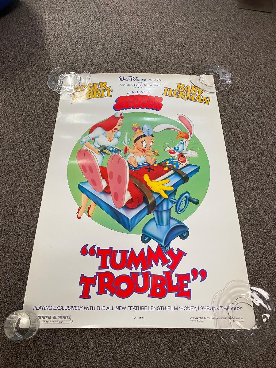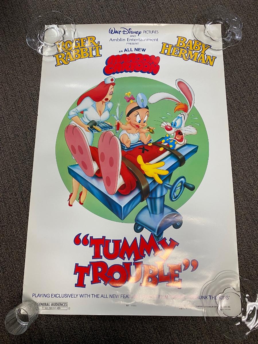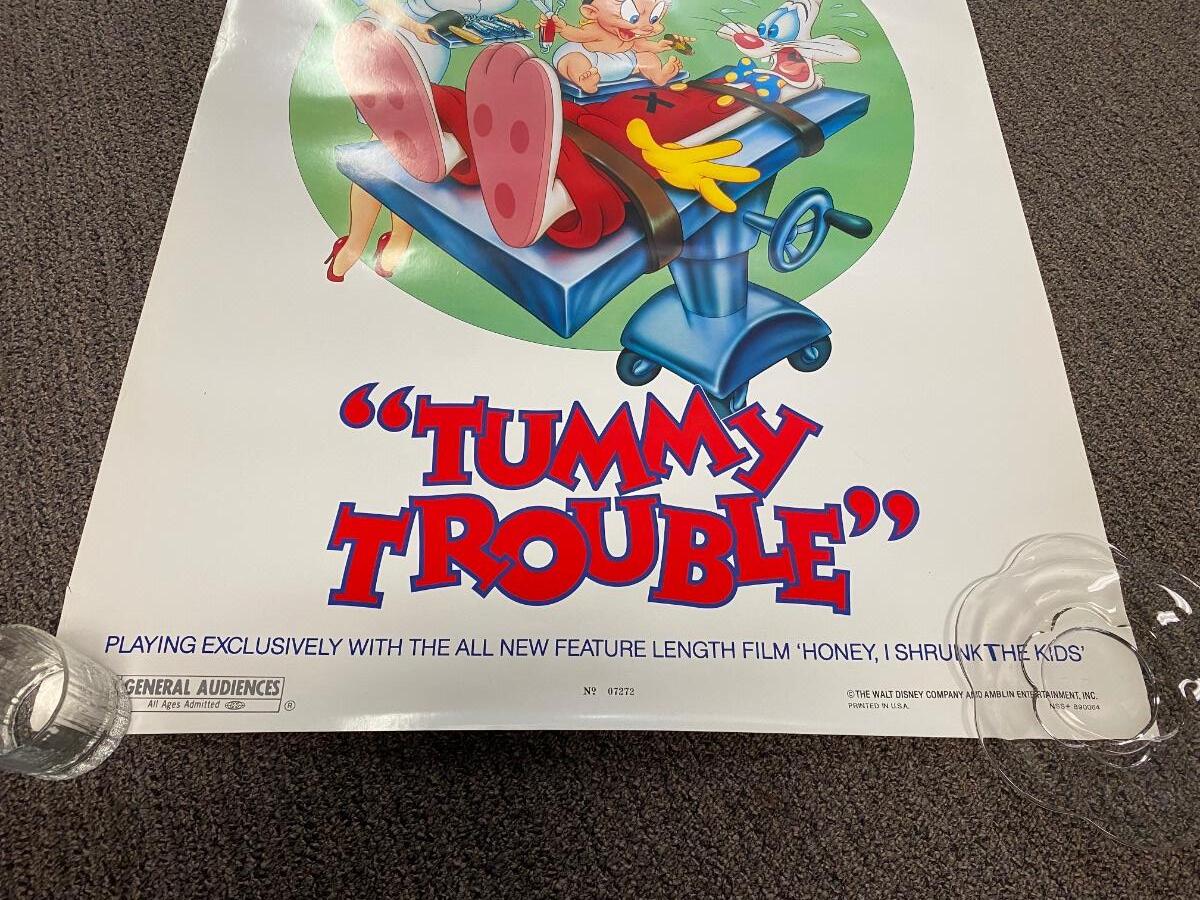 1989 Walt Disney movie short "Tummy Trouble" featuring Roger Rabbit one sheet movie poster. In good condition. 41"x27" size. Light wear along poster edge.