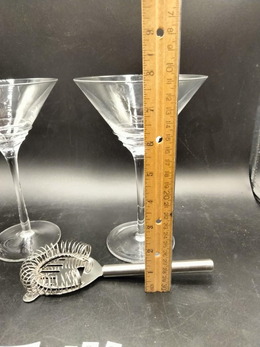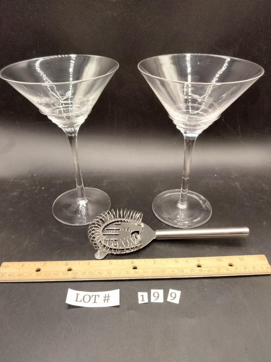 199 - Pair handblown martini glasses and strainer