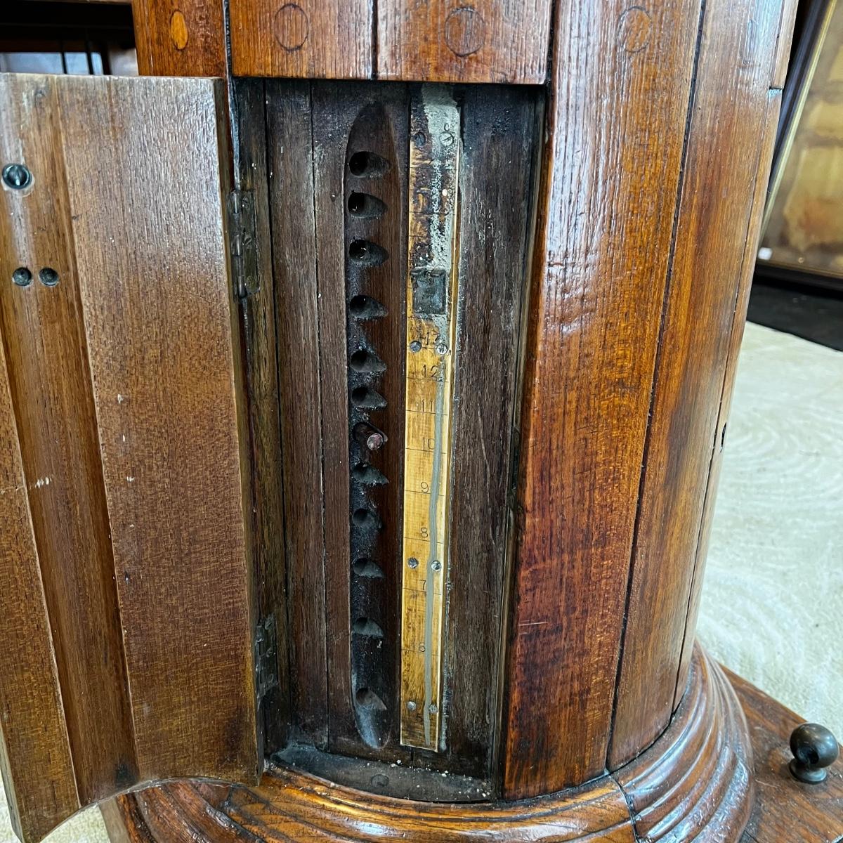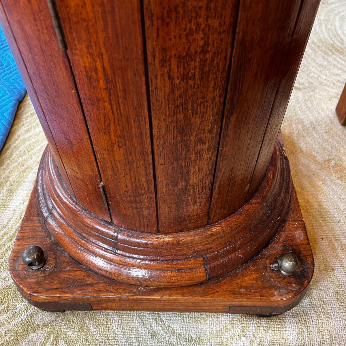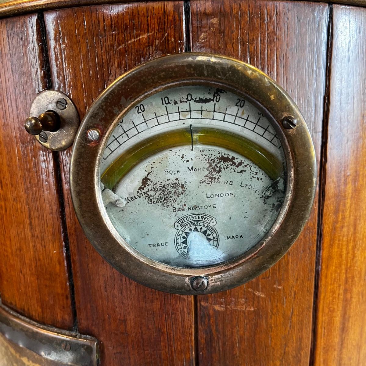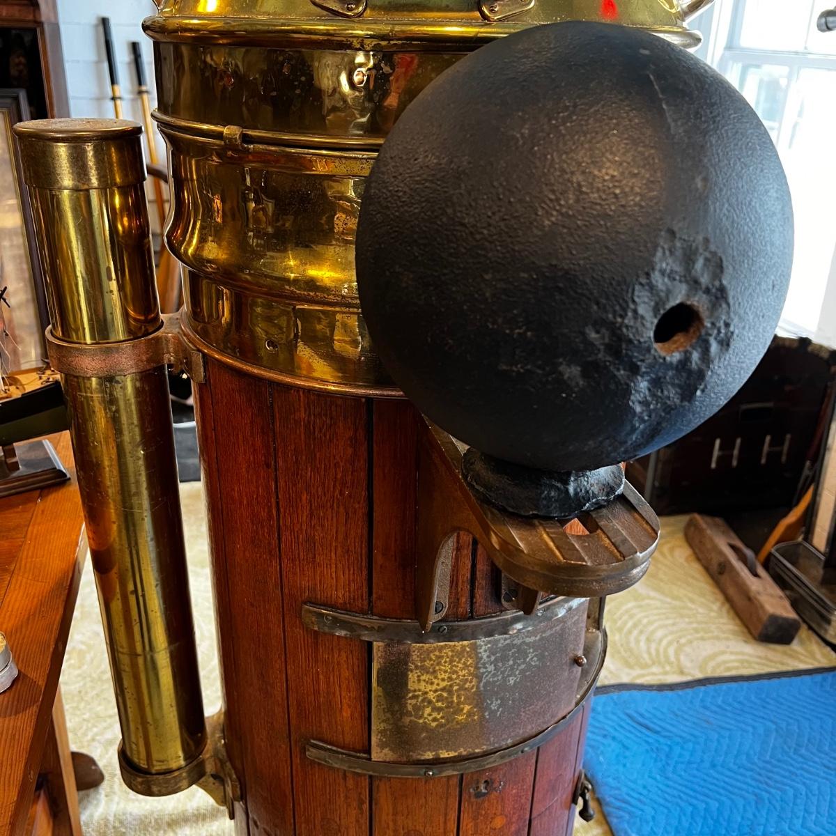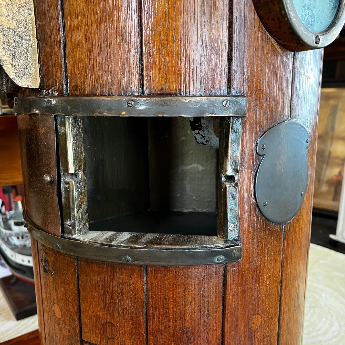Early 20th c. British Made Floor Standing Ship's Binnacle, in a teak cylindrical case, with gimbal mounted compass by Kelvin & Hughes Ltd., side mounted brass inclinometer by Kelvin Bottomley & Baird.
