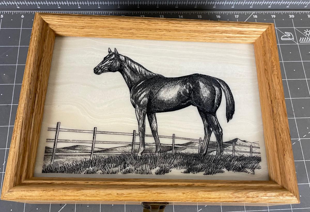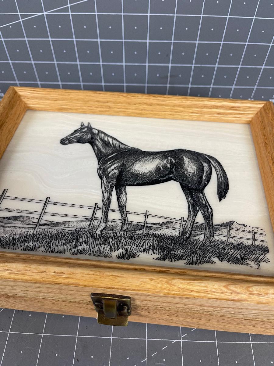 #199 Hand Crafted Golden Oak Box with Etching of a Horse
