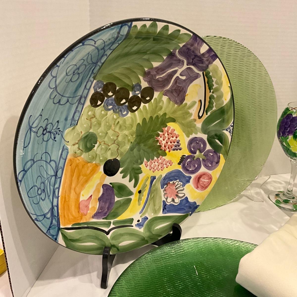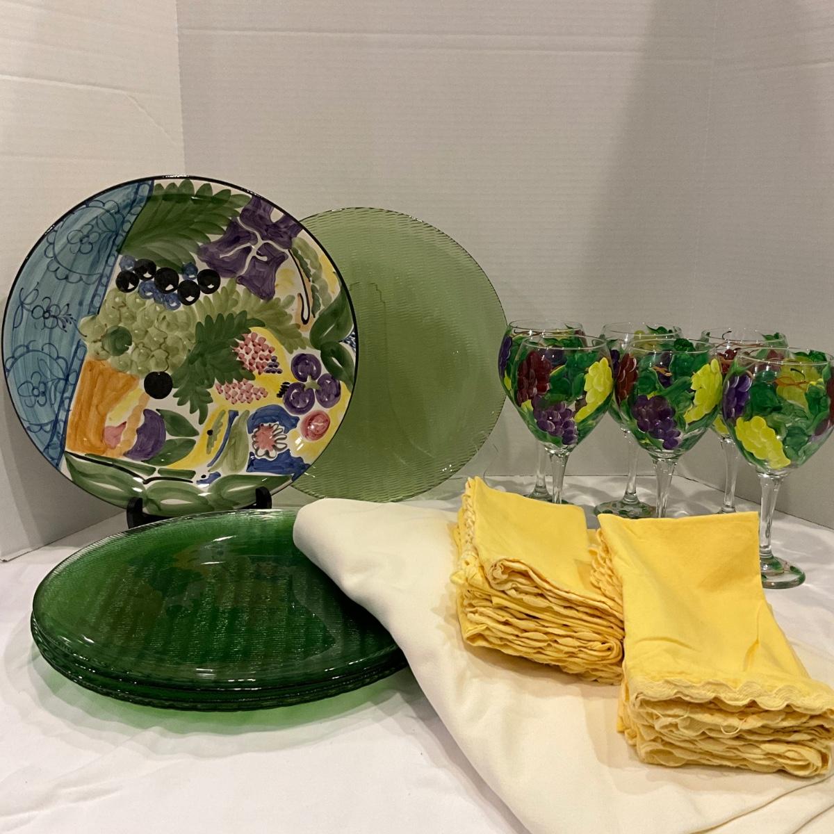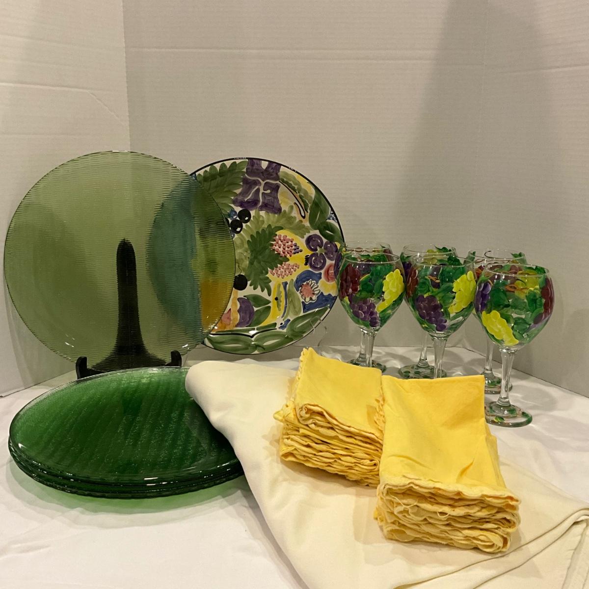 199 Set of 8 Painted Glass Goblets, Portugal Plate and Green Glass Chargers