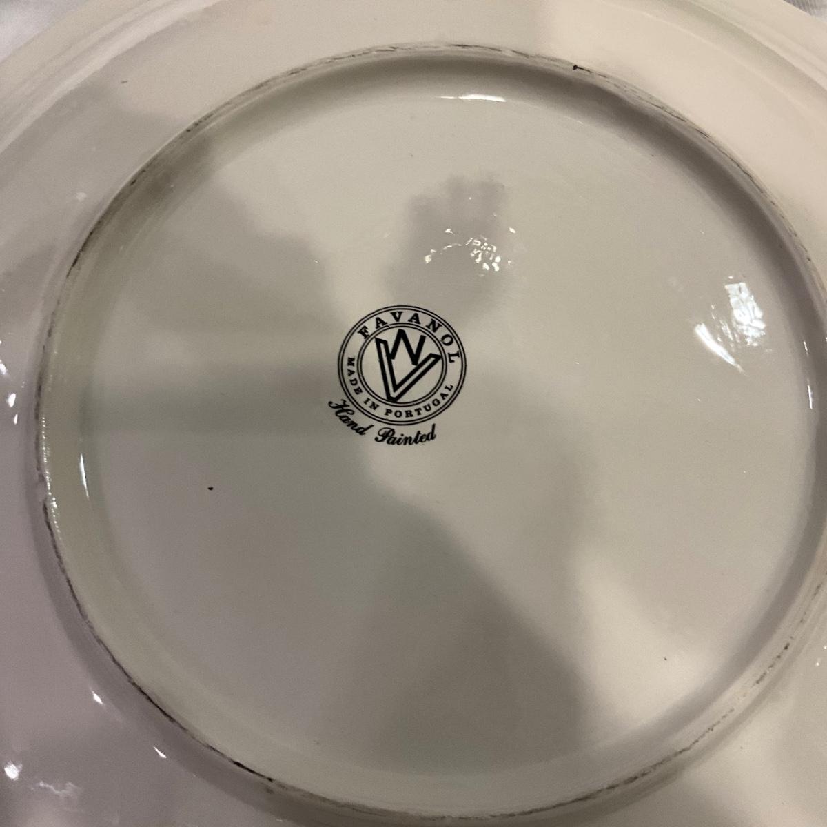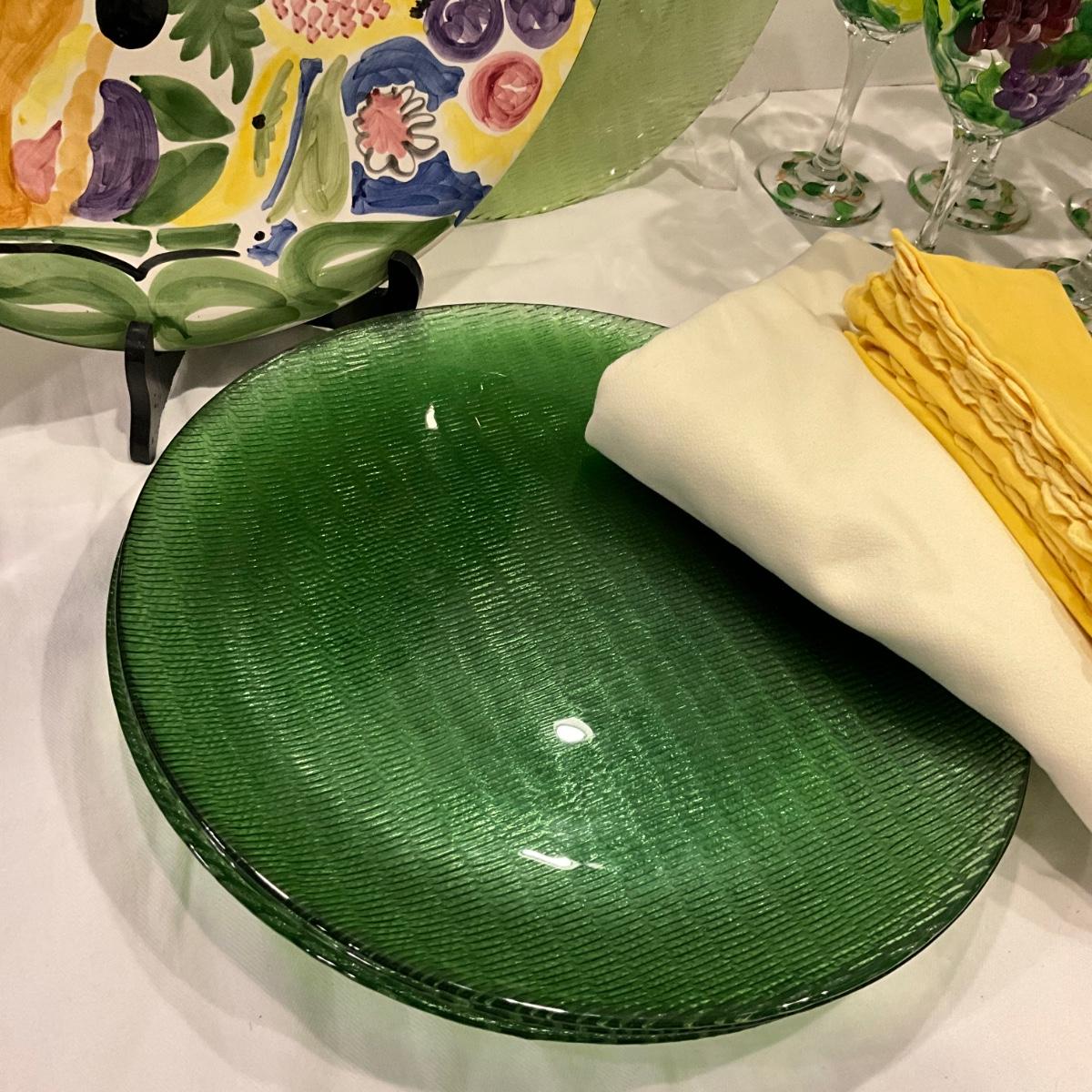 Green glass chargers measures 13.25" diameter , portugal plate 13.25" wit 8 painted goblets