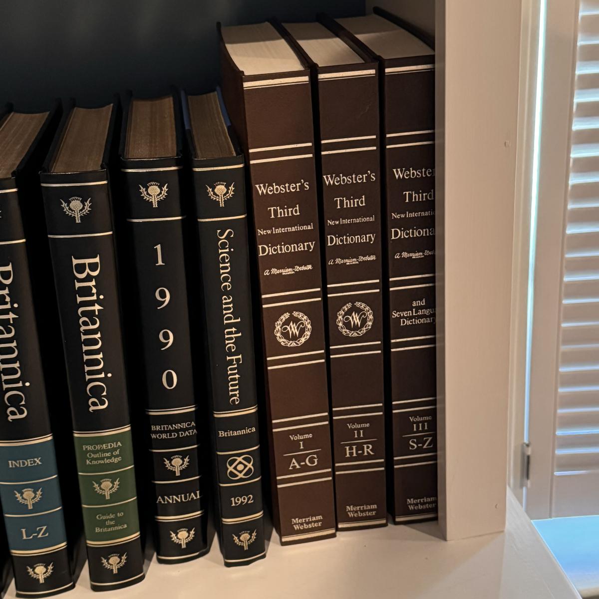Encyclopedia Britannica classic volumes from 1990. Included are volumes 1-29, along with the 1990 Annual and Science and the Future from 1992. There is a three volume set of Webster's Third Dictionaries A-Z.