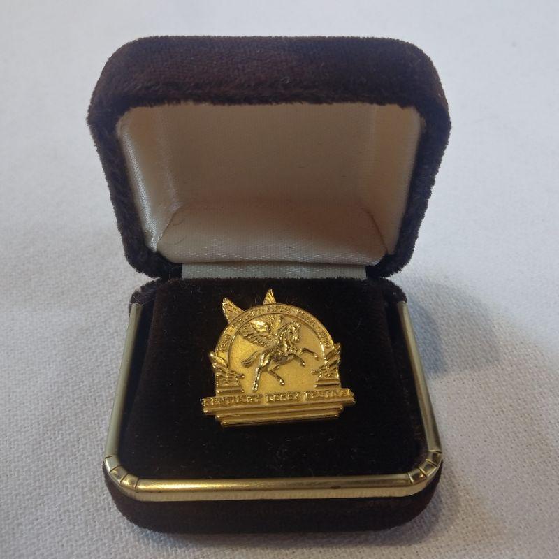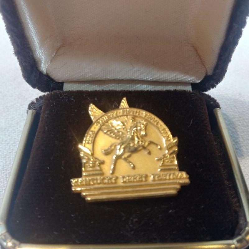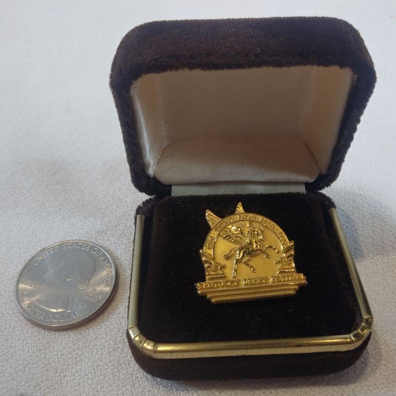1990 Kentucky Derby Festival Metal Gold Pin. Comes in a nice velvet and gold-trimmed box. Limited Edition marked number 468 of 500. Dated 1990. Marked 1/20-12K. Reserve Price $15.