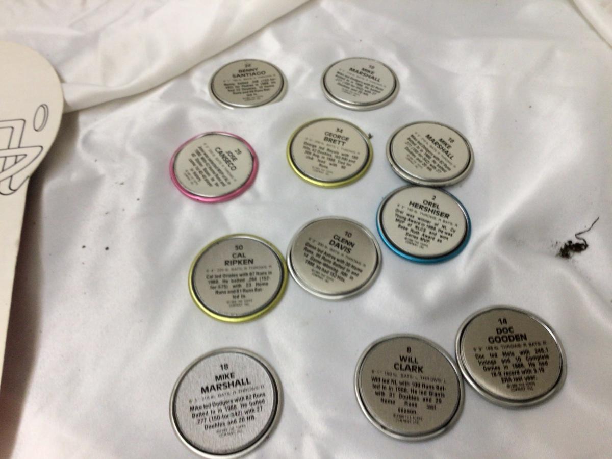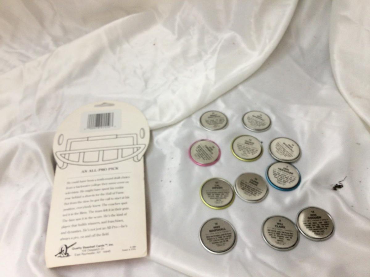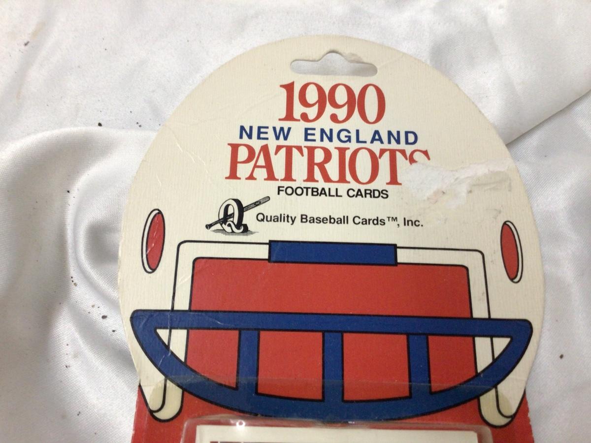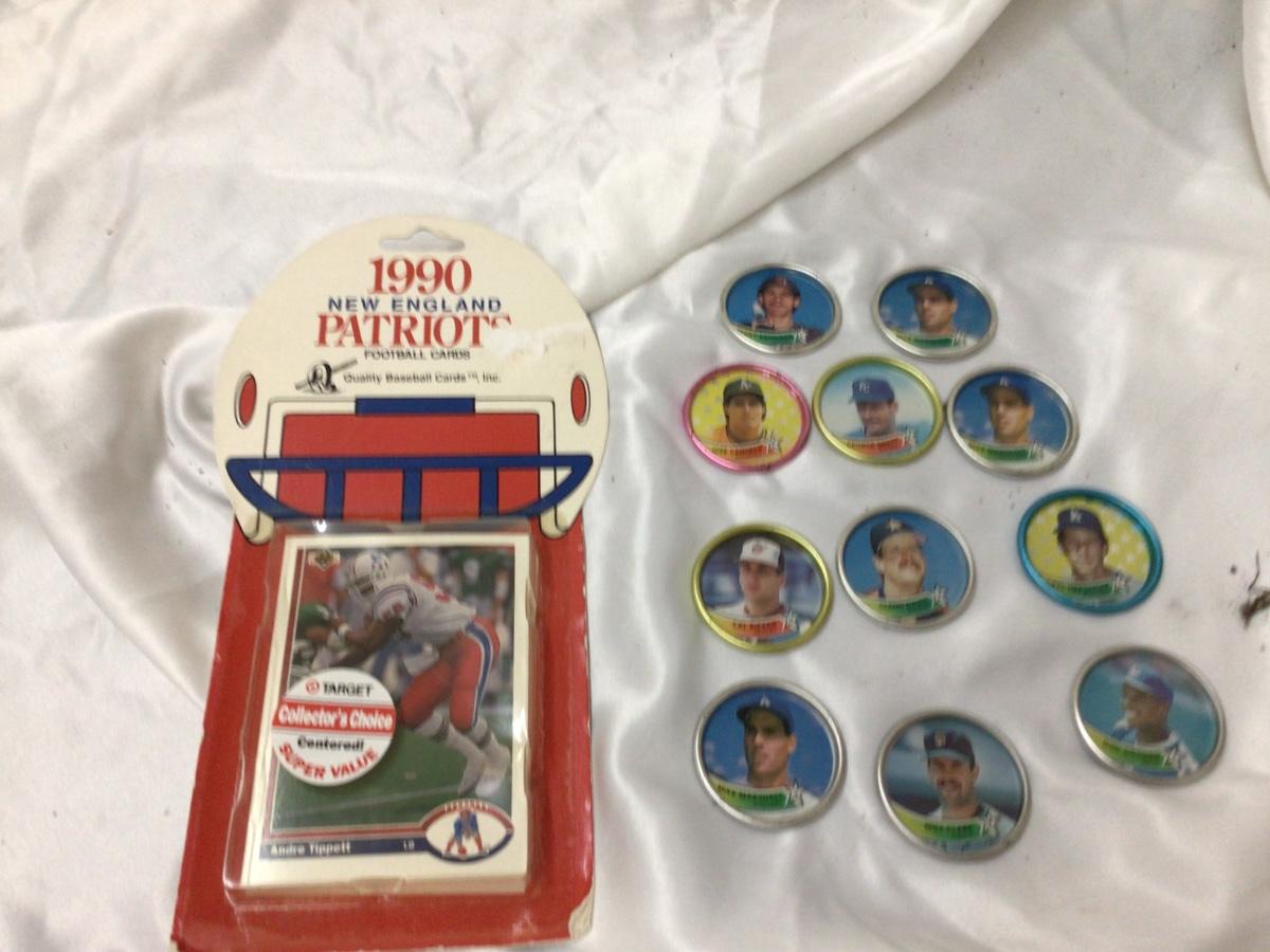 You get the New England Patriots 1990 Team Football cards new in packaging. Great metal baseball collectible disks.