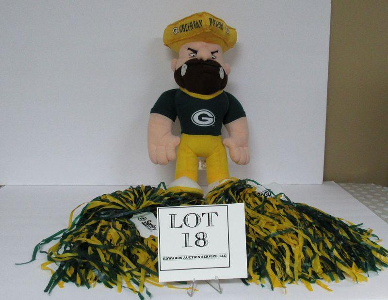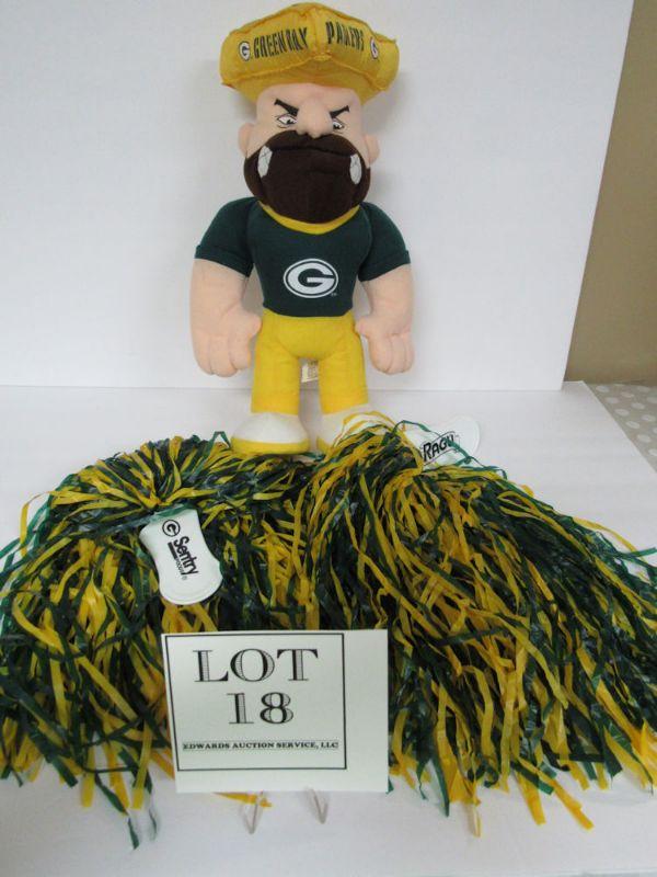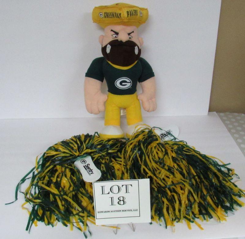 1990s GB Packers Plush Guy and Set of 2 Advertising PomPoms