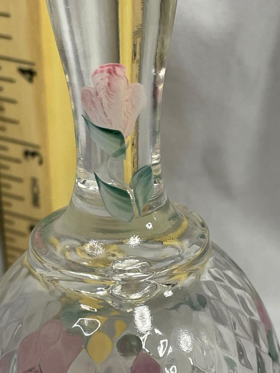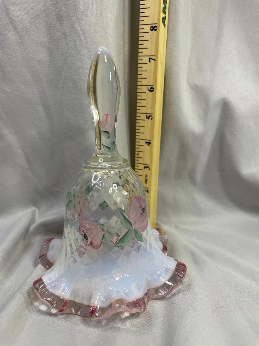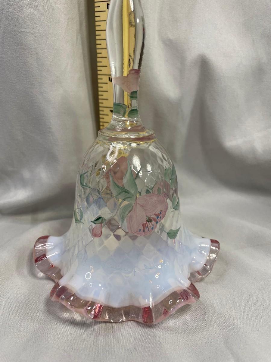 The only issue with this bell is that the clanger is missing - otherwise it is in excellent condition. The lower, inside portion of the bell indicates that it was hand painted by D. Wright (Diana Wright).  Diana Wright painted for Fenton between 1995-1997.<br />