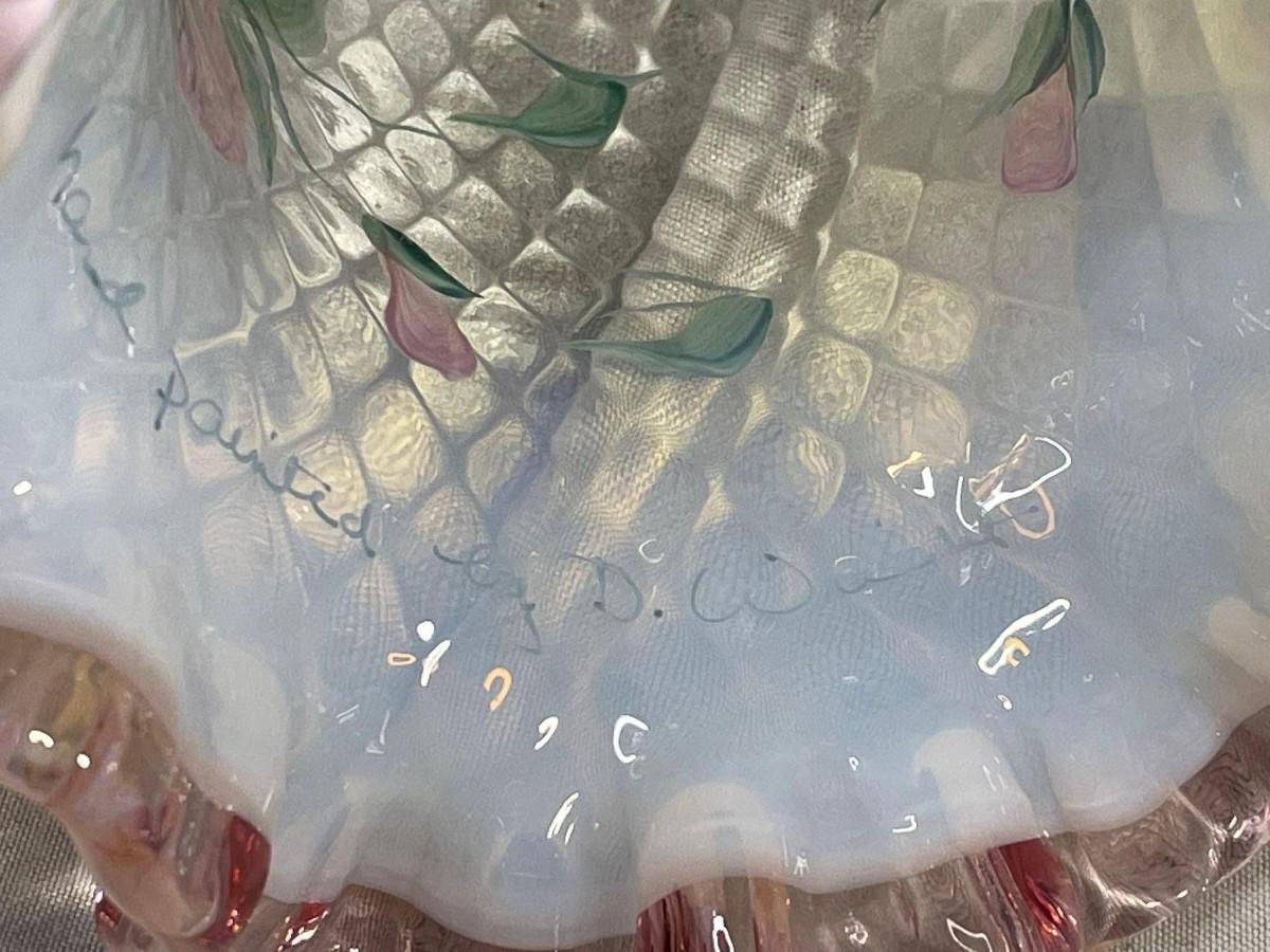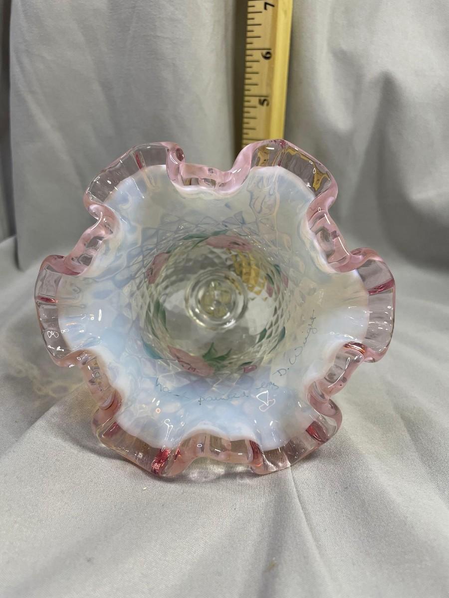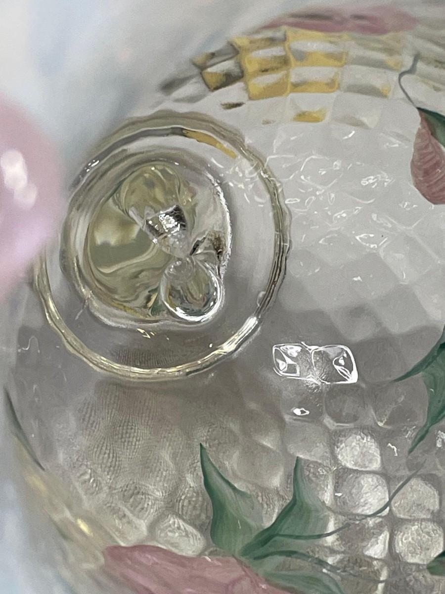 The only issue with this bell is that the clanger is missing - otherwise it is in excellent condition. The lower, inside portion of the bell indicates that it was hand painted by D. Wright (Diana Wright).  Diana Wright painted for Fenton between 1995-1997.<br />