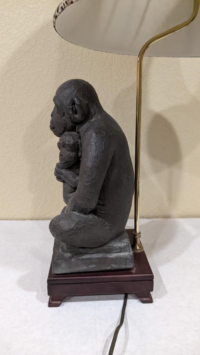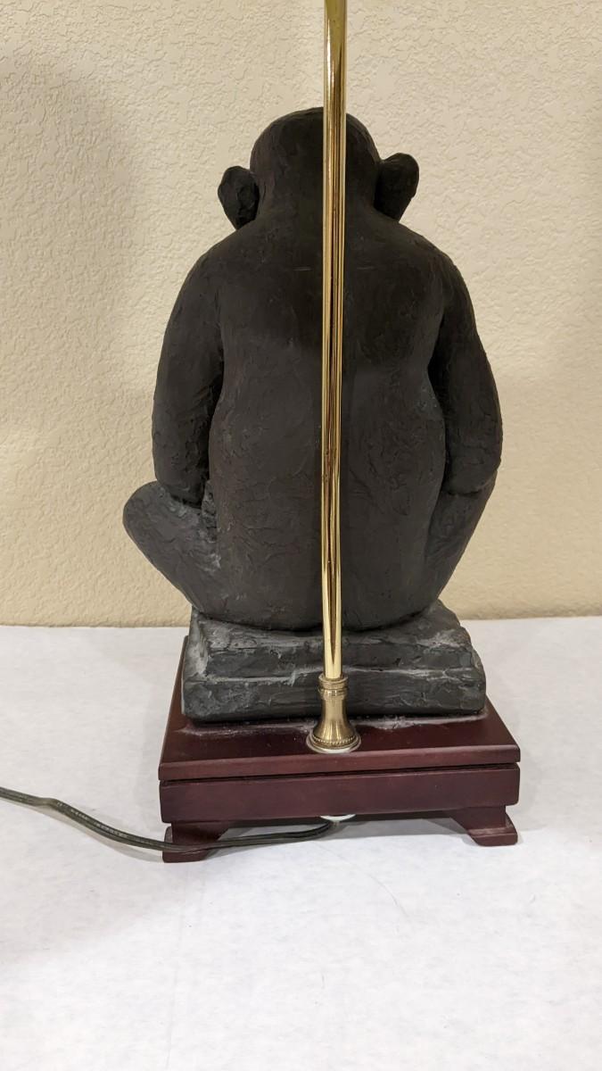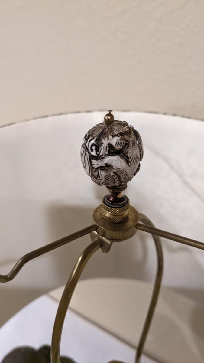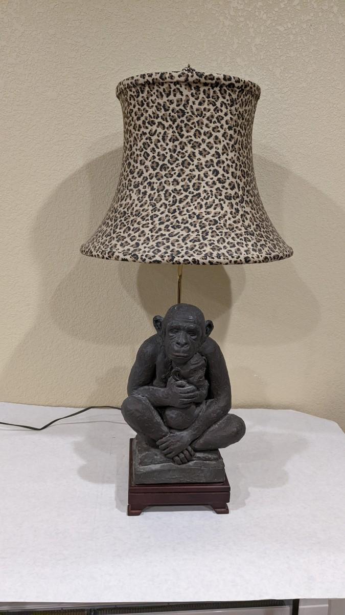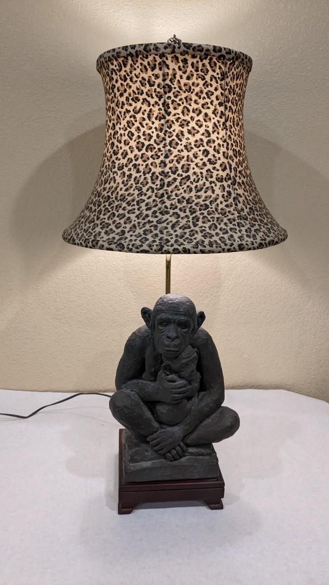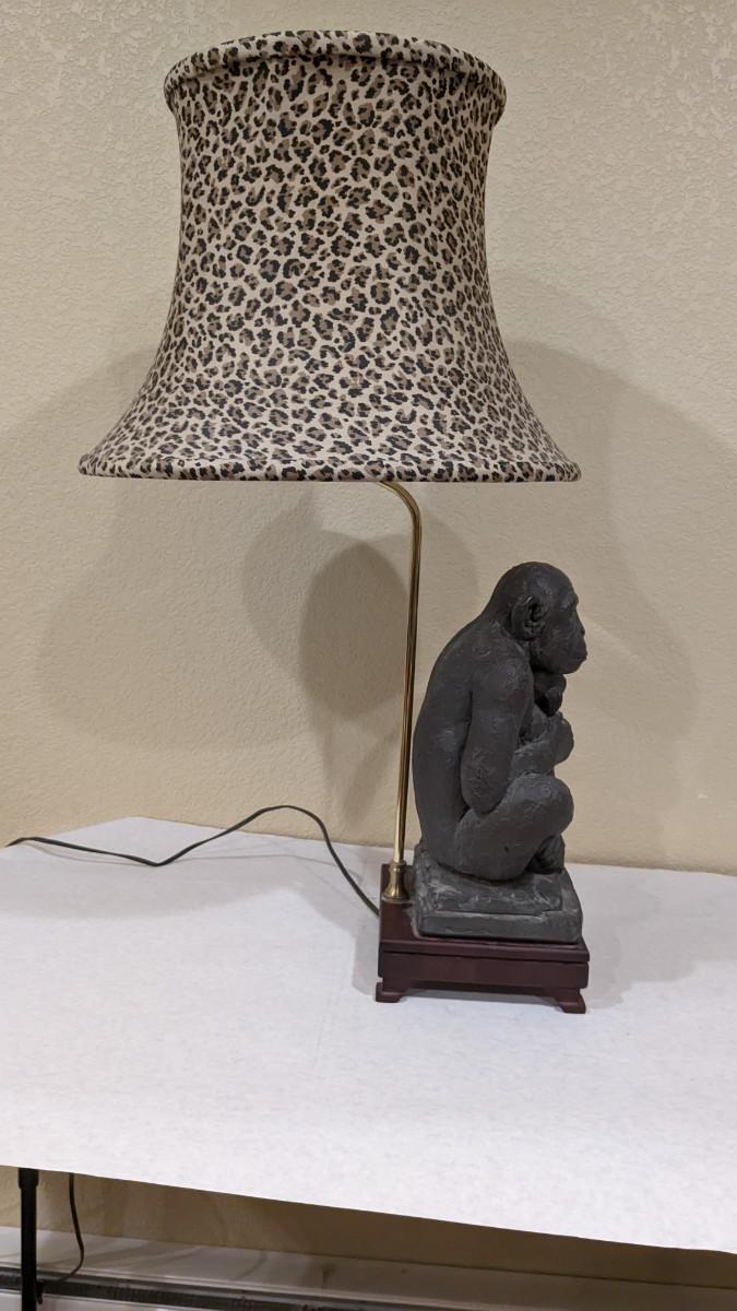 a beautiful 31" table lamp with lovely oiled bronze look. 7"x 7" wood base with animal print lampshade that does show wear. Brass arm with added carved finial. brass accents, in excellent operable condition.