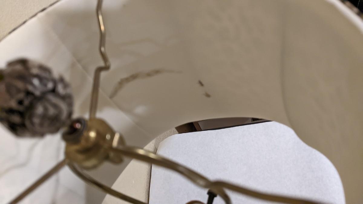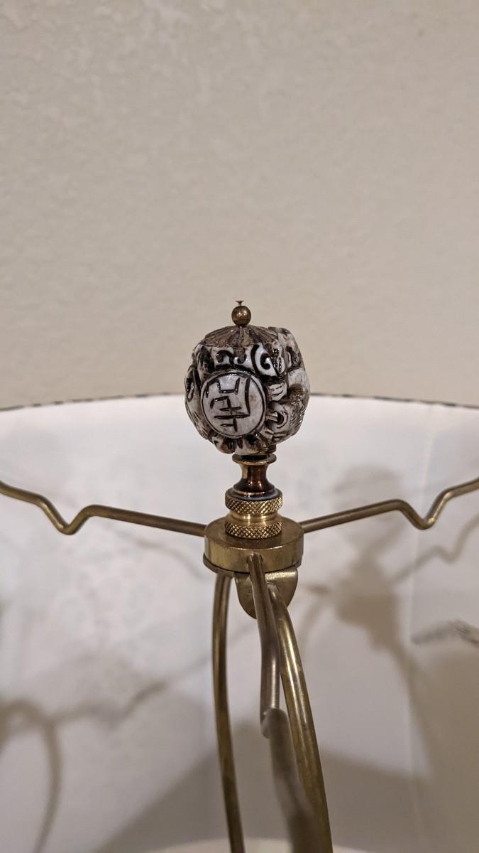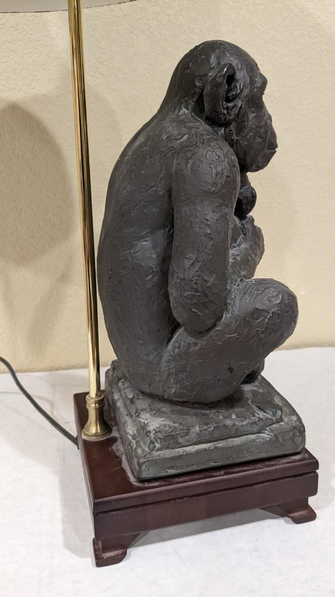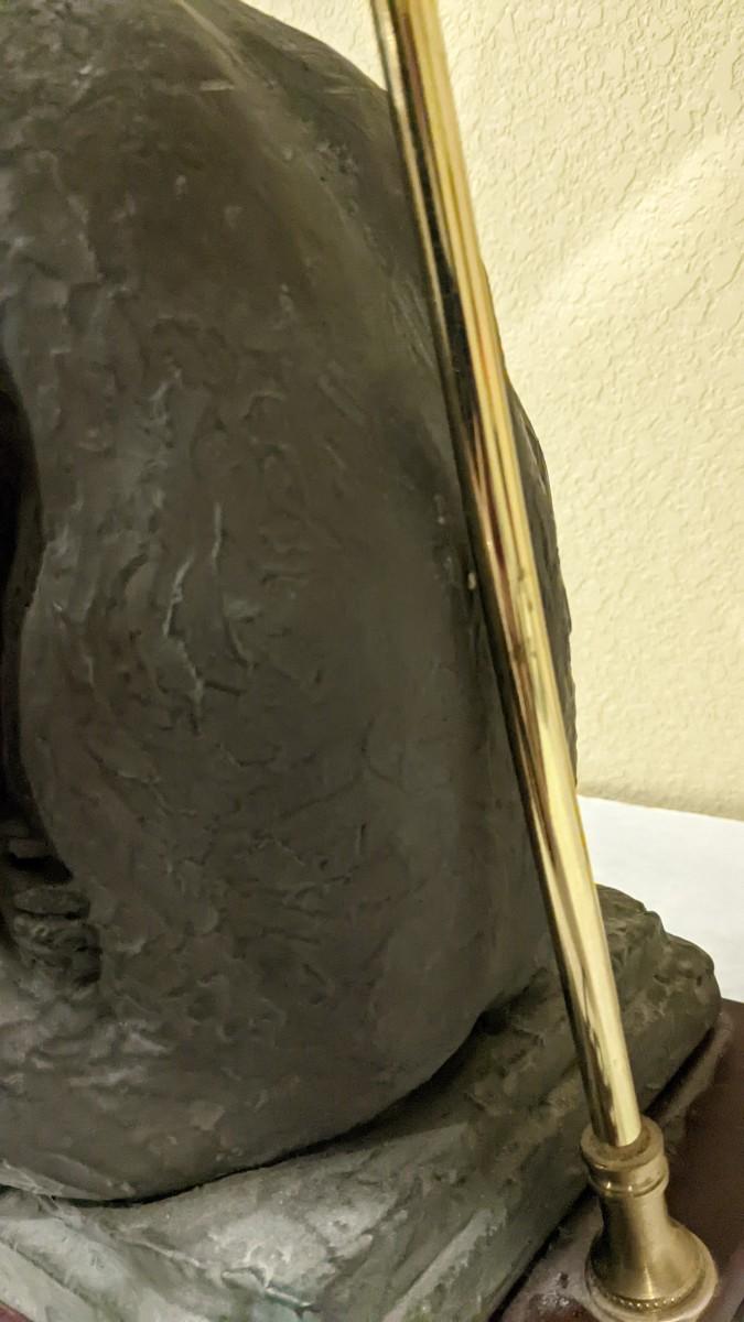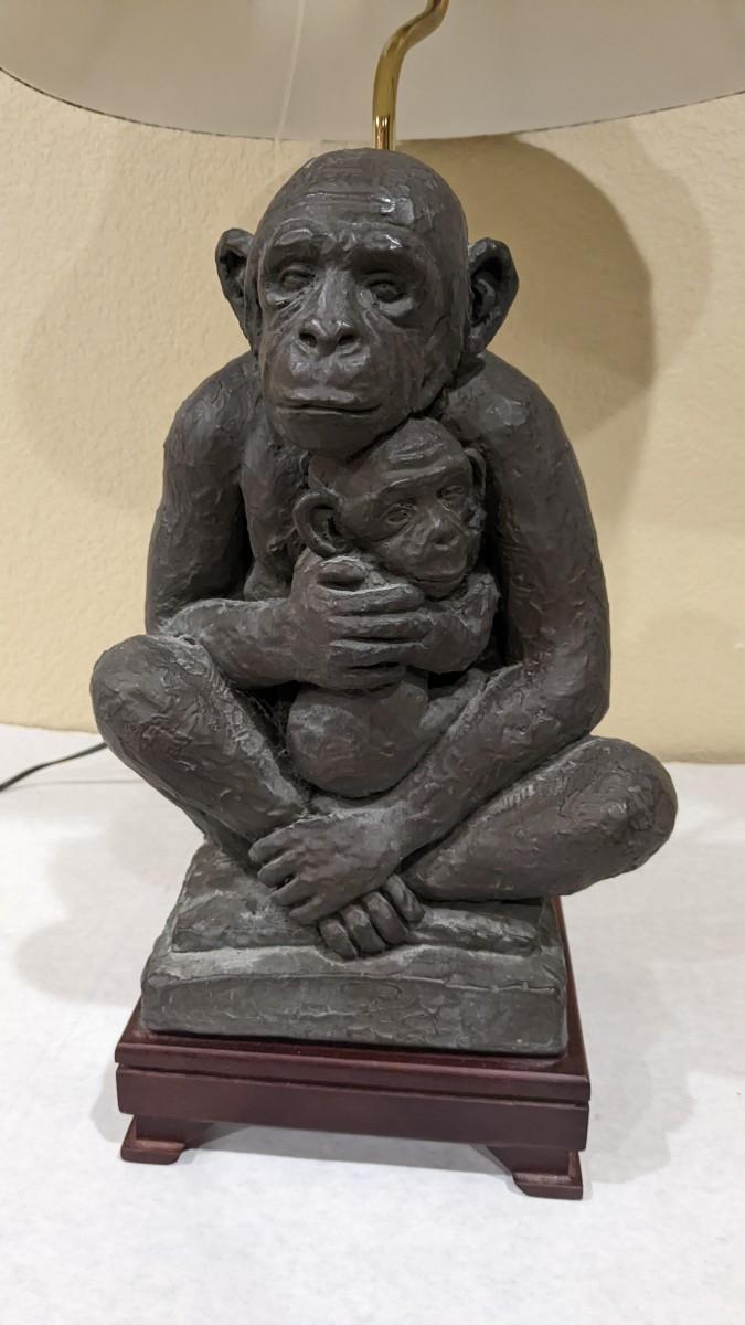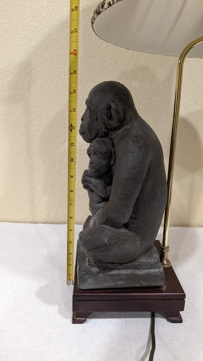 a beautiful 31" table lamp with lovely oiled bronze look. 7"x 7" wood base with animal print lampshade that does show wear. Brass arm with added carved finial. brass accents, in excellent operable condition.
