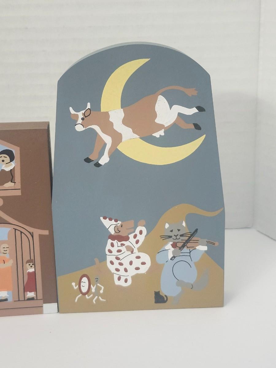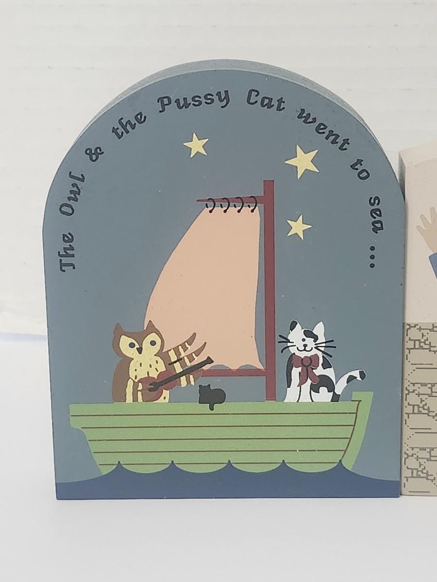 Set of four 1990s The Cat's Meow wood collectibles featuring classic nursery rhymes. Scenes include The Owl & The Pussycat Humpty Dumpty Old Woman Who Lived in a Shoe and Cow Jumping Over the Moon. Painted wood with whimsical detail. Great shelf display pieces for collectors of Cat’s Meow Village.