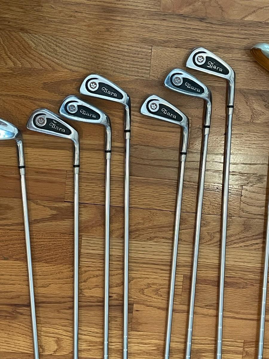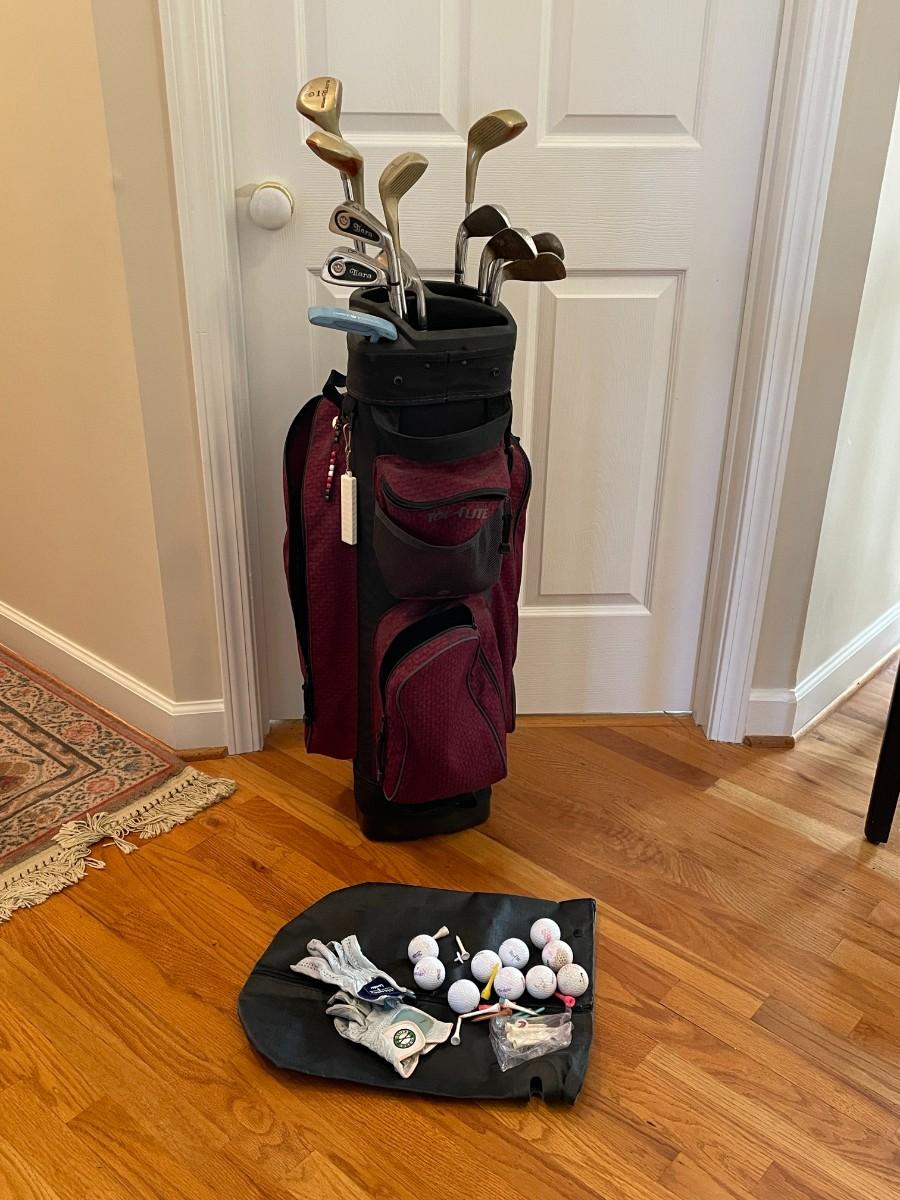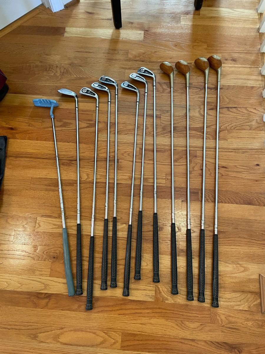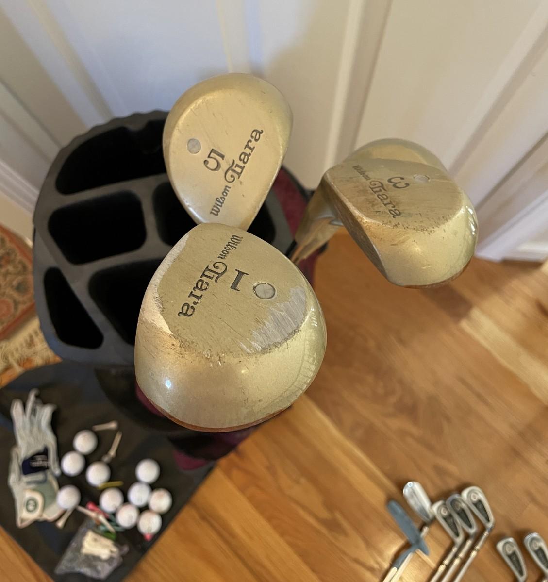 The golf clubs are early 1990s and the golf bag was late 1990s. The consignor hardly used the set. This set includes irons 4-9, woods 1,3,5,7, dual wedge, and a Knight Crown Princess putter. There are also 2 gloves, and tees, balls, bag cover, golf abacus ball marker, and a barely used Top Flite bag with a five way divider. Great starter set. LOCAL PICK UP ONLY.