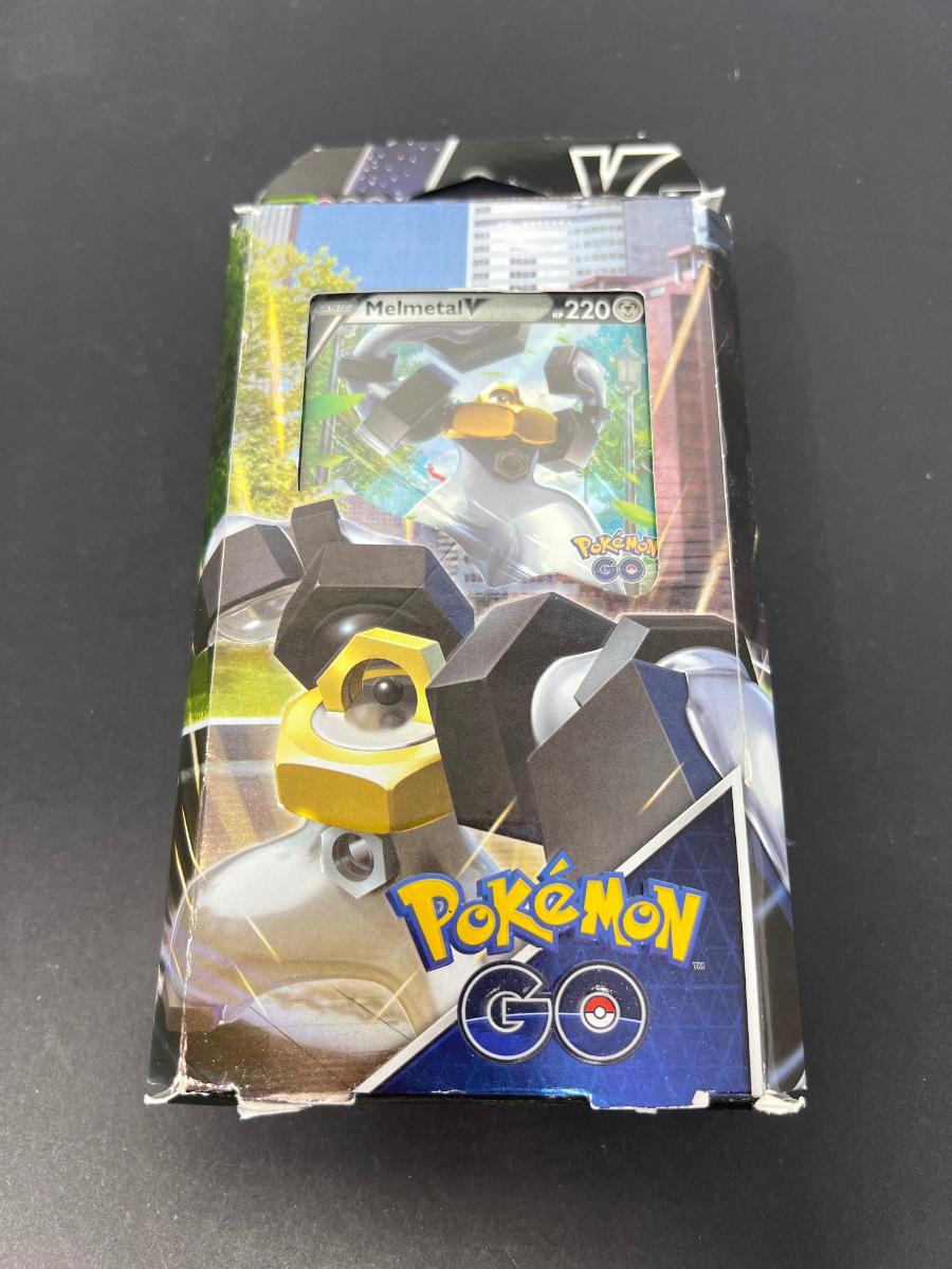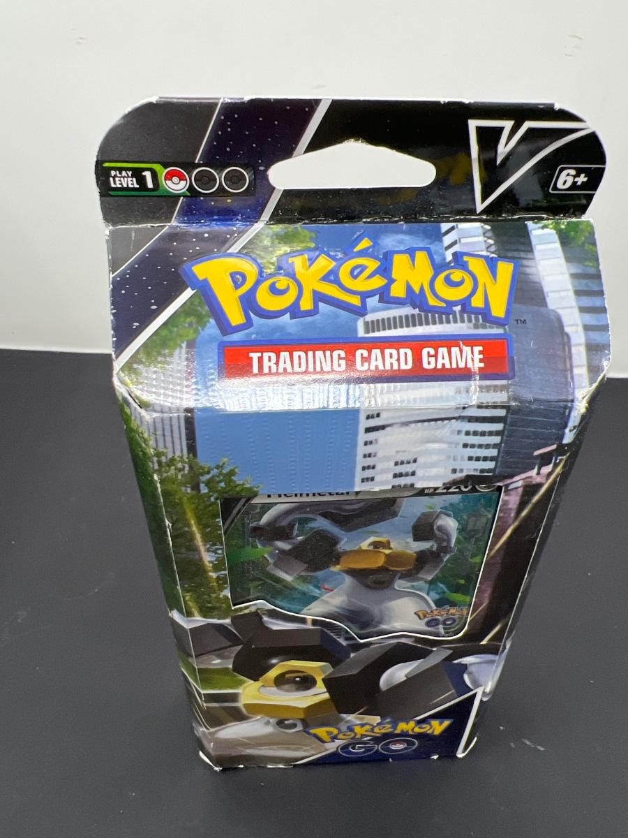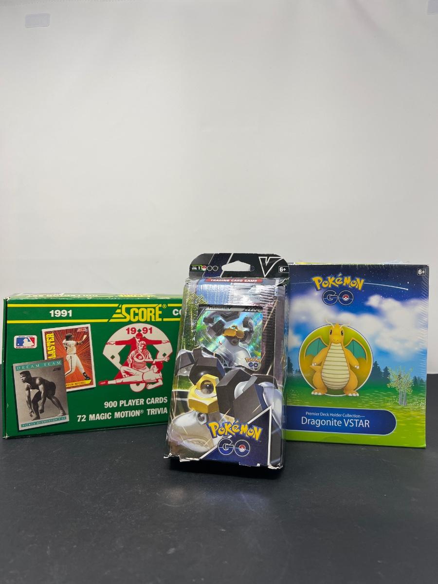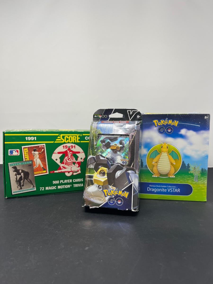 Pokémon Go Trading Card Game Cards never opened box; V Battle Deck of Pokemon Cards that have never been opened, and an opened 1991 box of Score baseball collector cards but appears there are Topps and other brand cards, as well.