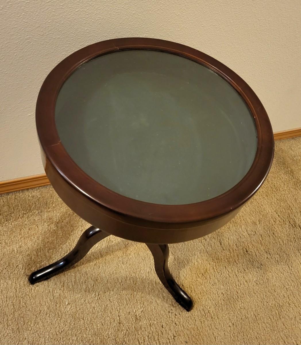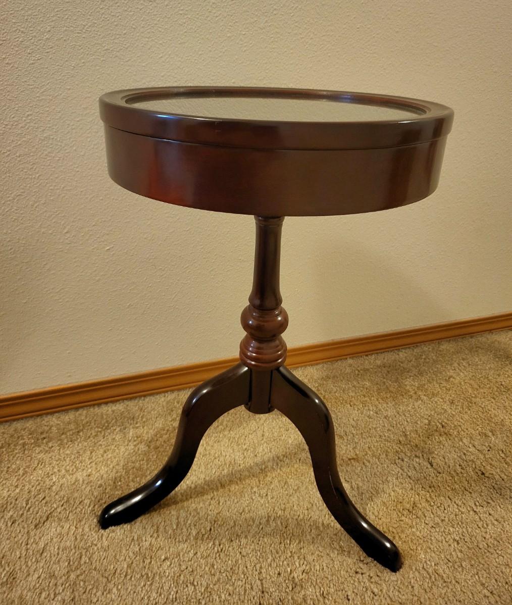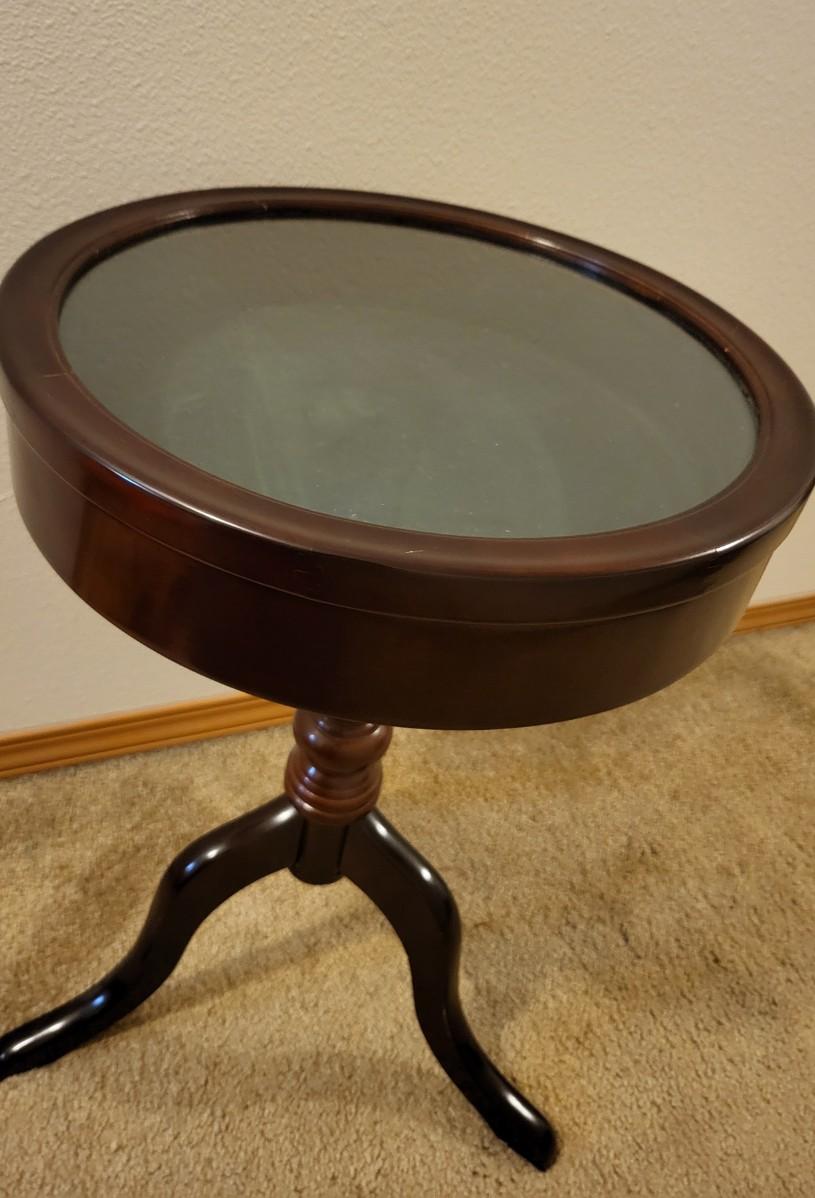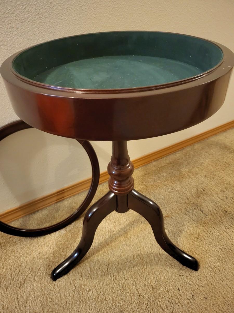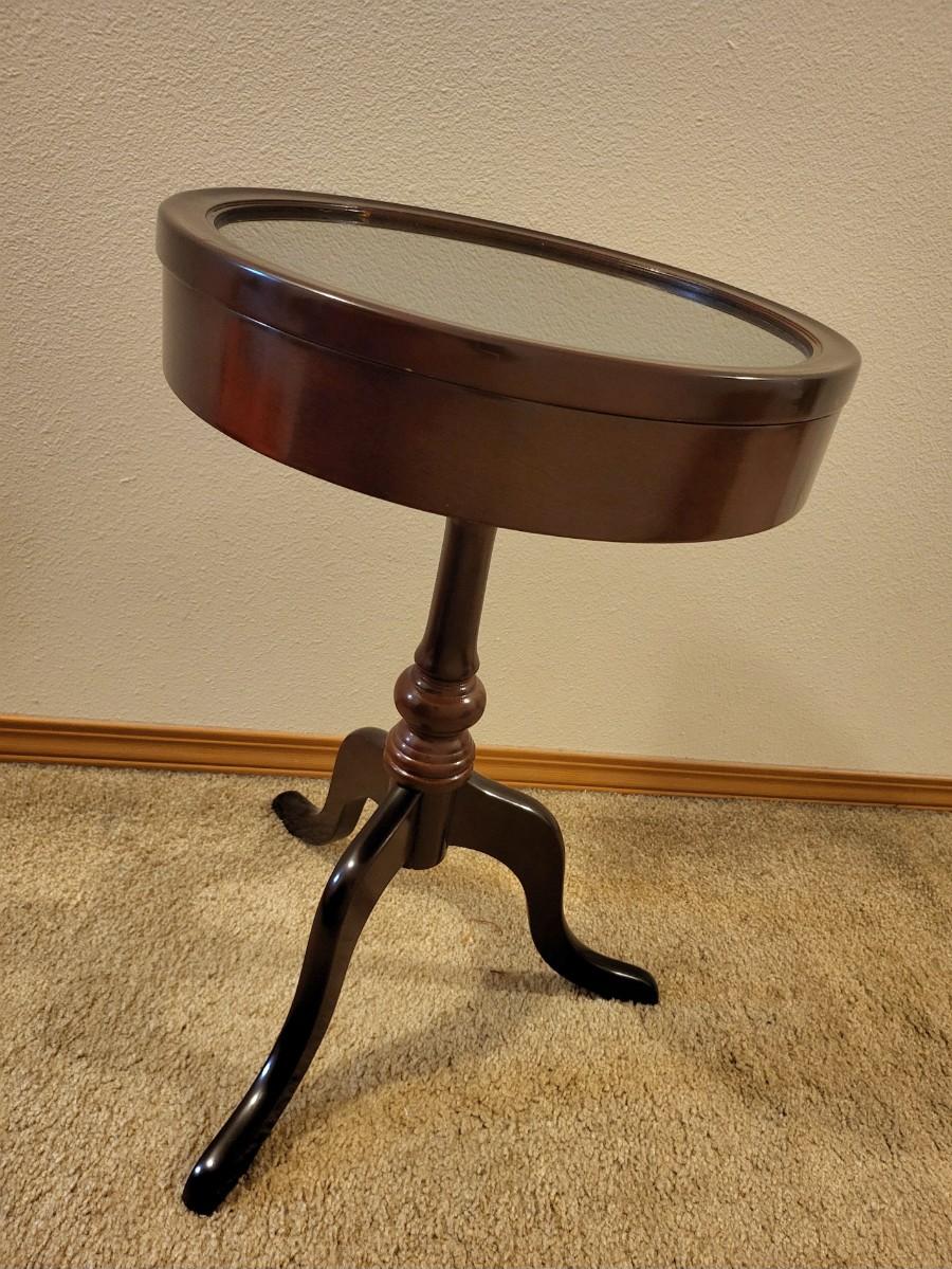 The Bombay Company, 1991. Cherry finish shadowbox side table. Removable glass top, tripod, Queen Ann style curved legs, dark green felt lined display/shadow box top. Measures 23" tall x 14.5" round x 3" deep. Neat table to display jewelry, rocks or your other small collectibles. Shipping not available on this item.